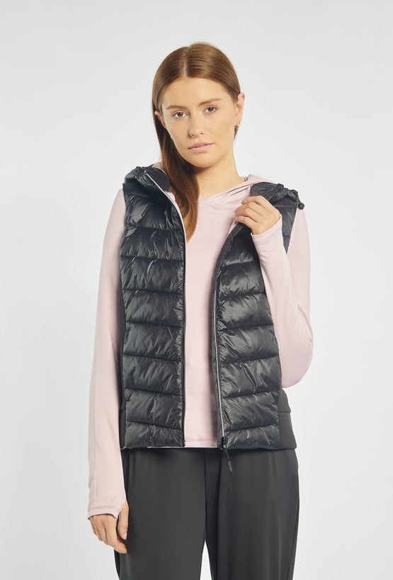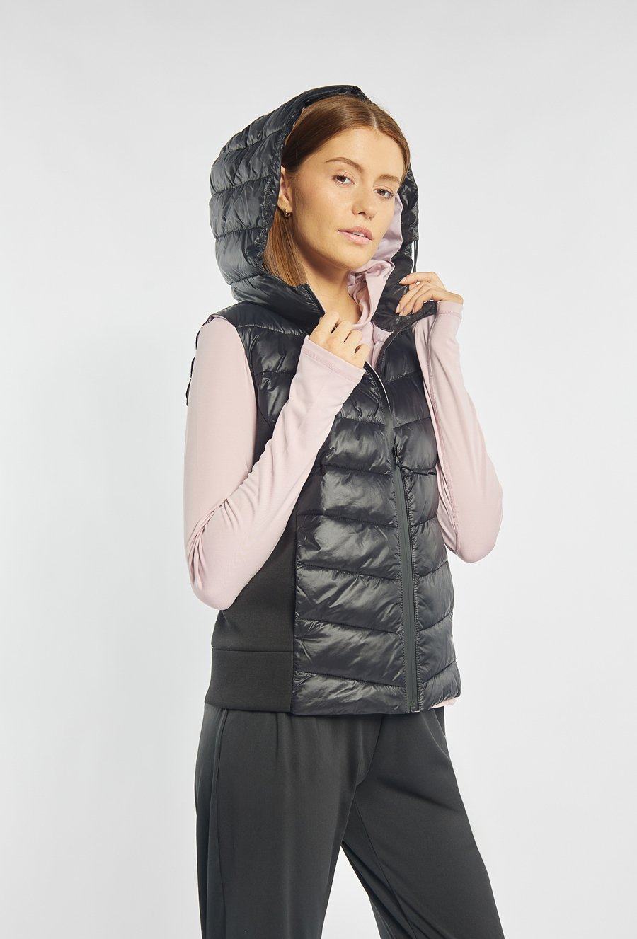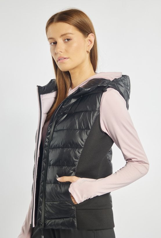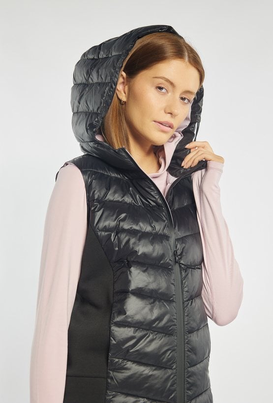 Kamizelka z kolekcji Joy&Relax. Lekka i wygodna, idealna jako dodatkowa warstwa na chłodniejsze dni. Pikowana część frontowa i kaptur nadają jej sportowego charakteru, a elastyczne wstawki po bokach zapewniają swobodę ruchów i komfort noszenia. Doskonale sprawdzi się w codziennych stylizacjach oraz podczas aktywności na świeżym powietrzu. Modelka na zdjęciu ma 177 cm wzrostu i prezentuje rozmiar S.