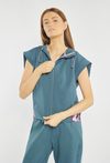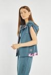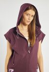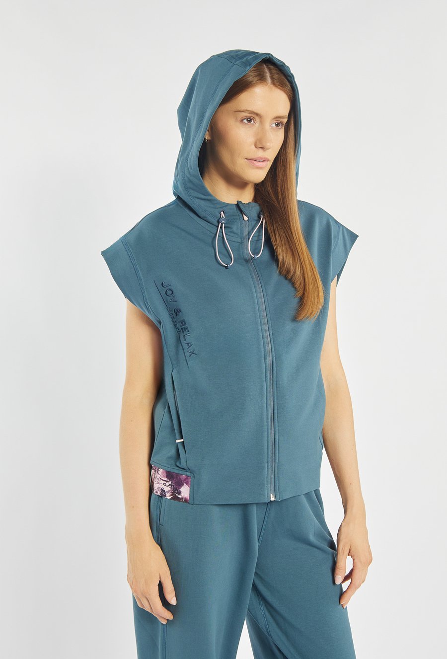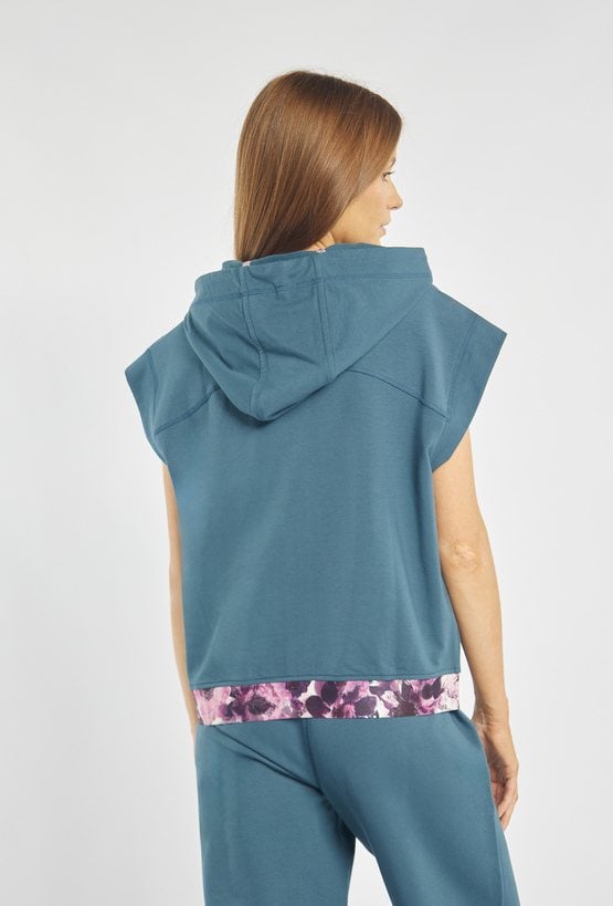 Kamizelka damska sportowa z kolekcji Joy&Relax. Model na suwak, z kapturem i krótkim rękawem. Dół wykończony szeroką gumką z kontrastowym kwiatowym motywem, który nadaje całości oryginalnego charakteru. Wygodna i praktyczna propozycja, idealna do sportowych oraz casualowych stylizacji. Modelka na zdjęciu ma 177 cm wzrostu i prezentuje rozmiar S.