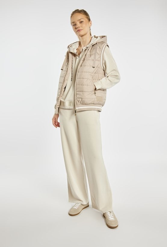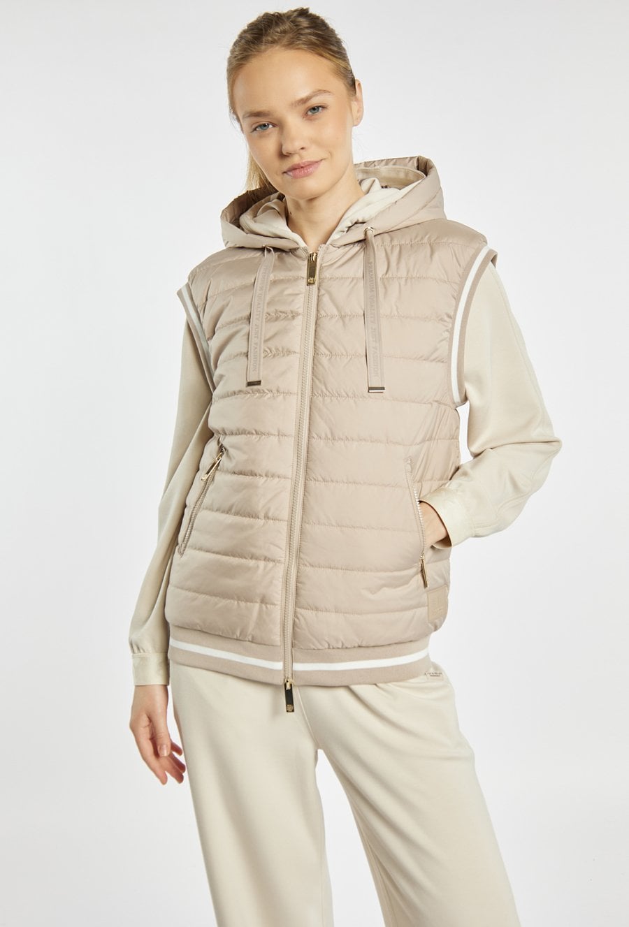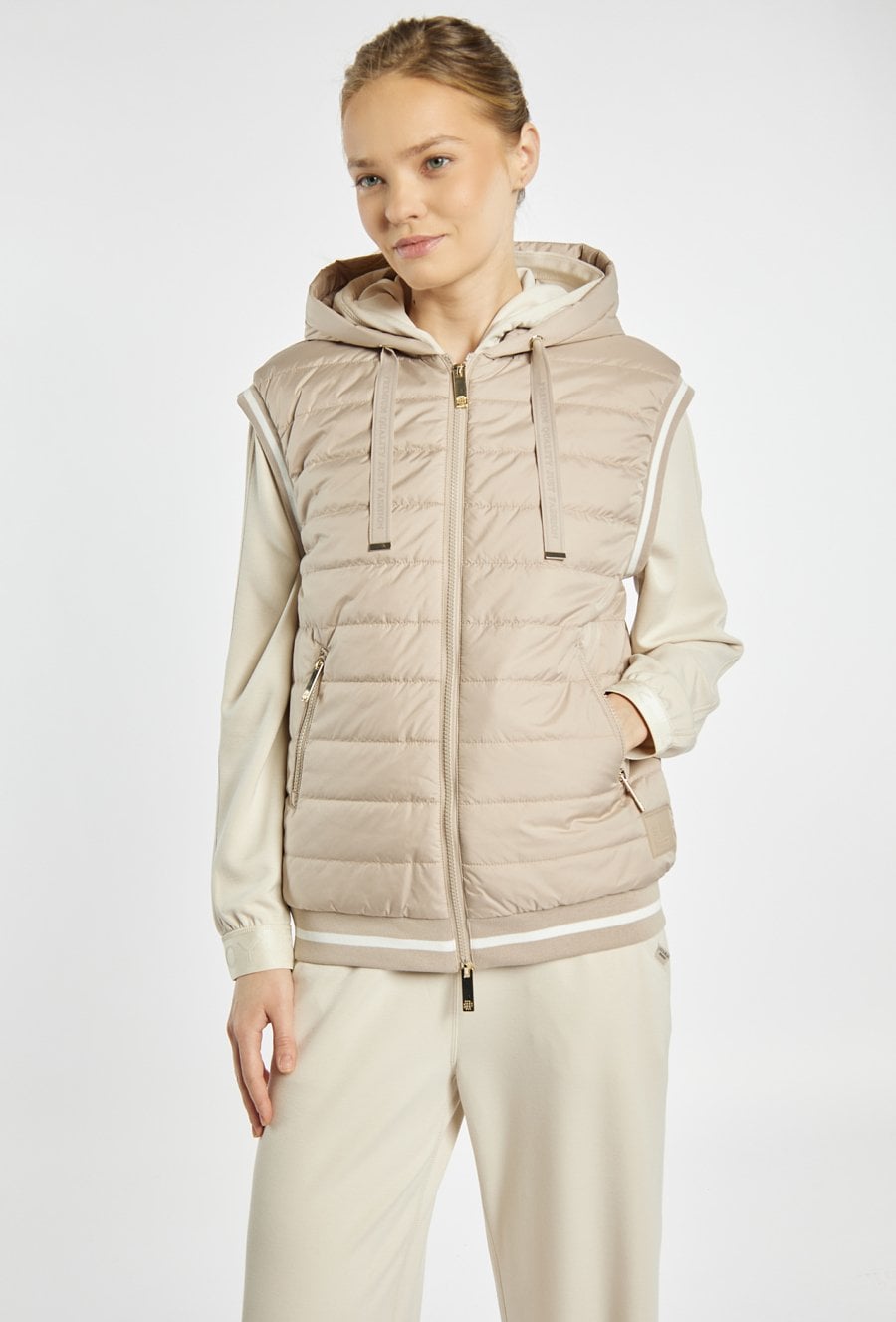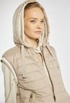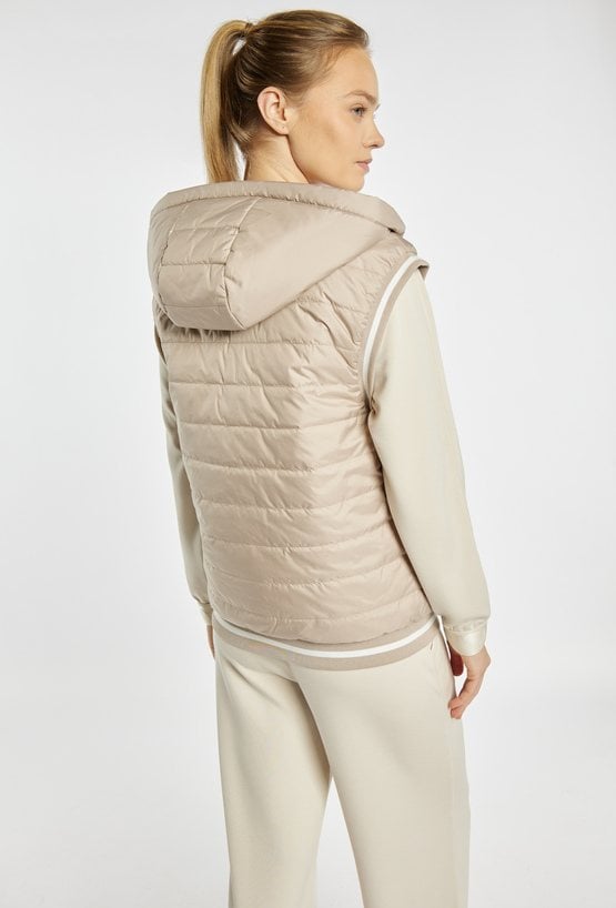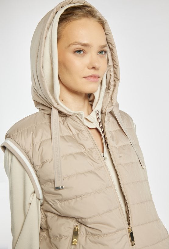 Kamizelka o pikowanym fasonie, zapinana na suwak, z kapturem oraz kieszeniami zapinanymi na zamki. Kamizelka świetnie sprawdzająca się w zestawieniu z bluzą lub swetrem w chłodniejsze dni. Modelka na zdjęciu ma 177 cm wzrostu i prezentuje rozmiar 36.