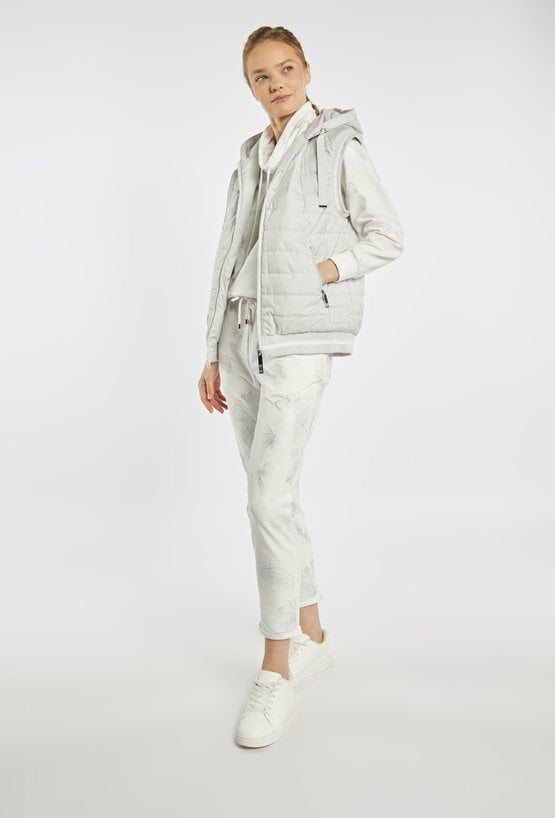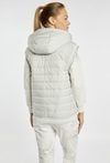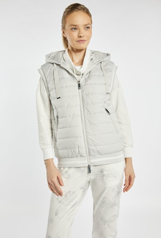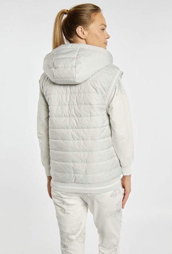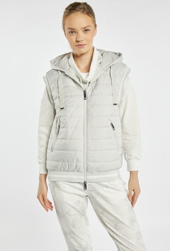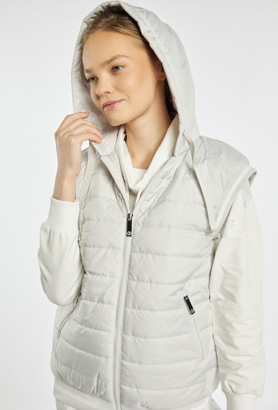 Kamizelka o pikowanym fasonie, zapinana na suwak, z kapturem oraz kieszeniami zapinanymi na zamki. Kamizelka świetnie sprawdzająca się w zestawieniu z bluzą lub swetrem w chłodniejsze dni. Modelka na zdjęciu ma 177 cm wzrostu i prezentuje rozmiar 36.