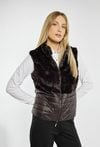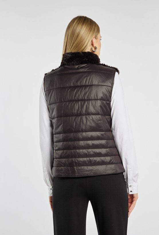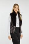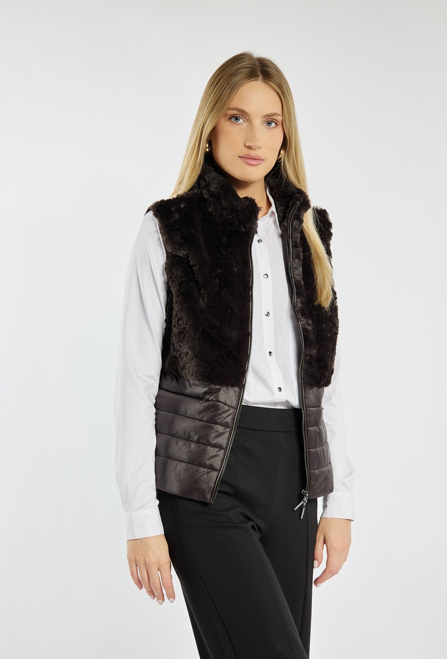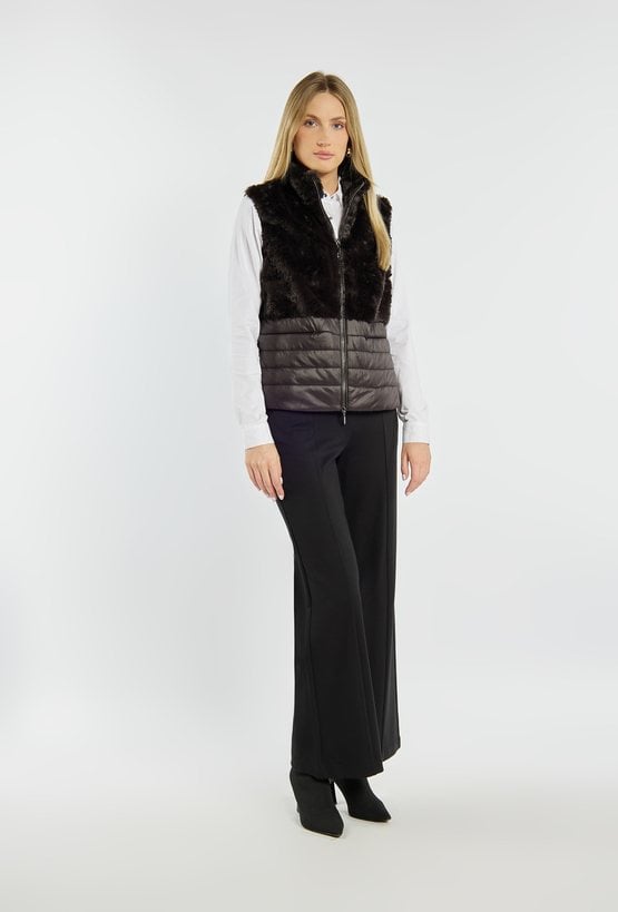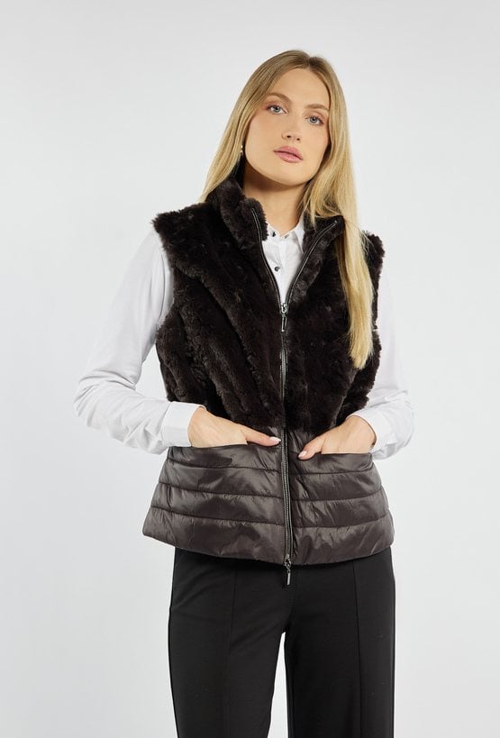 Kamizelka damska o nowoczesnym, dwuczęściowym designie. Górna część wykonana jest z miękkiego, futerkowego materiału, natomiast dolna ma pikowaną, lekko połyskującą strukturę, nadającą sportowego charakteru. Model zapinany na zamek, idealny do noszenia na swetry czy golfy w chłodniejsze dni. Modelka na zdjęciu ma 177 cm wzrostu i prezentuje rozmiar 36