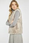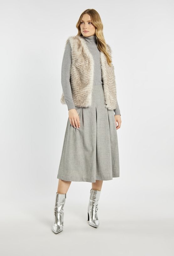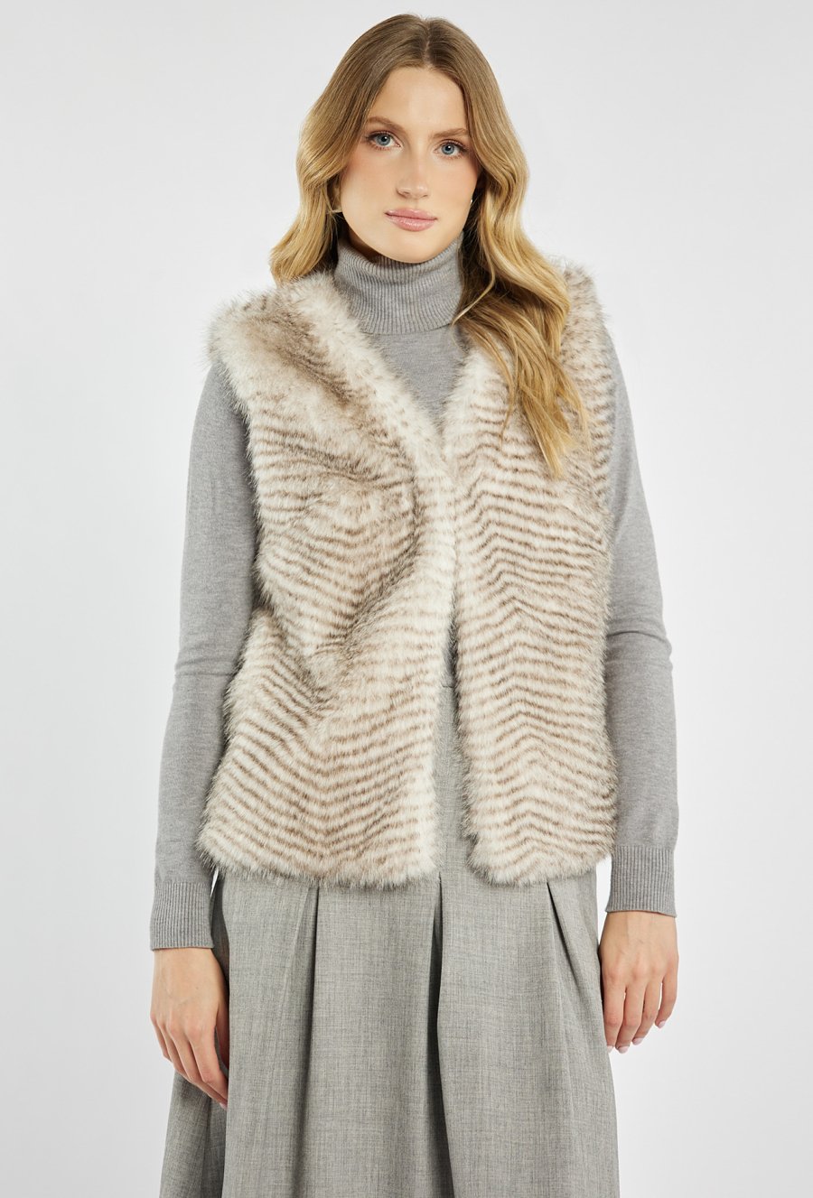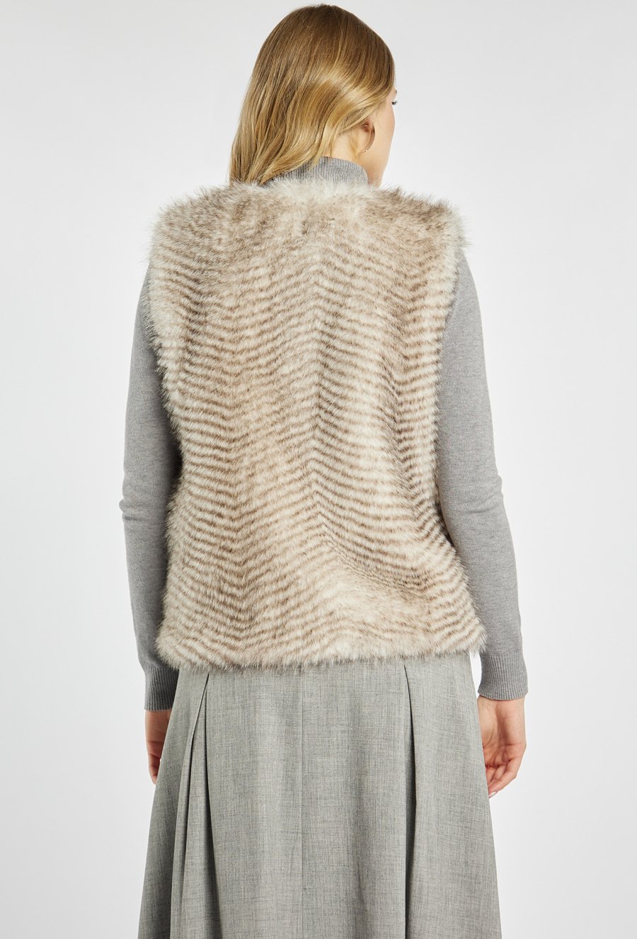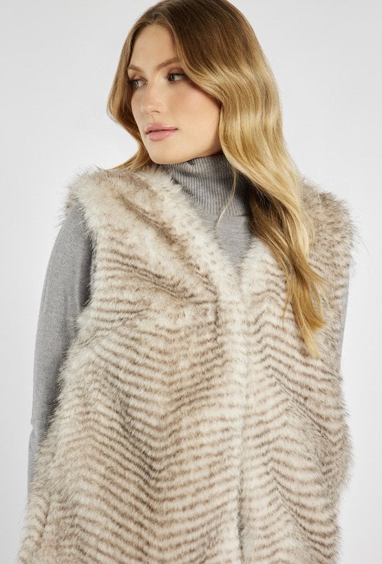 Stylowa kamizelka z miękkiego, sztucznego futerka. Model o lekko rozszerzanym kroju, bez zapięcia, idealny do noszenia na swetry i golfy. Doskonały wybór na chłodniejsze dni. Modelka na zdjęciu ma 177 cm wzrostu i prezentuje rozmiar 36.