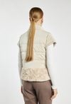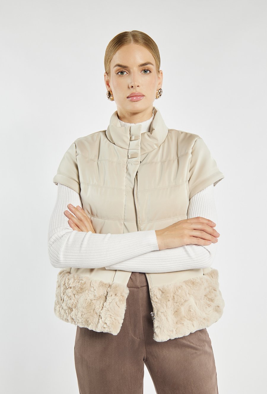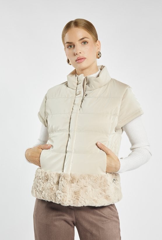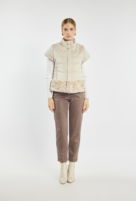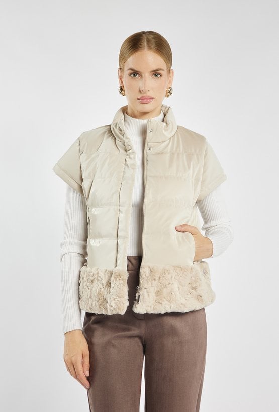 Kamizelka o nowoczesnym, lekko pudełkowym kroju to stylowa propozycja na sezon przejściowy. Kamizelka z połyskującym wykończeniem, stójką i zapięciem na napy i suwak świetnie uzupełnia casualowe stylizacje. Modelka na zdjęciu ma 177 cm wzrostu i prezentuje rozmiar 36.