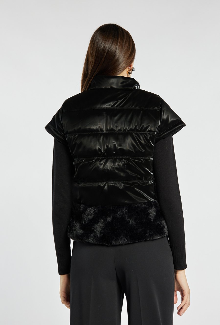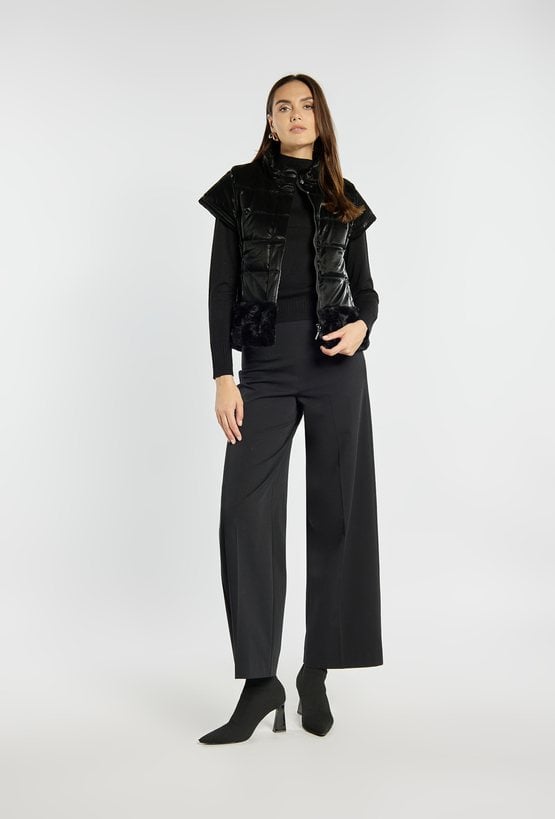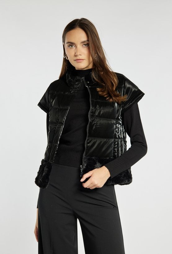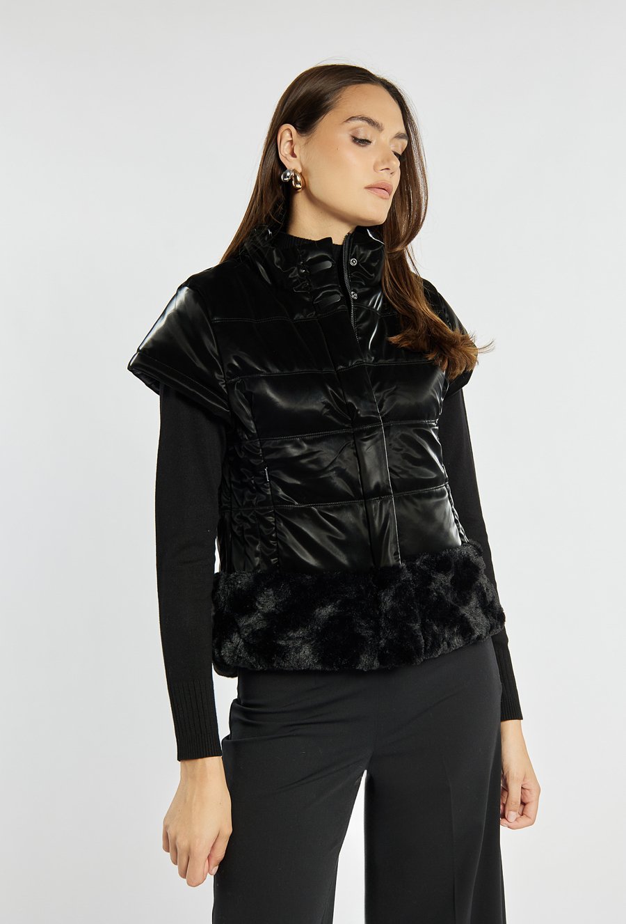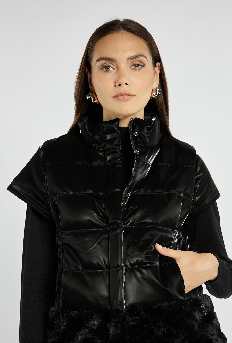 Kamizelka o nowoczesnym, lekko pudełkowym kroju to stylowa propozycja na sezon przejściowy. Kamizelka z połyskującym wykończeniem, stójką i zapięciem na napy i suwak świetnie uzupełnia casualowe stylizacje. Modelka na zdjęciu ma 177 cm wzrostu i prezentuje rozmiar 36.