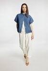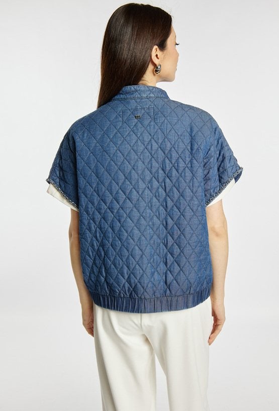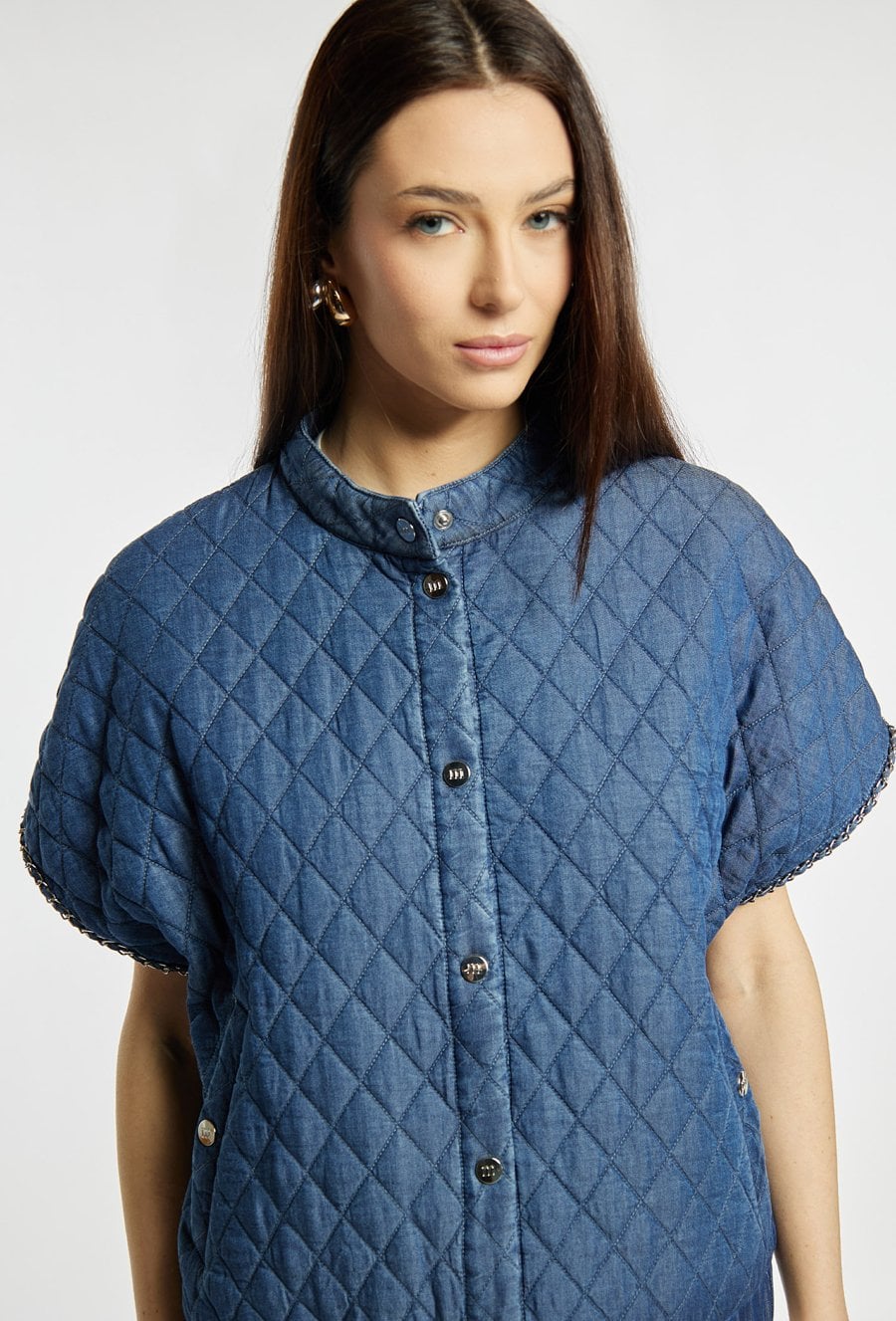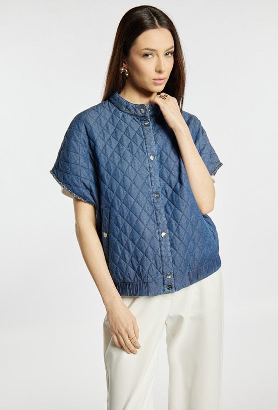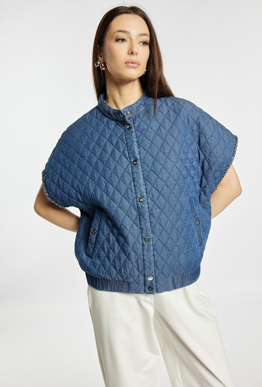Kamizelka damska o nowoczesnym, lekko sportowym charakterze. Model z krótkim rękawem i stójką przy dekolcie, zapinany na guziki na całej długości. Doskonała do codziennych stylizacji. Modelka na zdjęciu ma 177 cm wzrostu i prezentuje rozmiar S/M.