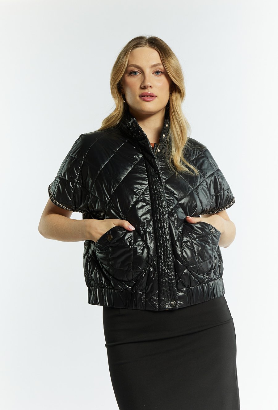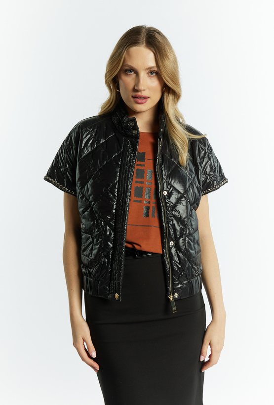 Ta krótka pikowana kamizelka to idealny wybór dla kobiet, które cenią sobie styl i wygodę. Zapewni Ci komfort noszenia w każdej sytuacji. Wysoka stójka oraz zapięcie na suwak to dodatkowe elementy, które sprawią, że poczujesz się modnie i elegancko. Dwie kieszenie na przodzie w które możesz schować drobiazgi lub ogrzać dłonie w chłodniejsze dni. Rękaw zakończony zdobieniem. Modelka prezentuje rozmiar S i mierzy 177 centymetrów wzrostu.