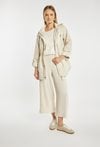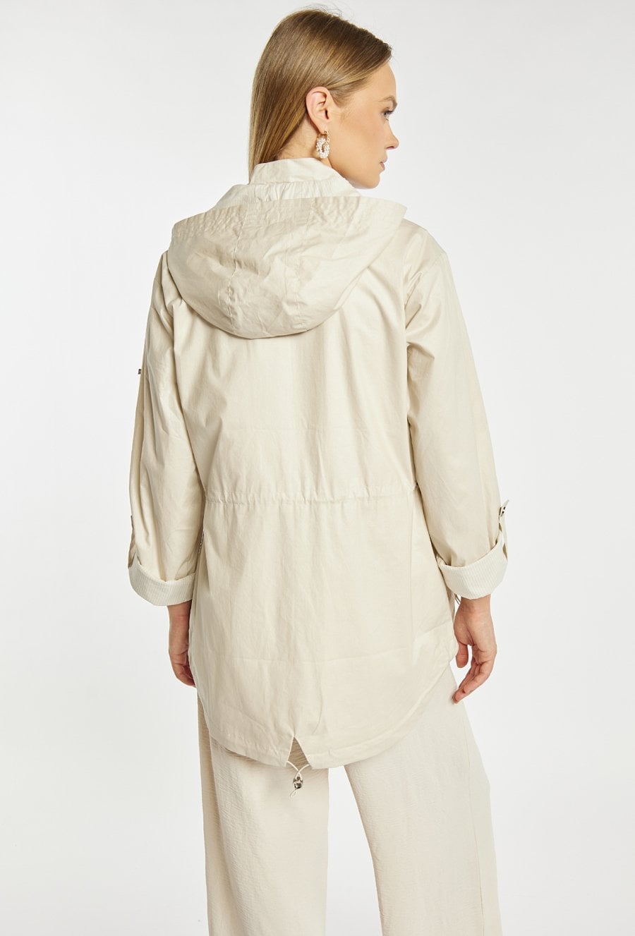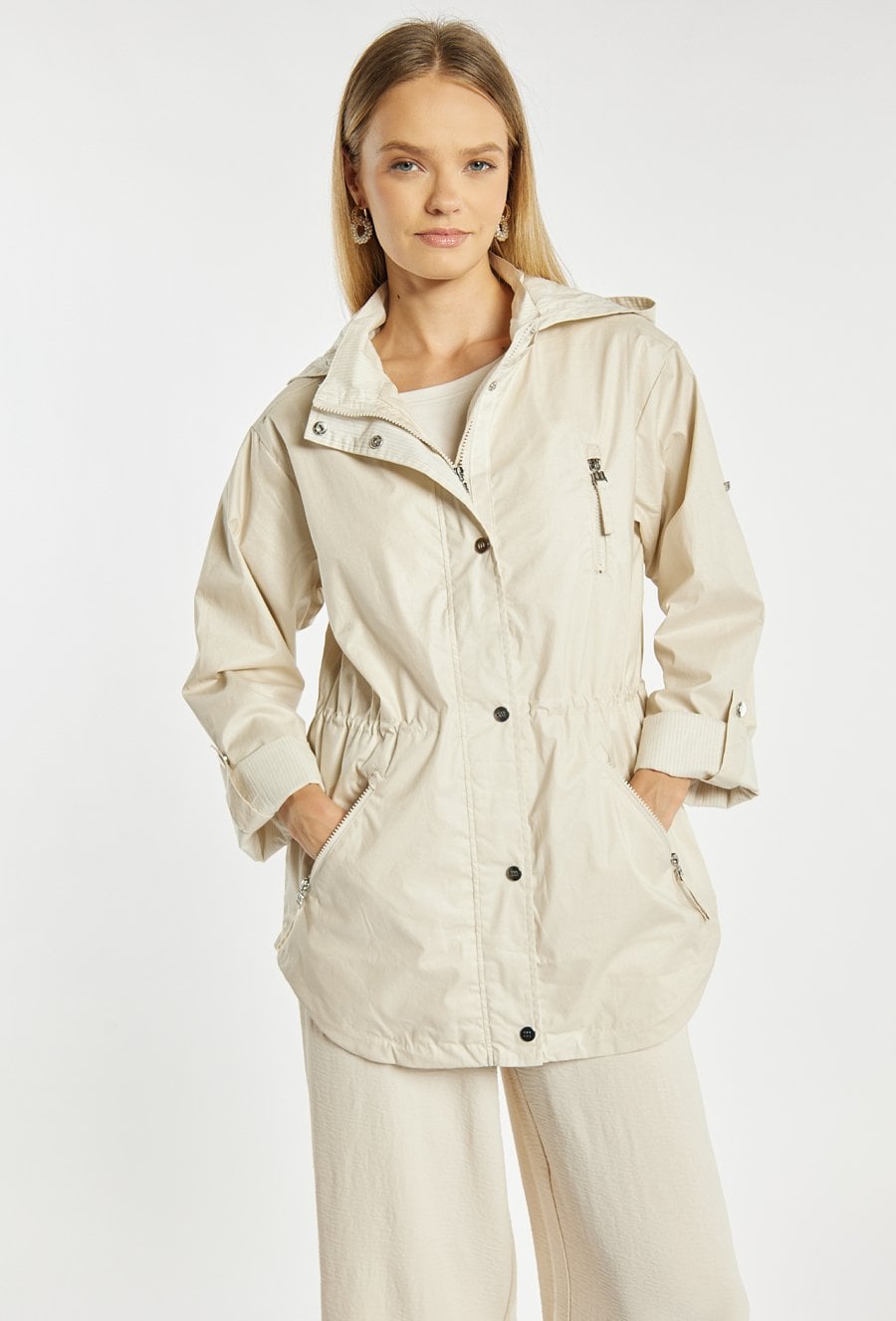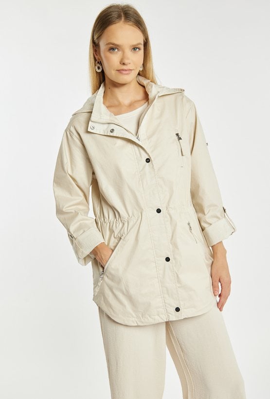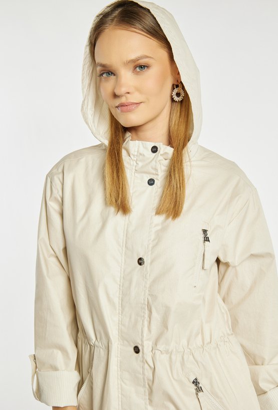 Kurtka damska o lekkim, funkcjonalnym kroju typu parka. Model zapinany na zamek oraz napy, z kapturem, który zapewnia dodatkową ochronę przed wiatrem i deszczem. W talii zastosowano ściągacz, umożliwiający dopasowanie i podkreślenie sylwetki. Kurtka idealnie sprawdzi się w przejściowych stylizacjach, łącząc komfort z casualowym stylem. Modelka na zdjęciu ma 177 cm wzrostu i prezentuje rozmiar 36.