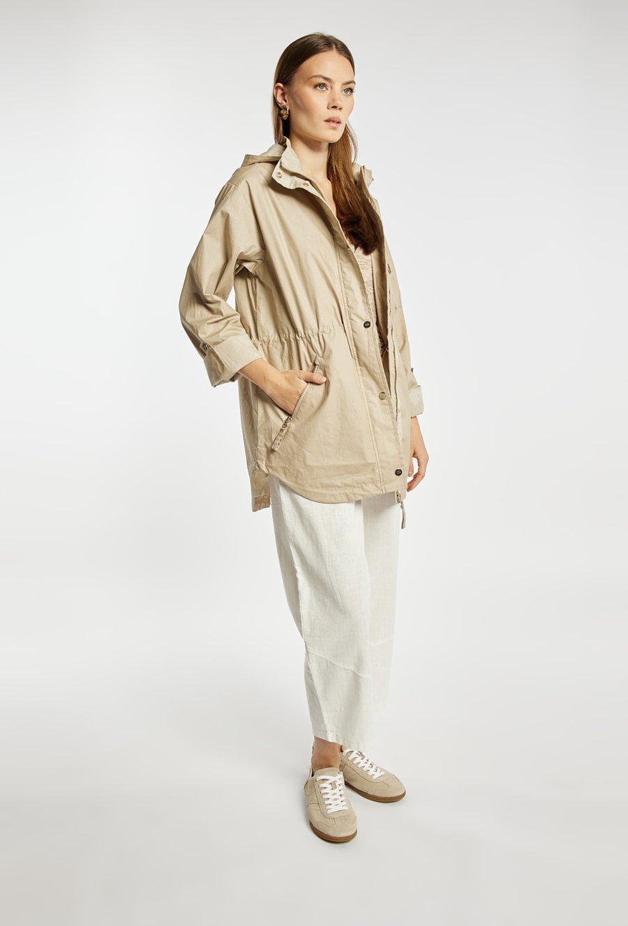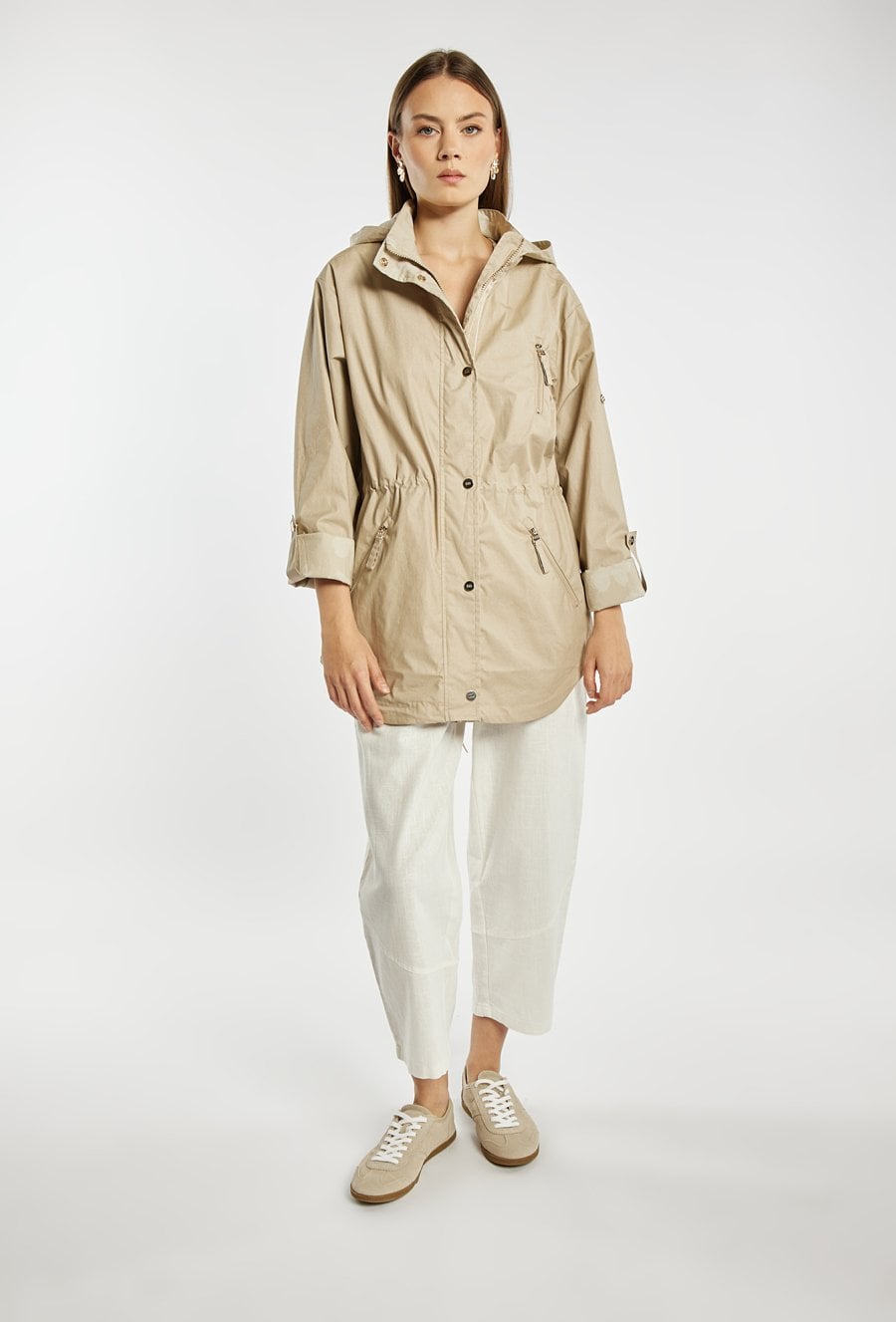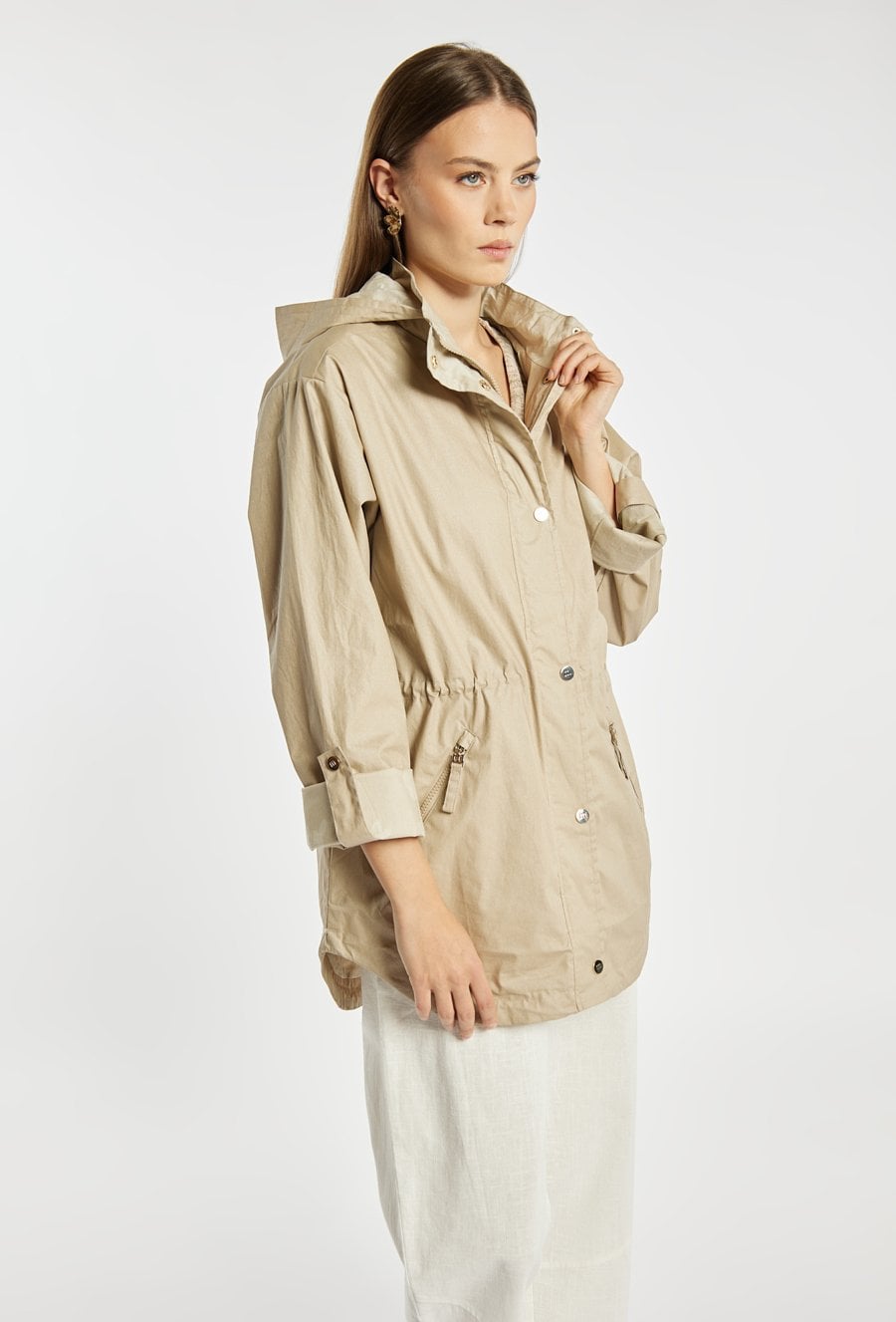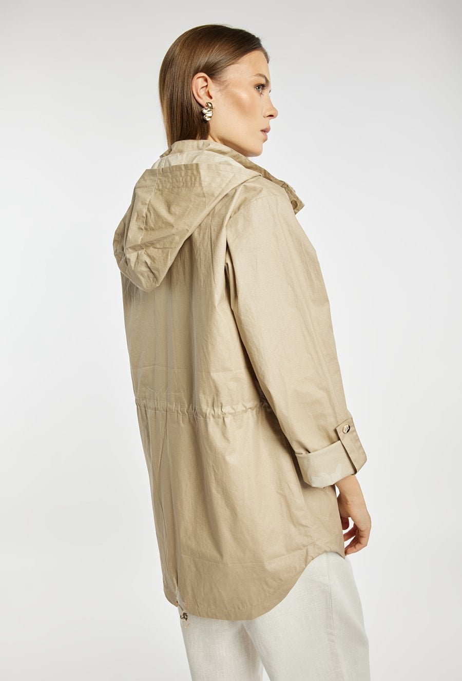 Kurtka damska o lekkim, funkcjonalnym kroju typu parka. Model zapinany na zamek oraz napy, z kapturem, który zapewnia dodatkową ochronę przed wiatrem i deszczem. W talii zastosowano ściągacz, umożliwiający dopasowanie i podkreślenie sylwetki. Kurtka idealnie sprawdzi się w przejściowych stylizacjach, łącząc komfort z casualowym stylem. Modelka na zdjęciu ma 177 cm wzrostu i prezentuje rozmiar 36.