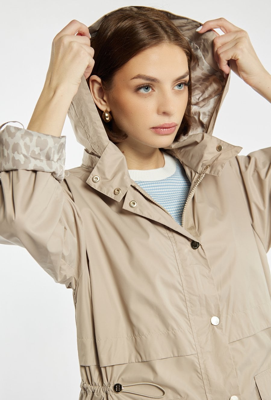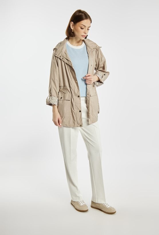 Kurtka typu parka o swobodnym, funkcjonalnym fasonie. Model z odpinanym kapturem, zapinany na zatrzaski i zamek, z możliwością regulacji w talii. Praktyczne kieszenie oraz detale przy rękawach dodają całości casualowego charakteru. Idealna na sezon przejściowy. Modelka na zdjęciu ma 177 cm wzrostu i prezentuje rozmiar 36.