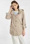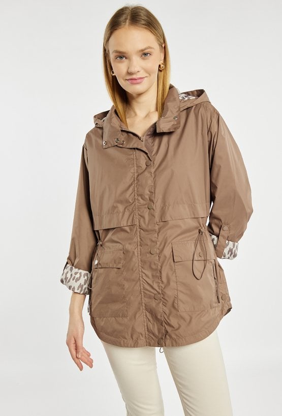 Kurtka typu parka o swobodnym, funkcjonalnym fasonie. Model z odpinanym kapturem, zapinany na zatrzaski i zamek, z możliwością regulacji w talii. Praktyczne kieszenie oraz detale przy rękawach dodają całości casualowego charakteru. Idealna na sezon przejściowy. Modelka na zdjęciu ma 177 cm wzrostu i prezentuje rozmiar 36.