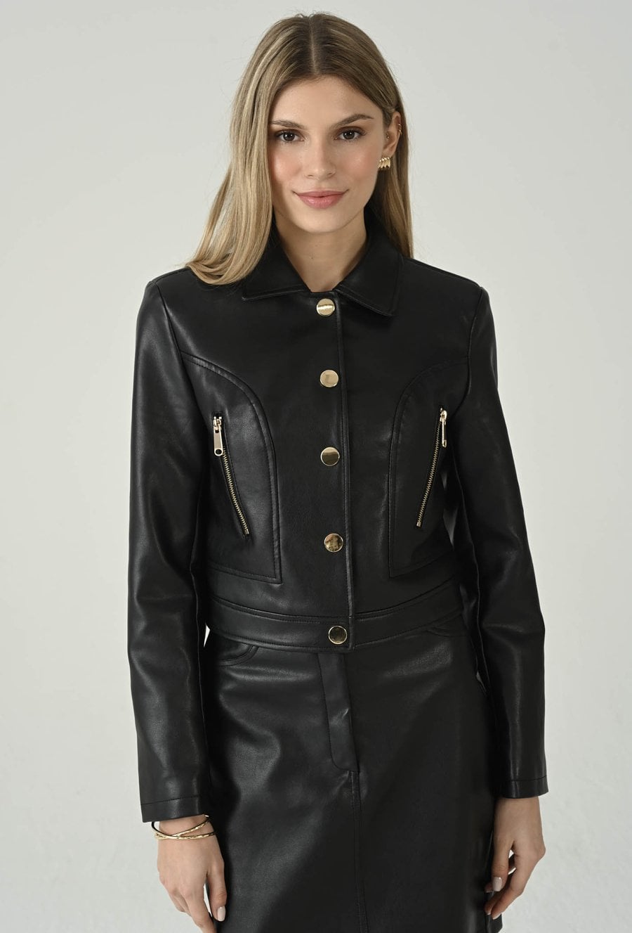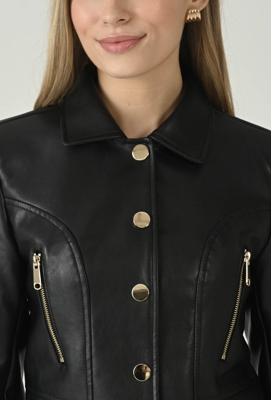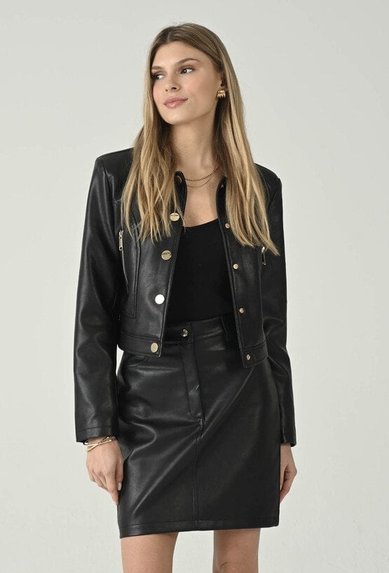 Stylowa kurtka z eko skóry, która łączy nowoczesny design z elegancją. Kołnierzyk i poduszki na ramionach nadają sylwetce wyrafinowanego kształtu, a kieszenie zapinane na zamki oraz podszewka zapewniają wygodę i funkcjonalność. Doskonale komponuje się ze spódnicą dostępną w asortymencie sklepu, tworząc modowy set idealny na casualowe i wieczorne stylizacje. Modelka na zdjęciu ma 177 cm wzrostu i prezentuje rozmiar 36.