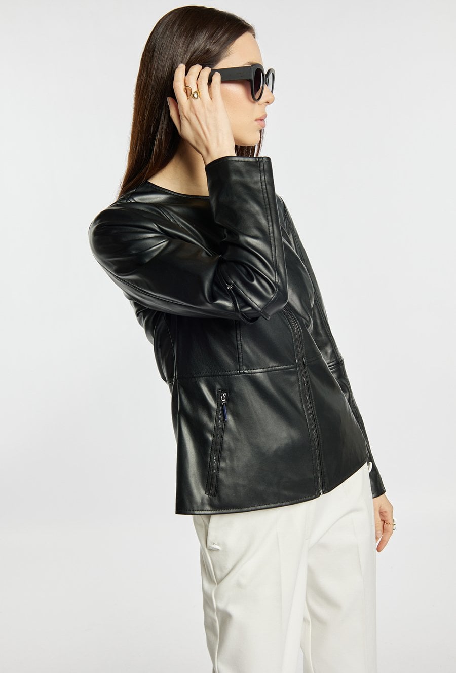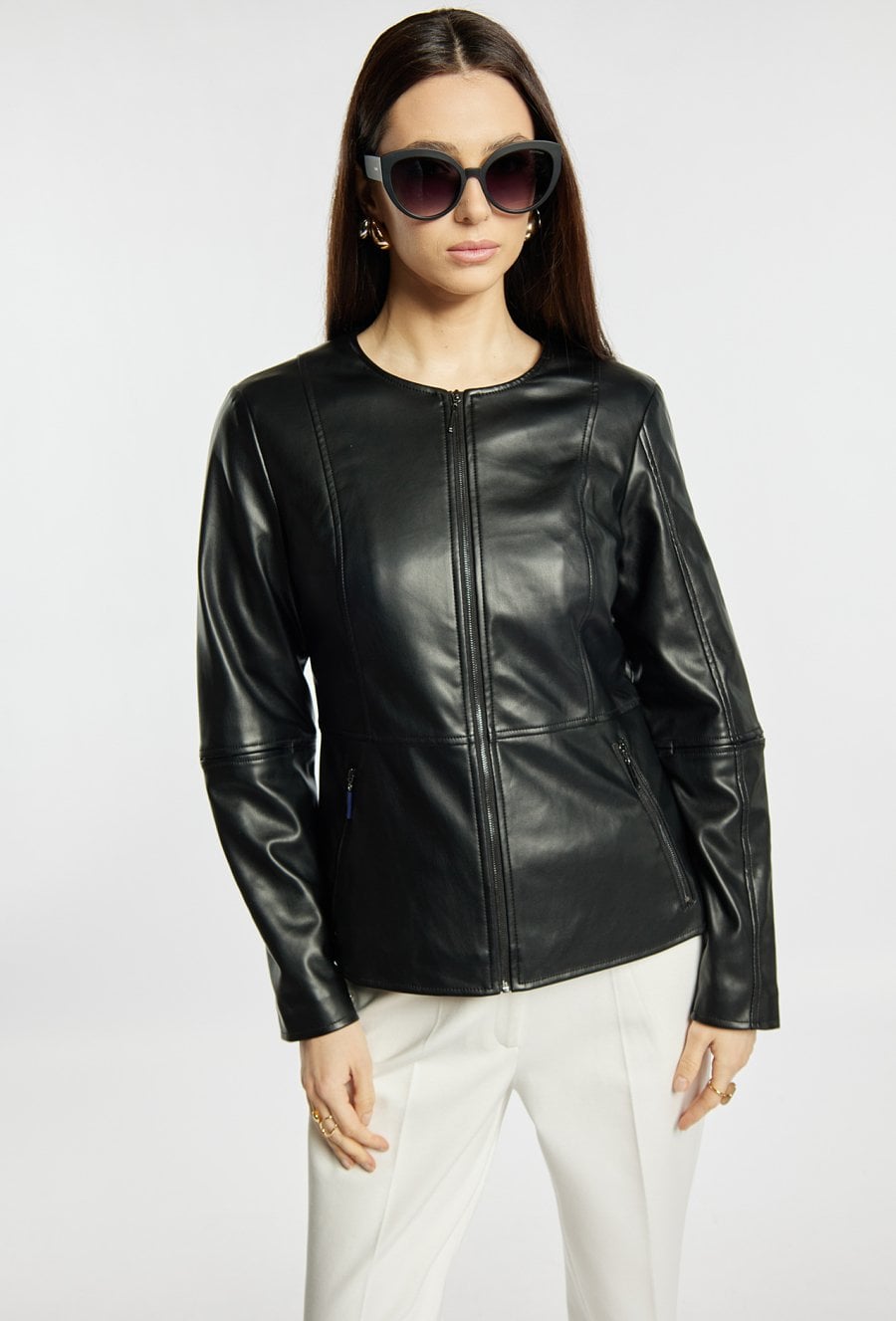 Kurtka damska o eleganckim, dopasowanym fasonie. Model zapinany na zamek, z okrągłym dekoltem oraz długimi rękawami. Pionowe przeszycia i kieszenie zapinane na suwaki subtelnie podkreślają sylwetkę i dodają całości nowoczesnego charakteru. Modelka na zdjęciu ma 177 cm wzrostu i prezentuje rozmiar 36.