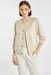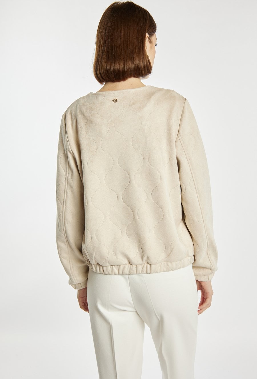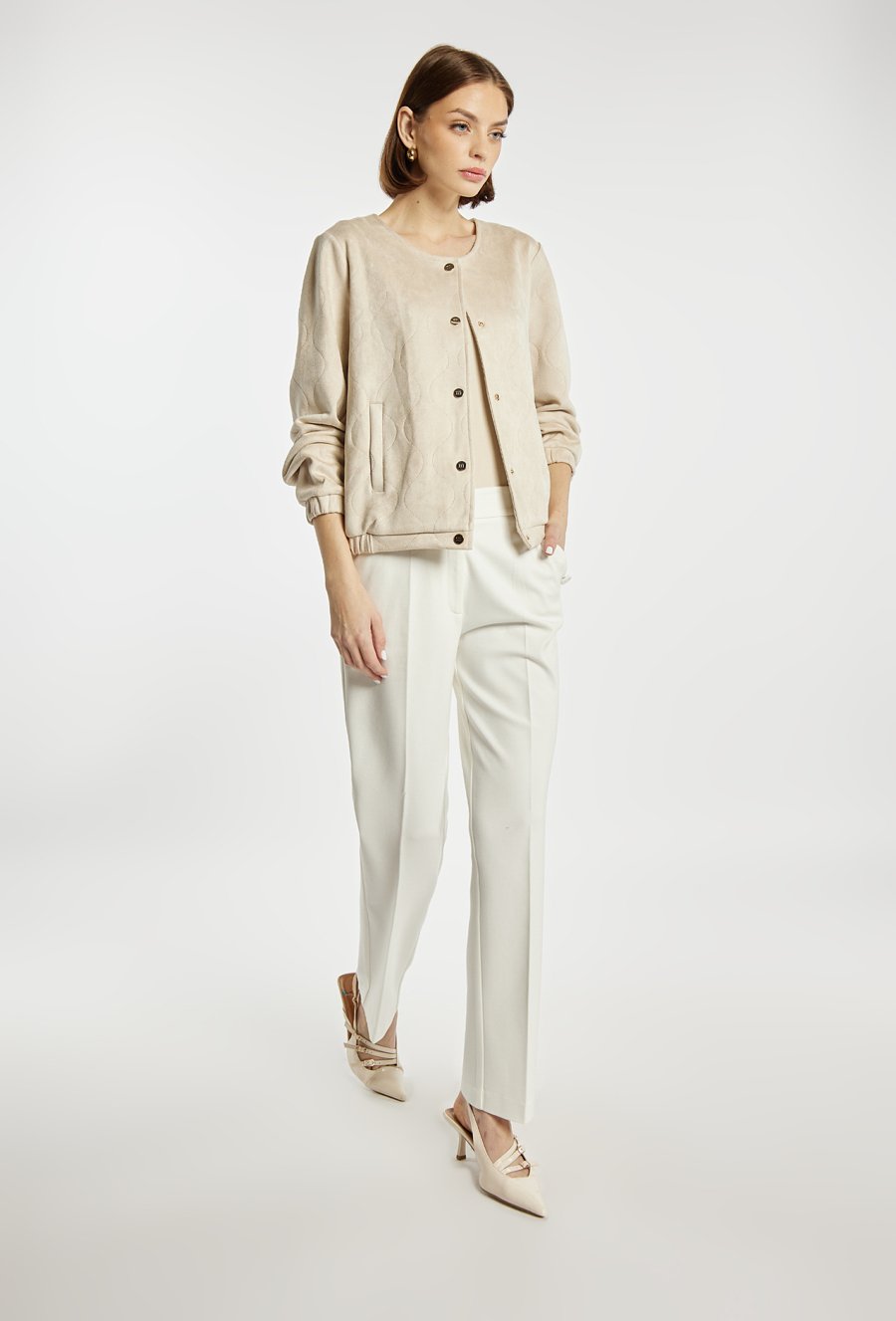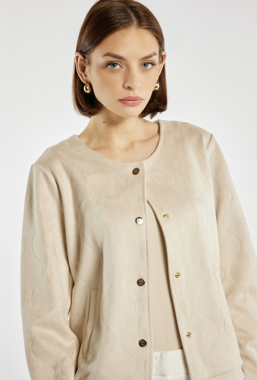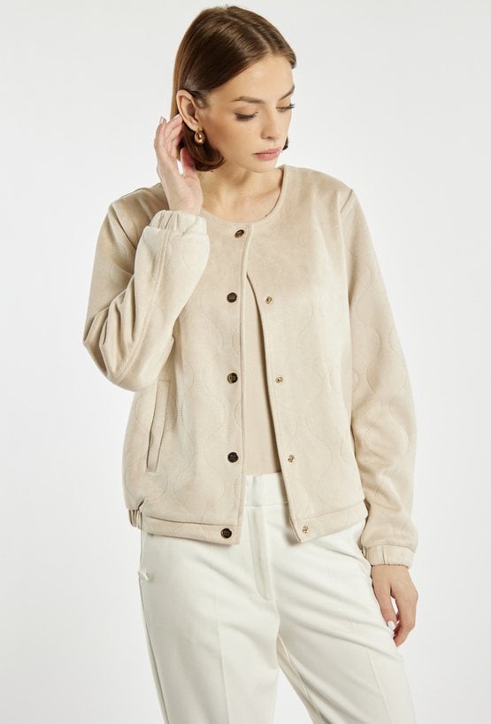 Kurtka damska o krótkim, klasycznym fasonie. Model zapinany na guziki, z okrągłym dekoltem oraz długimi rękawami. Delikatne pikowanie nadaje całości subtelnego, eleganckiego charakteru, a praktyczne kieszenie zwiększają funkcjonalność. Idealna do codziennych i eleganckich stylizacji. Modelka na zdjęciu ma 177 cm wzrostu i prezentuje rozmiar 36.