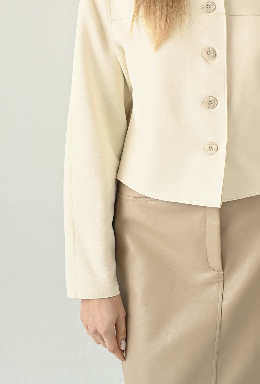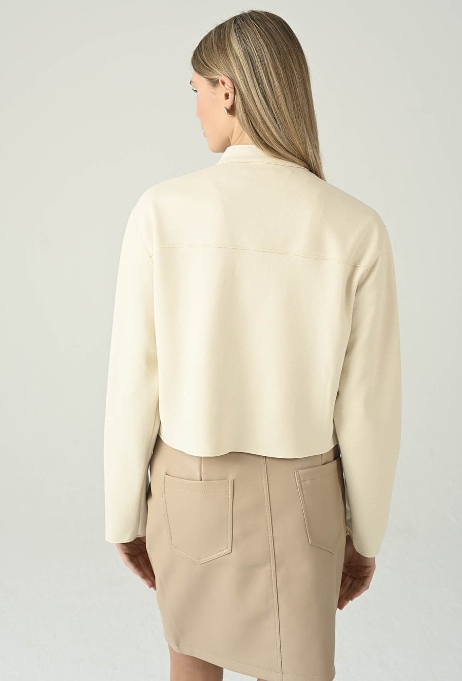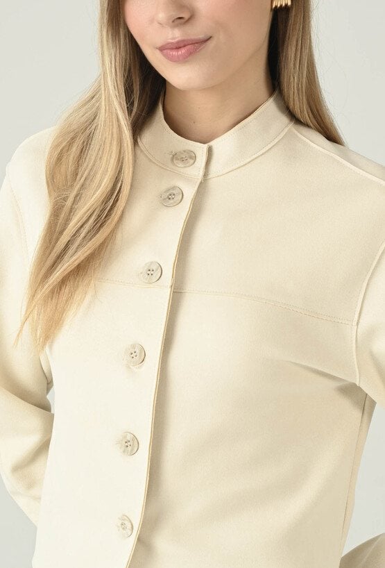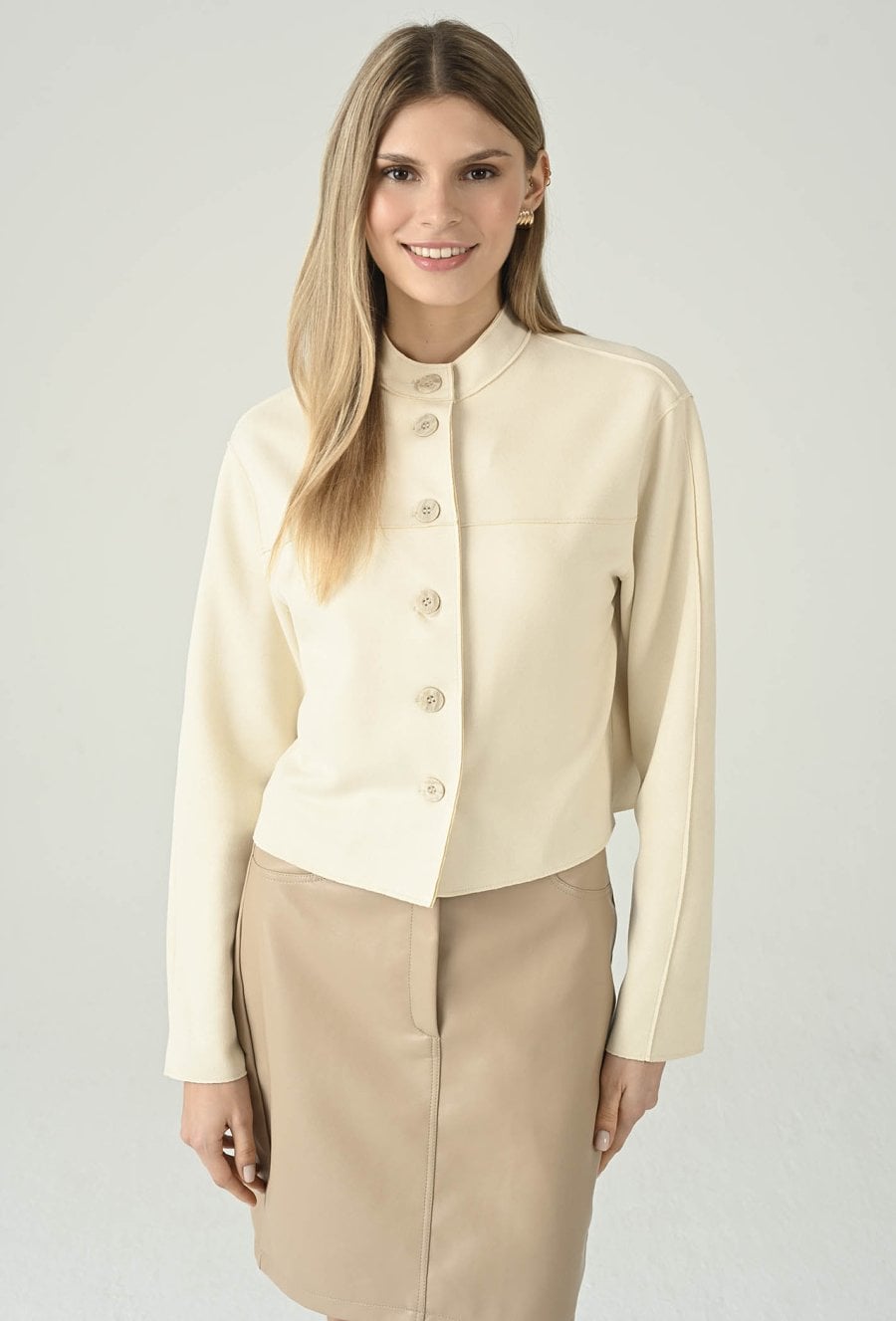 Stylowa krótka kurtka koszulowa w kolorze ecru, która świetnie sprawdzi się jako lekka warstwa w przejściowych stylizacjach. Minimalistyczny fason z kołnierzykiem i zapięciem na guziki nadaje jej elegancki, dopracowany charakter, a długość do talii pięknie podkreśla proporcje sylwetki. Długie rękawy oraz staranne przeszycia dodają całości wyrazistości i podkreślają jakość wykonania. To uniwersalny model, który możesz nosić zarówno do spodni z wysokim stanem, jak i do spódnic — idealny do pracy, na co dzień i na spotkania.