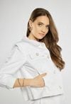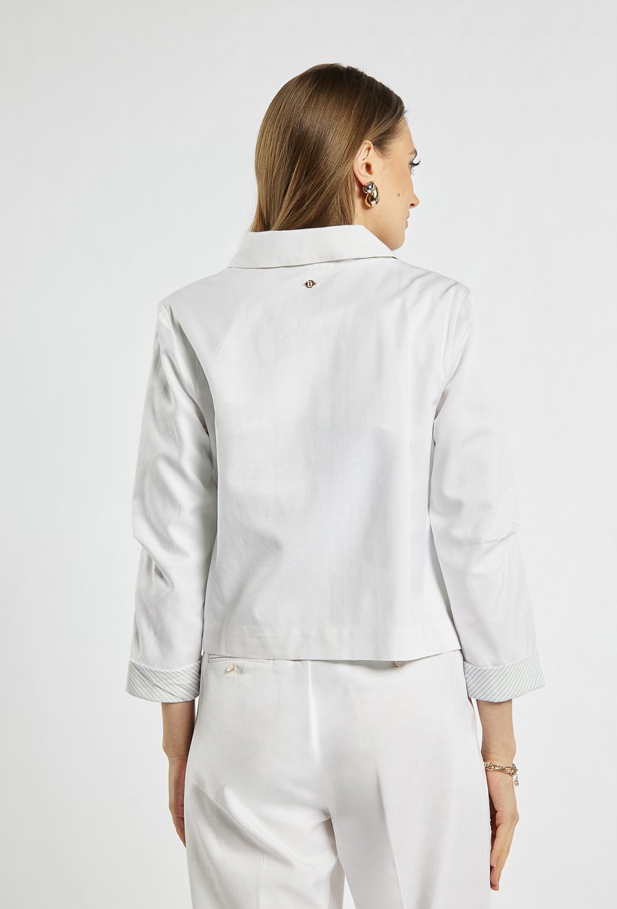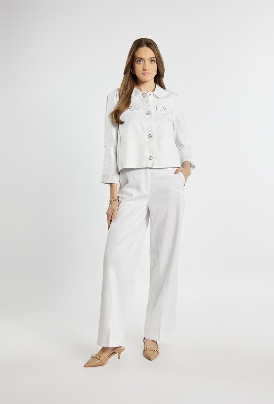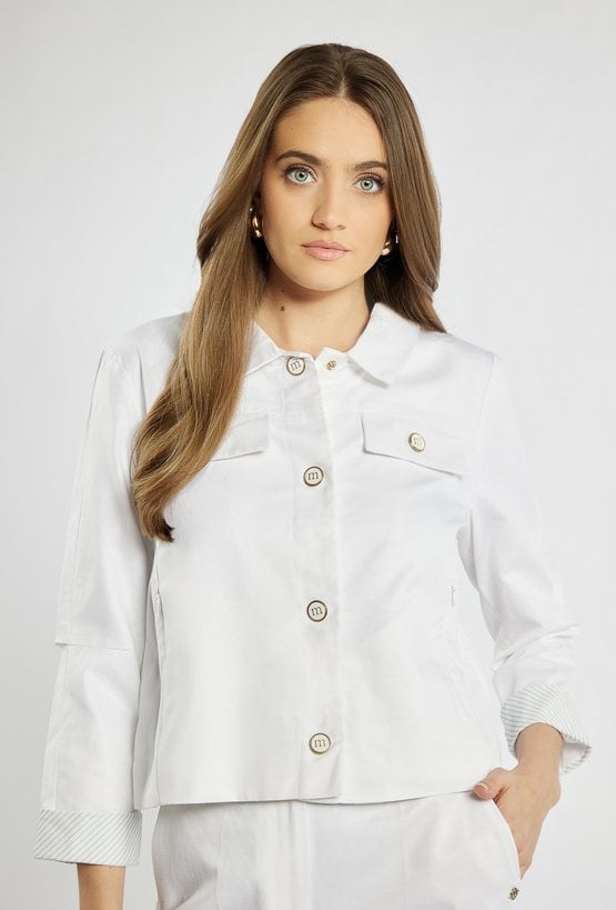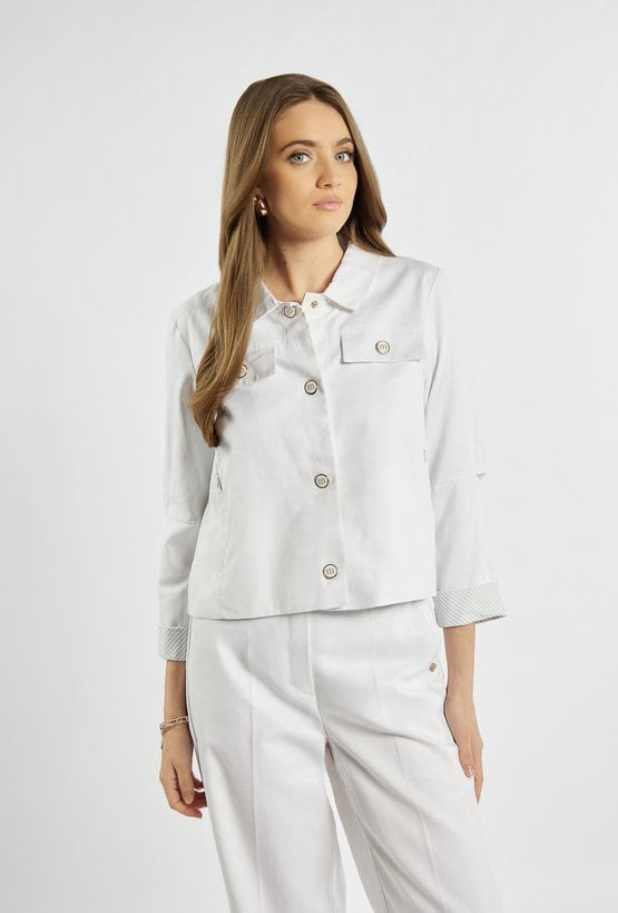 Kurtka damska o krótszym fasonie, zapinana na ozdobne guziki z logo. Model z klasycznym kołnierzykiem, kieszonkami z patkami na biuście oraz praktycznymi kieszeniami bocznymi. Mankiety z możliwością wywinięcia, wykończone subtelną podszewką w paski, dodają całości lekkości i letniego charakteru. Świetnie prezentuje się zarówno w duecie ze spodniami z tej samej linii! Kod do spodni: 25L-TRU0960-K011