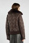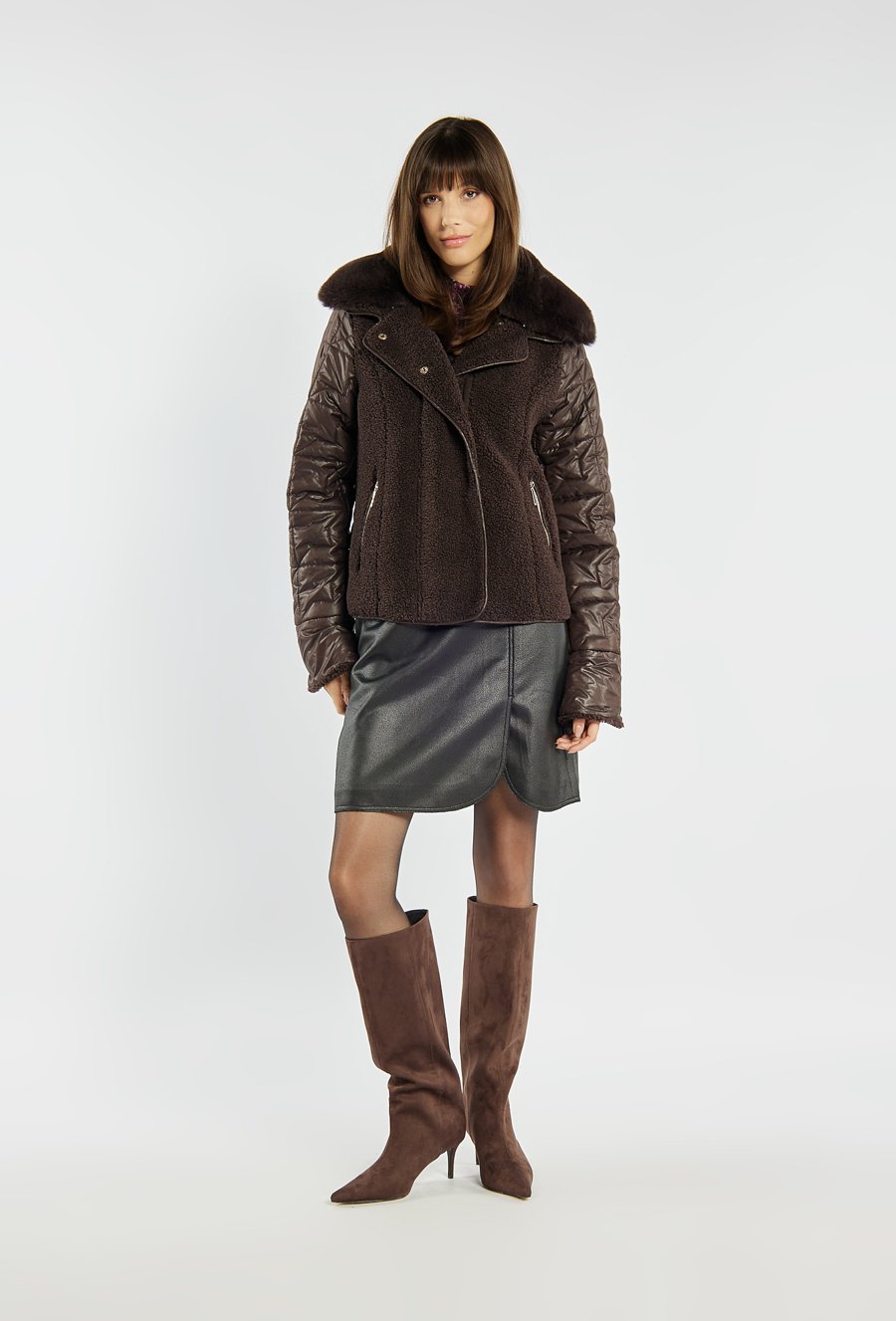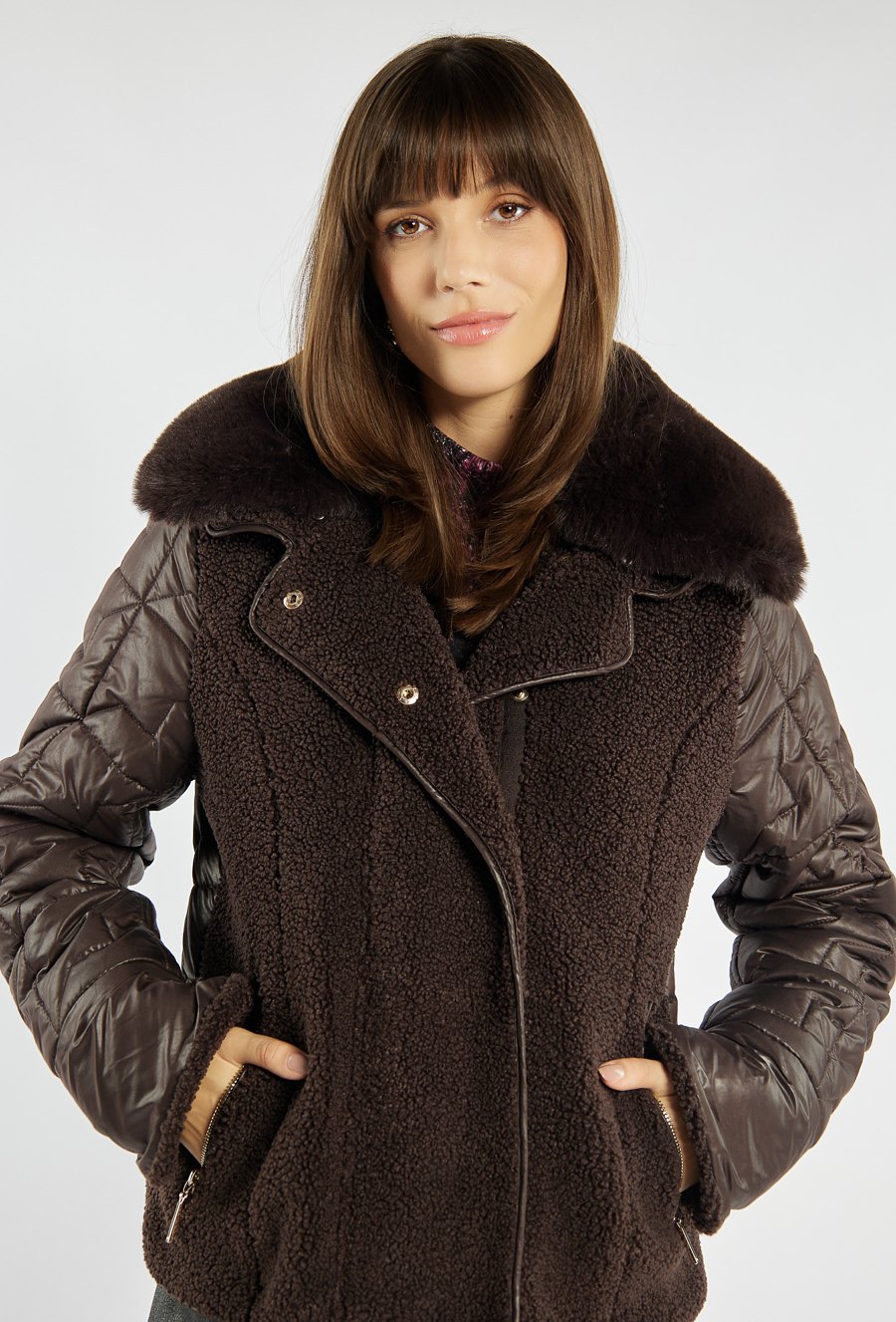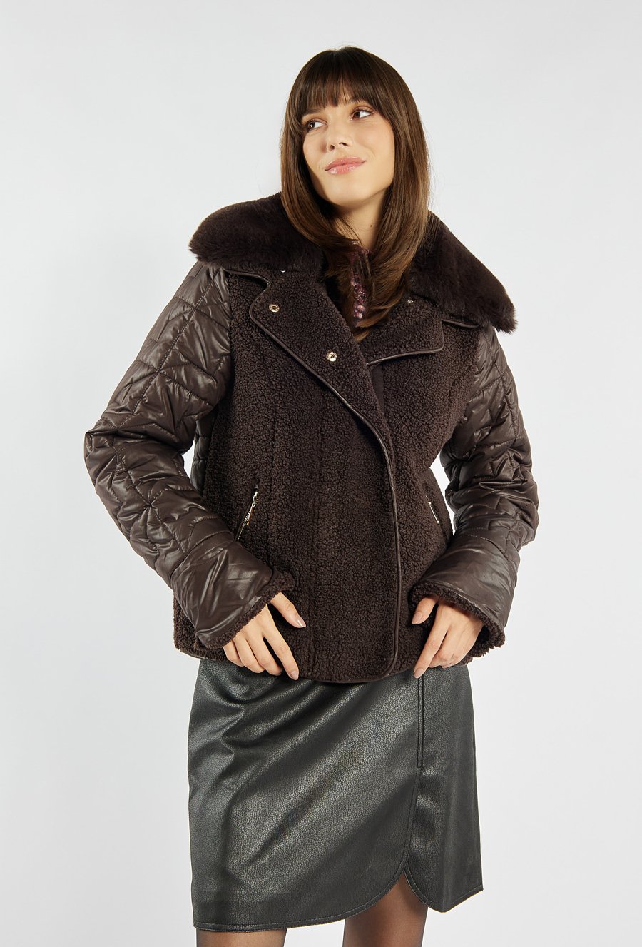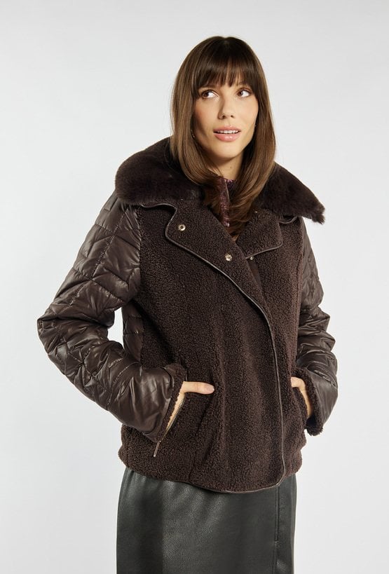 Kurtka o kobiecym kroju łączy w sobie miękki barankowy materiał z pikowanymi rękawami, tworząc oryginalną całość idealną na chłodniejsze dni. Kurtka zapinana na suwak i napy, z futrzanym kołnierzem i kieszeniami na zamek, zapewnia nie tylko wygodę, ale i szykowny wygląd w miejskim stylu. Modelka na zdjęciu ma 177 cm wzrostu i prezentuje rozmiar 36.