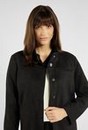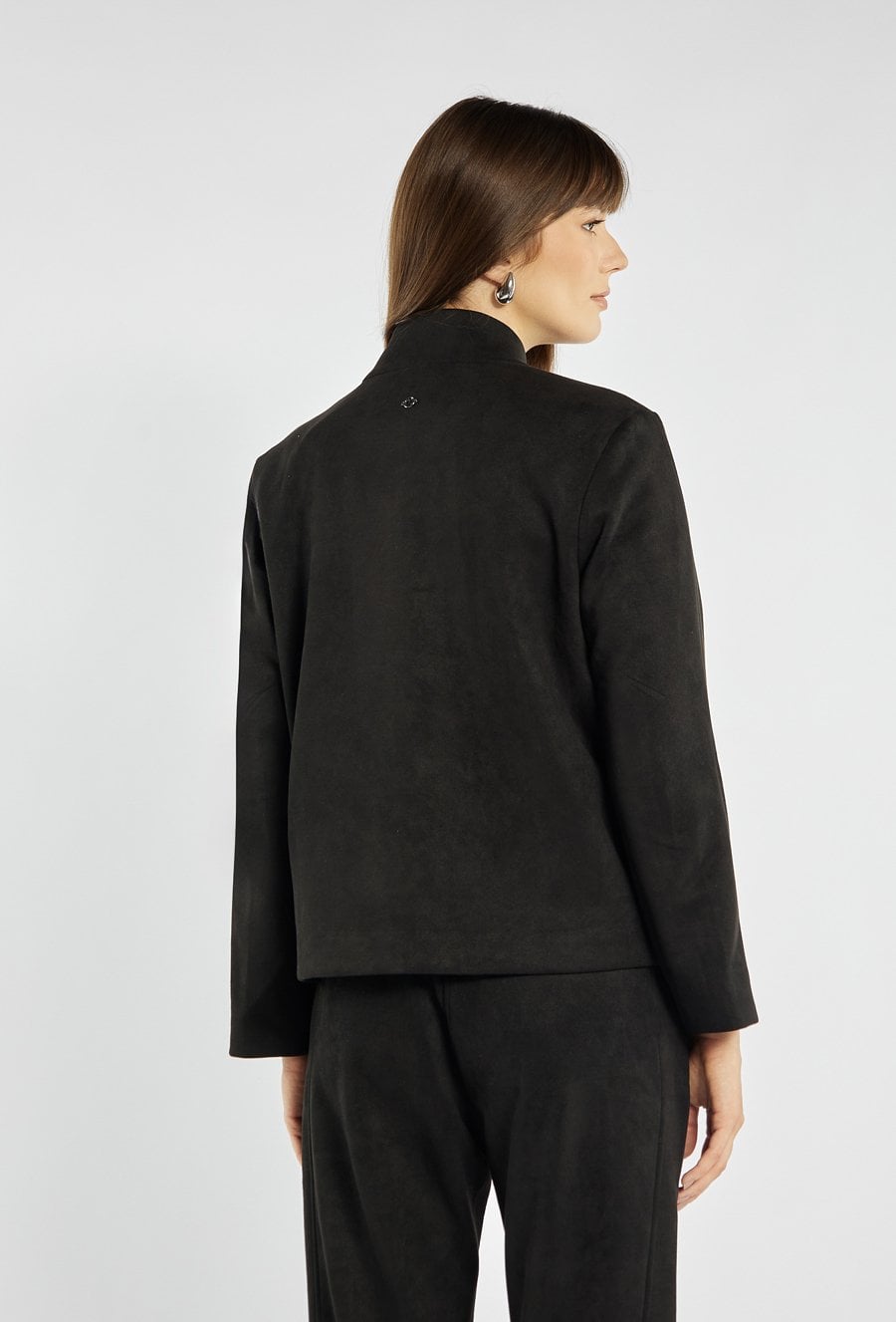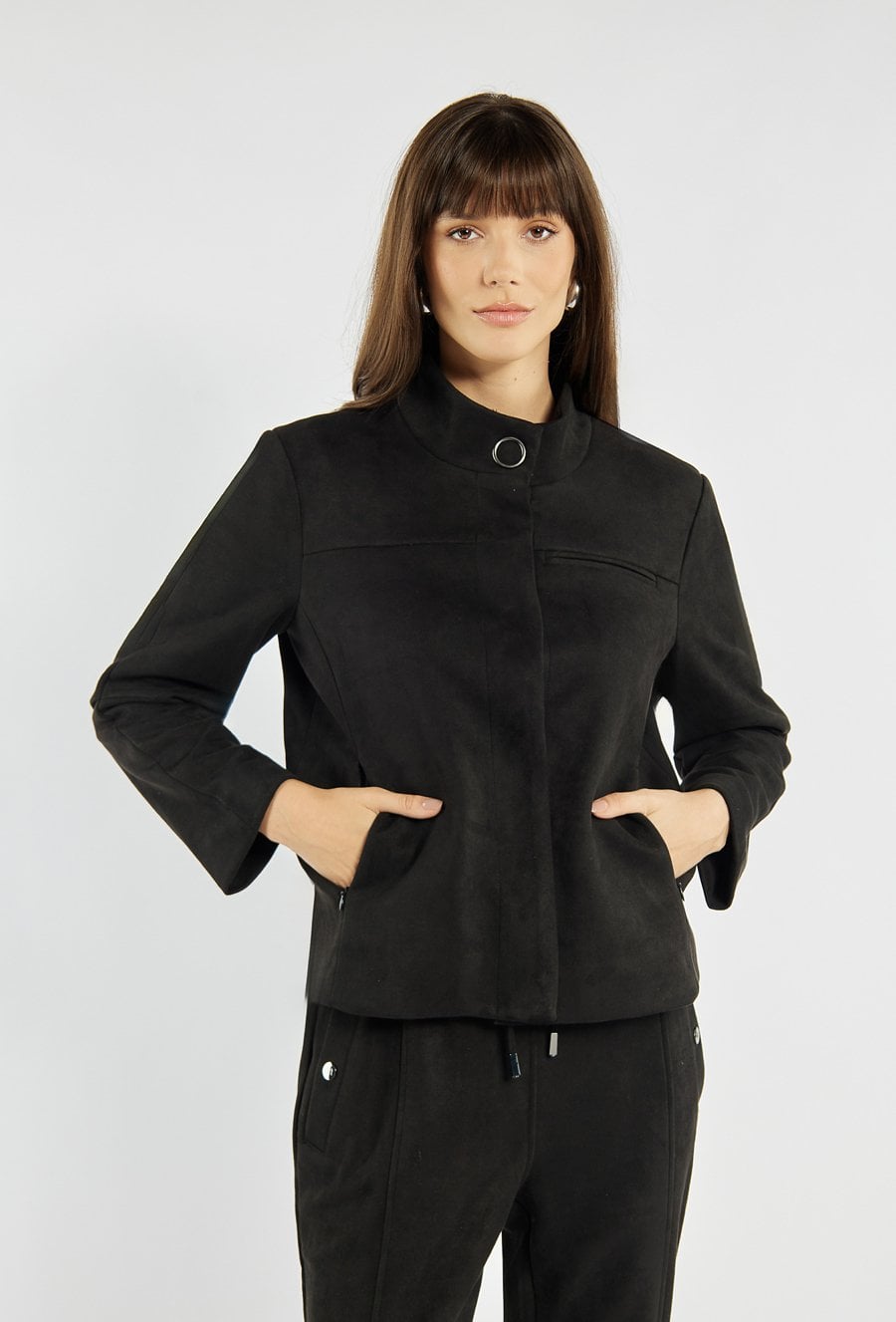 Damska kurtka o prostym kroju. Model zapinany na guziki, z elegancką stójką i ozdobnym guzikiem przy dekolcie. Minimalistyczny fason z delikatnym przeszyciem na piersi sprawia, że kurtka doskonale wpisuje się zarówno w codzienne, jak i bardziej eleganckie stylizacje. Idealnie komponuje się ze spodniami w tym samym odcieniu, tworząc spójny zestaw. Kod do spodni: 25Z-TRU3080. Modelka na zdjęciu ma 177 cm wzrostu i prezentuje rozmiar 36.