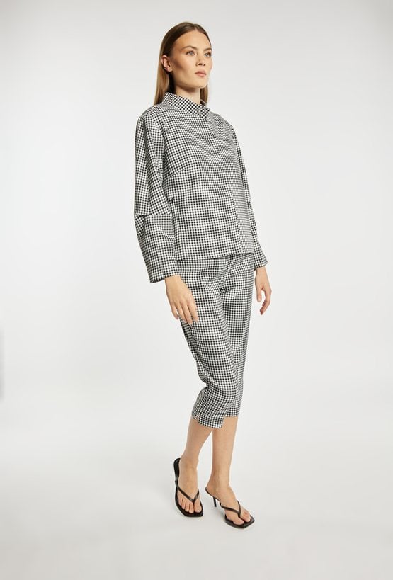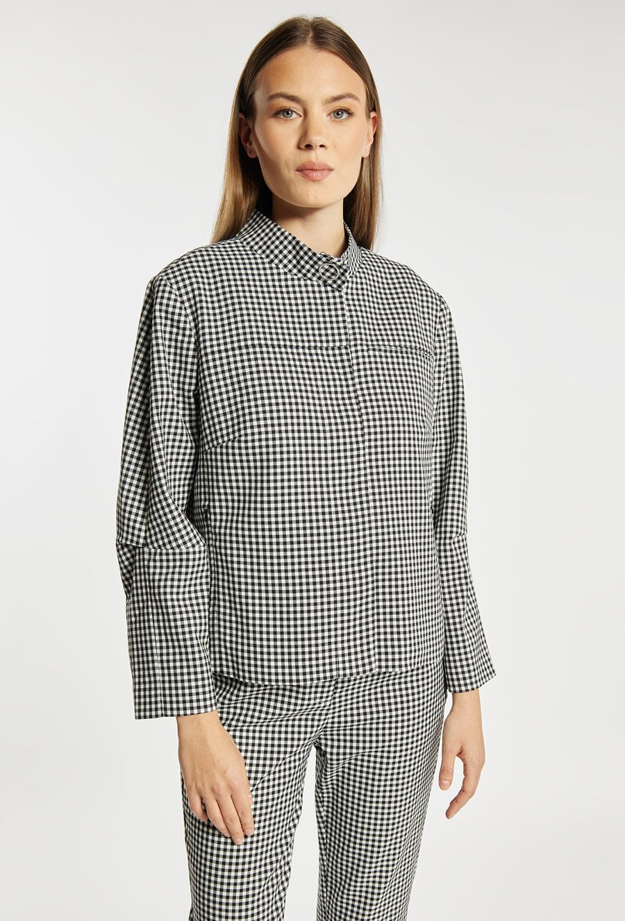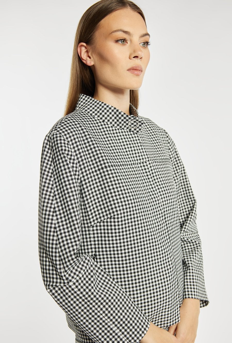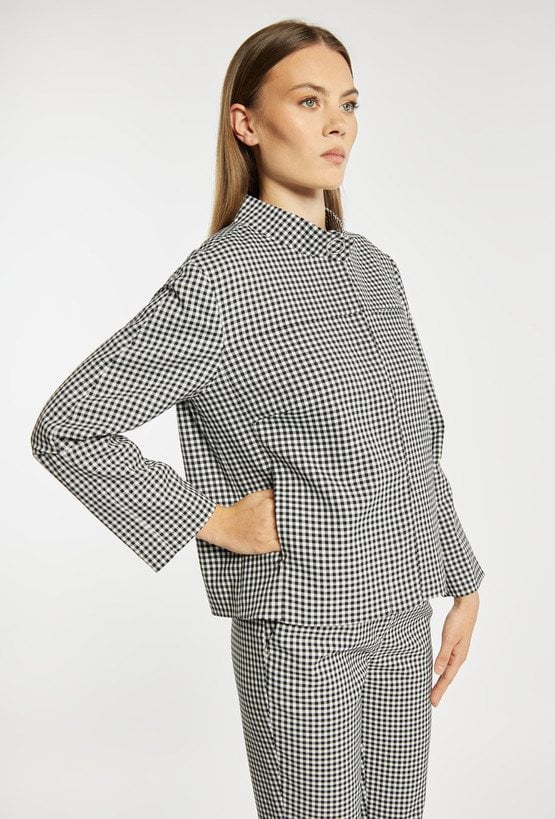 Kurtka damska o krótkim, swobodnym kroju z długim rękawem. Model z klasycznym kołnierzykiem oraz zapięciem z przodu, który nadaje całości stylowego, casualowego charakteru. Całość zdobi ponadczasowy wzór w drobną kratkę, dodający elegancji i modowego wyrazu. Idealna do codziennych stylizacji, łącząc wygodę z klasycznym stylem. Modelka na zdjęciu ma 177 cm wzrostu i prezentuje rozmiar 36.