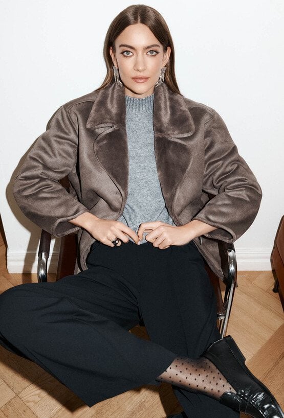 Kurtka o klasycznym kroju z miękkiego materiału imitującego zamsz. Kurtka wykończona kołnierzem i dużymi naszywanymi kieszeniami. Zapinana na guziki, utrzymana w stonowanym kolorze, świetnie sprawdzi się w codziennych, eleganckich stylizacjach. Modelka na zdjęciu ma 177 cm wzrostu i prezentuje rozmiar 36.
