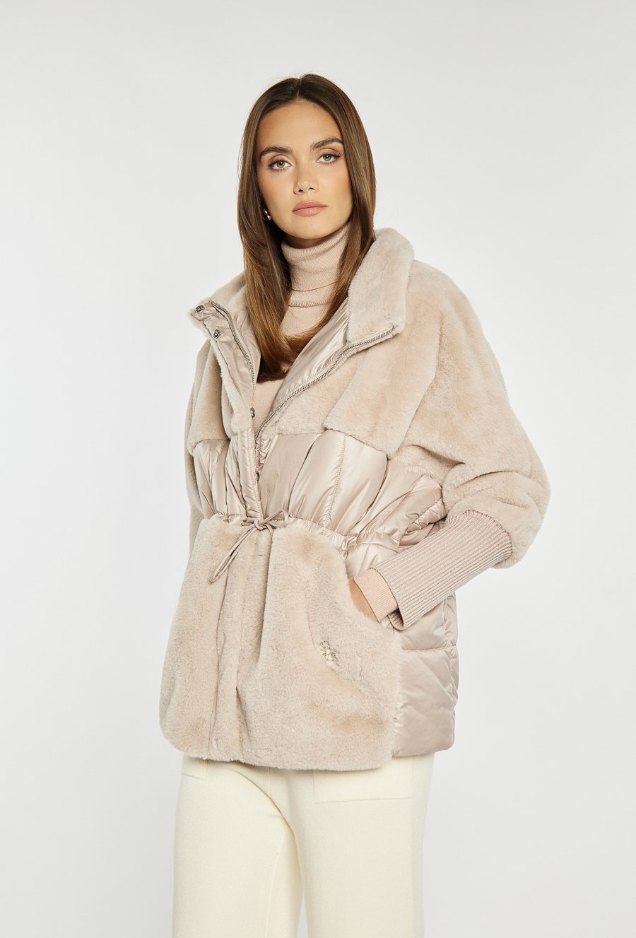 Krótka kurtka o oversize’owym kroju, łącząca w sobie dwa różne materiały. Zapinana na suwak oraz zatrzaski, z regulacją w pasie na troczki. Długość sięgająca do połowy uda sprawia, że jest wygodna i bardzo efektowna, idealna na chłodniejsze dni. Modelka na zdjęciu ma 177 cm wzrostu i prezentuje rozmiar S/M.