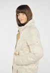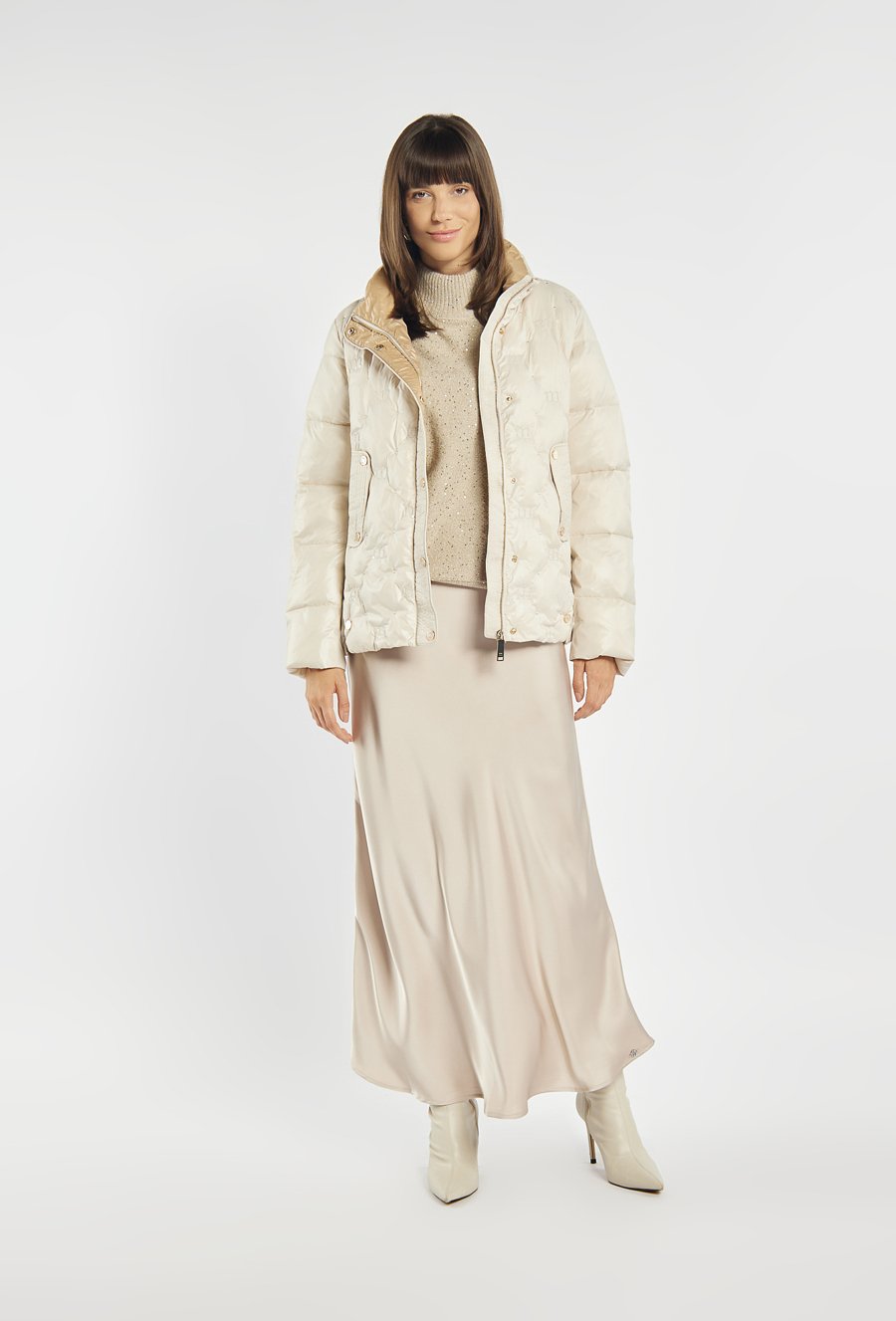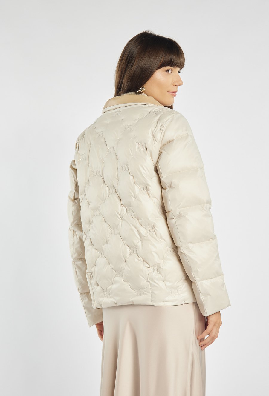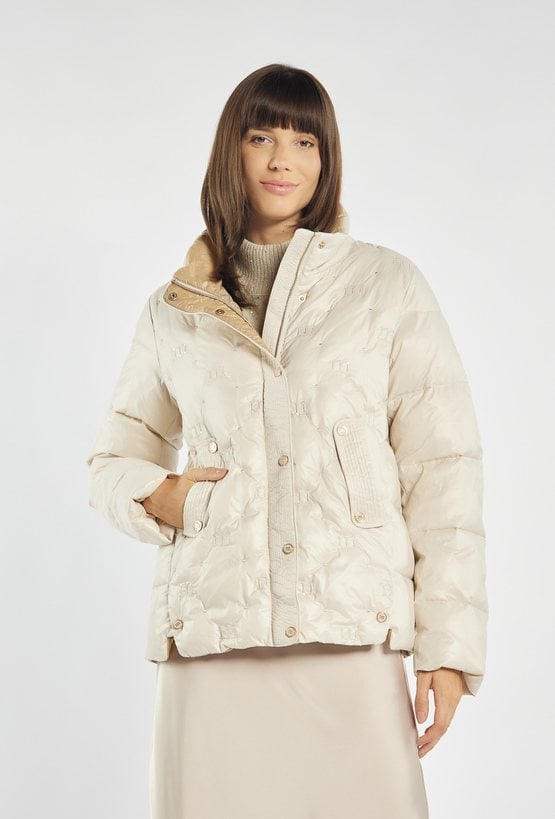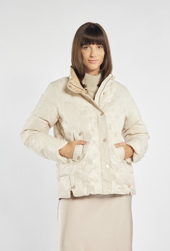 Pikowana kurtka damska o lekko połyskującym wykończeniu, idealna na chłodniejsze dni. Model ozdobiony tłoczonym wzorem w formie litery „M”, charakterystycznym detalem marki. Kurtka zapinana na zamek i napy, wyposażona w praktyczne kieszenie z klapami oraz stójkę. Modelka na zdjęciu ma 177 cm wzrostu i prezentuje rozmiar 36.