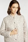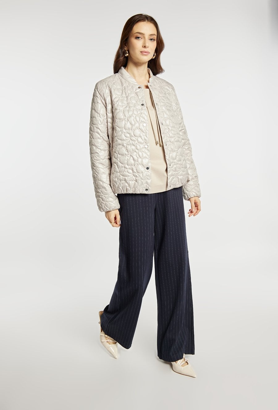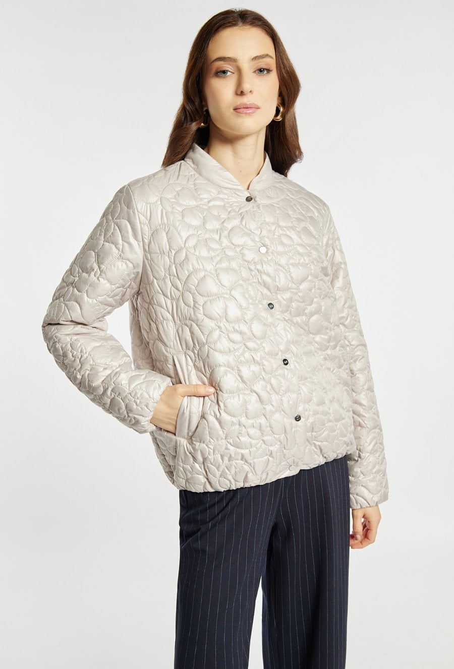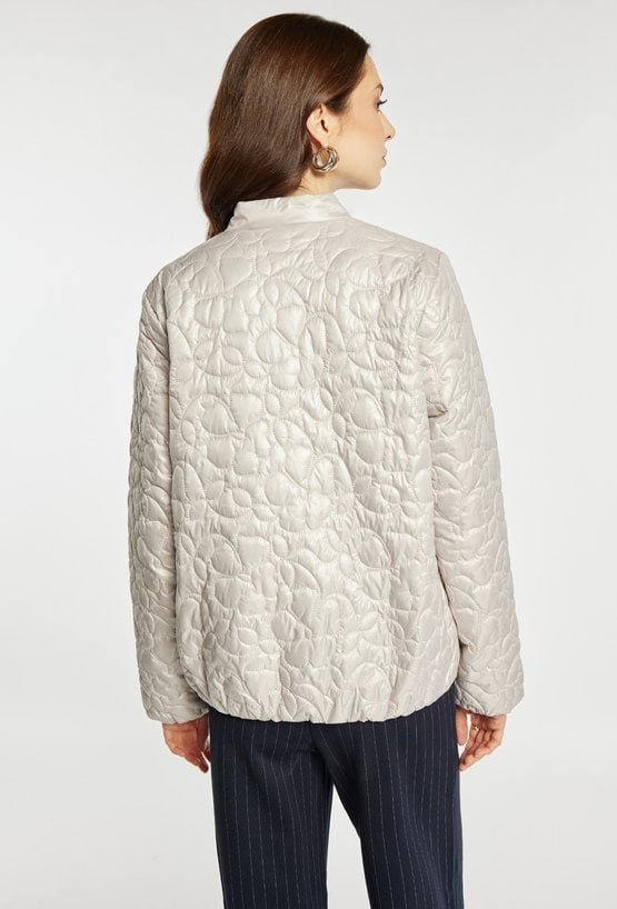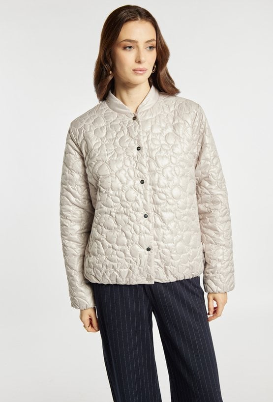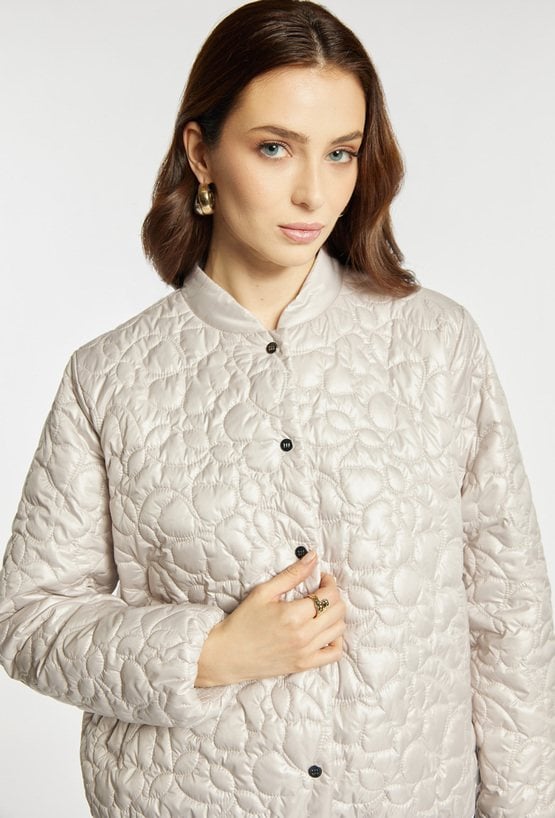 Kurtka damska wykonana z pikowanego materiału o dekoracyjnym wzorze. Kurtka o prostym kroju z długim rękawem i stójką sprawdzi się idealnie w przejściowym sezonie. Model zapinany na napy, z praktycznymi kieszeniami, dobrze uzupełni codzienne i bardziej eleganckie stylizacje. Modelka na zdjęciu ma 177 cm wzrostu i prezentuje rozmiar 36.
