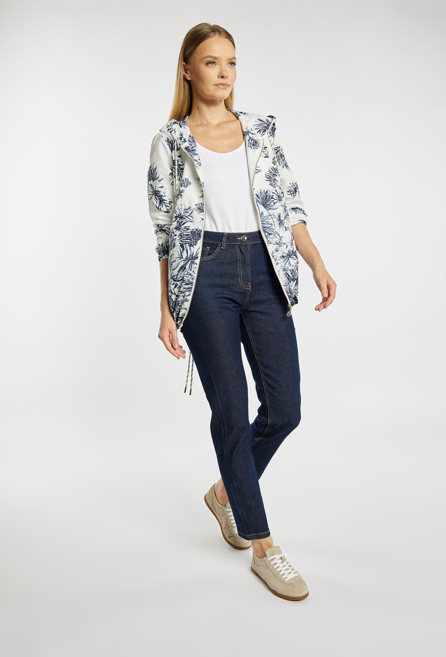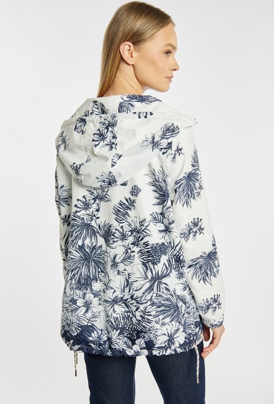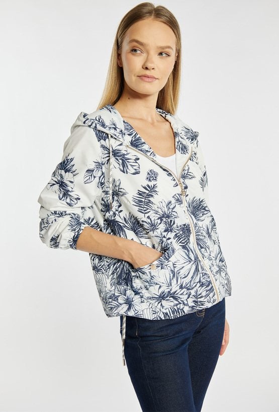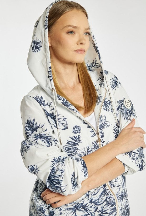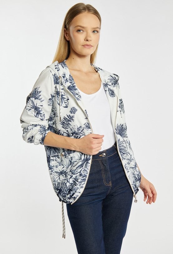 Kurtka damska o luźnym kroju z długim rękawem. Model zapinany na suwak z kapturem oraz praktycznymi kieszeniami, który zapewnia wygodę i funkcjonalność. Efektowny, roślinny wzór nadaje całości modnego i świeżego charakteru. Kurtka doskonale sprawdzi się w codziennych i sportowych stylizacjach, na chłodniejsze dni. Modelka na zdjęciu ma 177 cm wzrostu i prezentuje rozmiar 36.