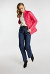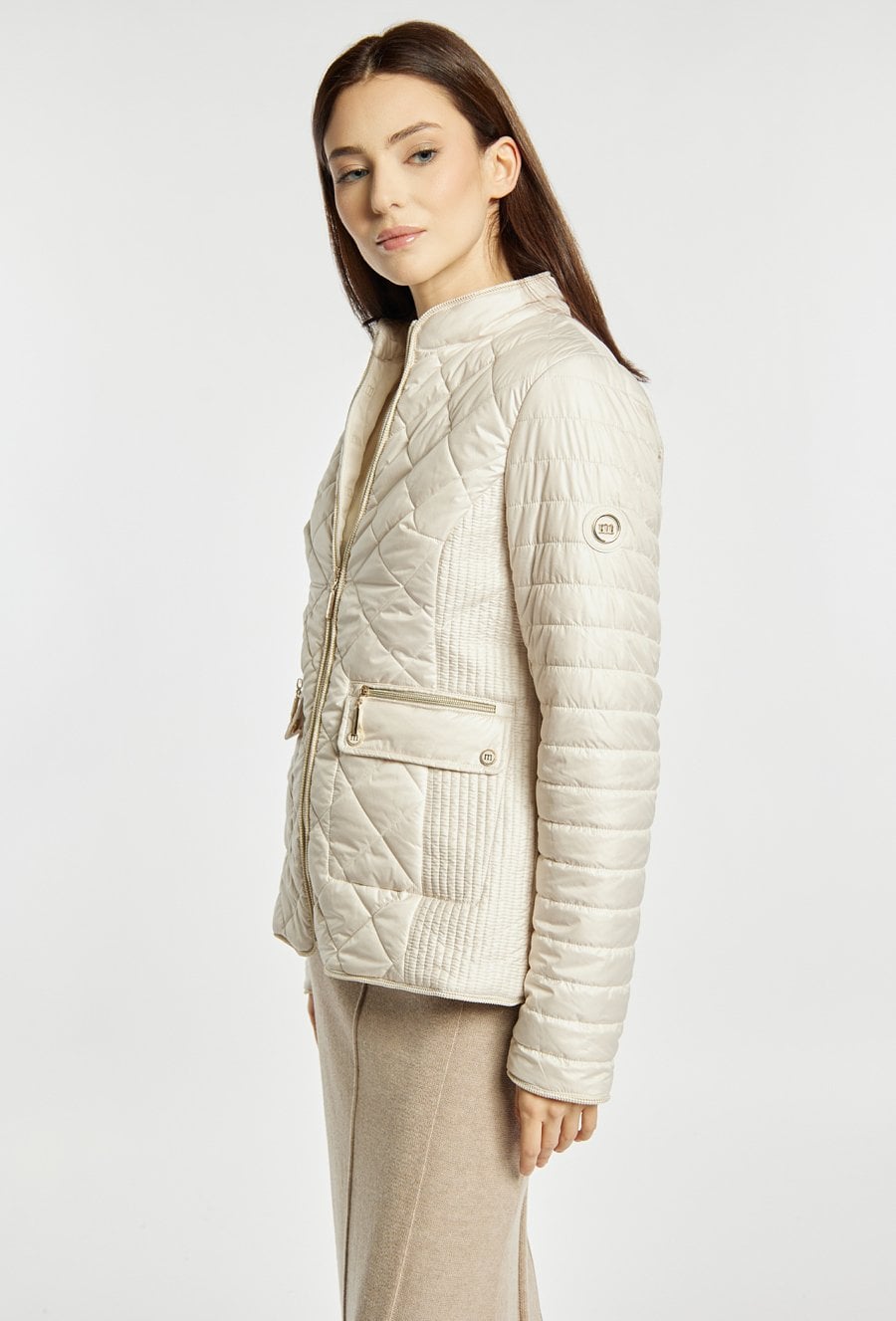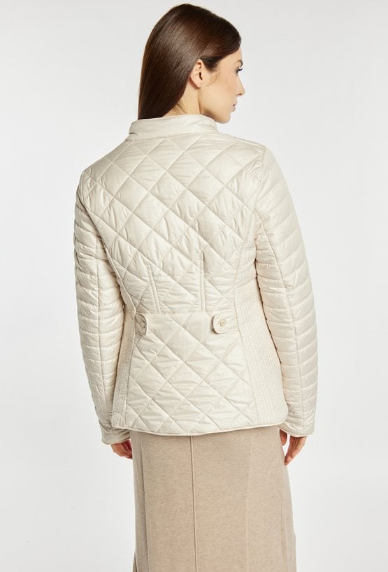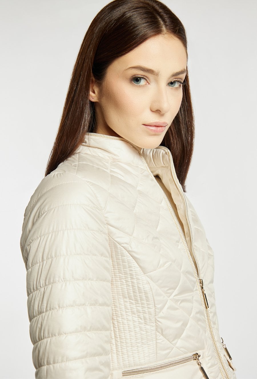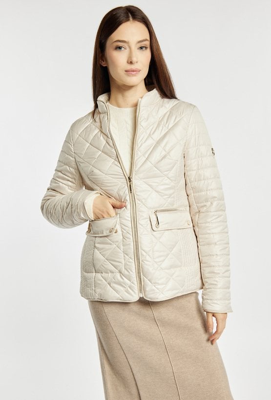 Lekka, pikowana kurtka damska, idealna na wczesną wiosnę. Model z długimi rękawami, kieszeniami zapinanymi na suwaki oraz ozdobnymi patkami, które dodają całości stylowego charakteru. Modelka na zdjęciu ma 177 cm wzrostu i prezentuje rozmiar 36.