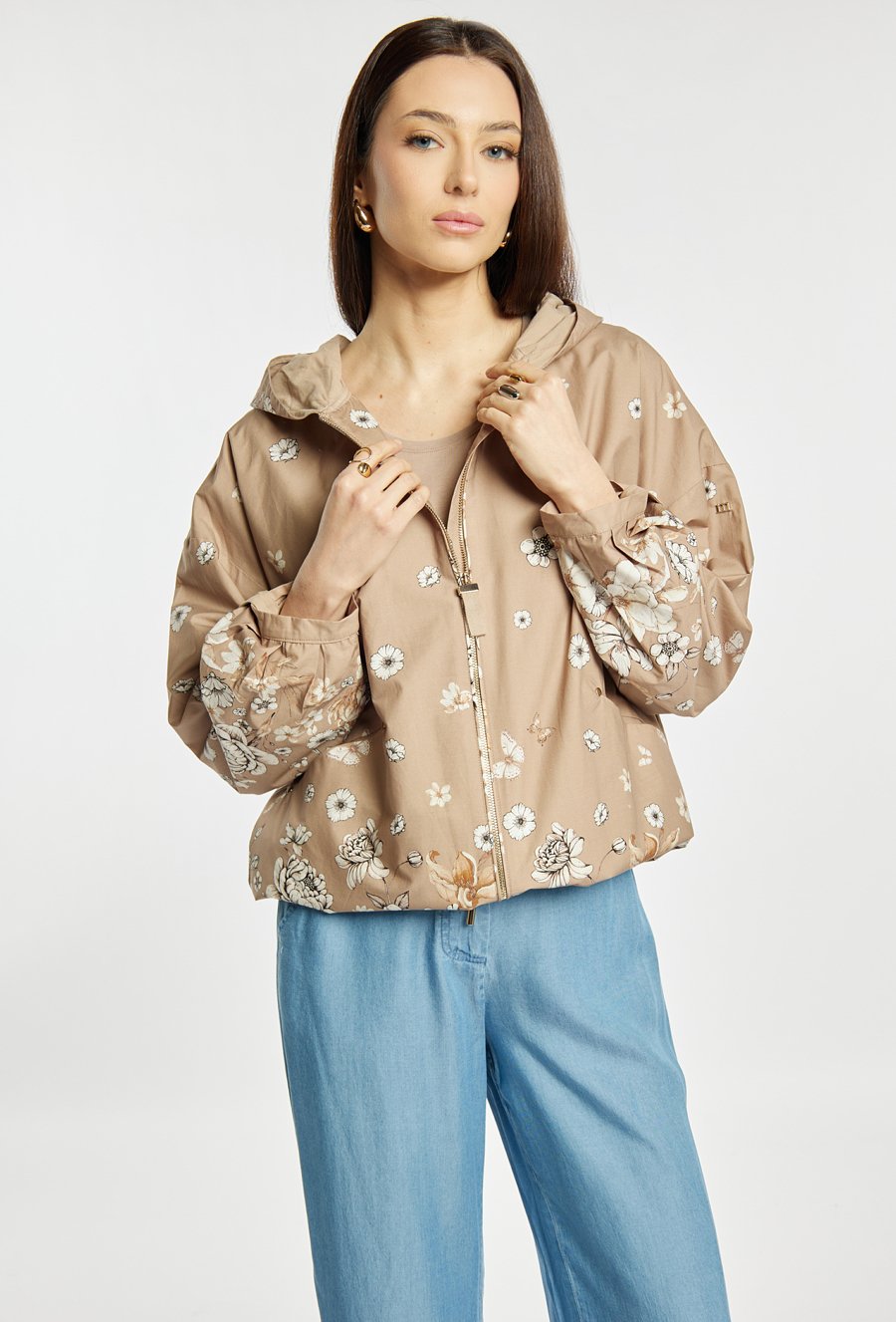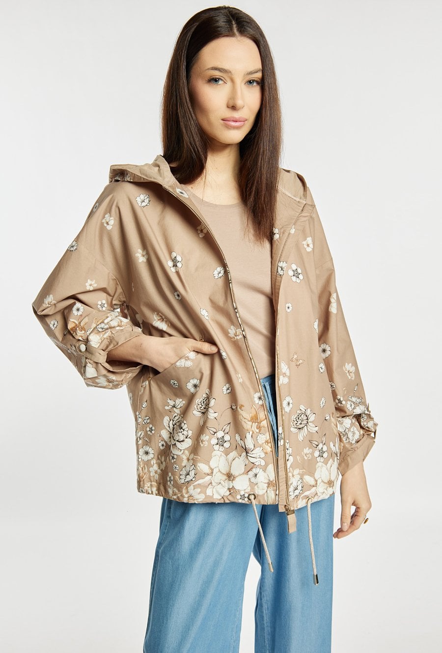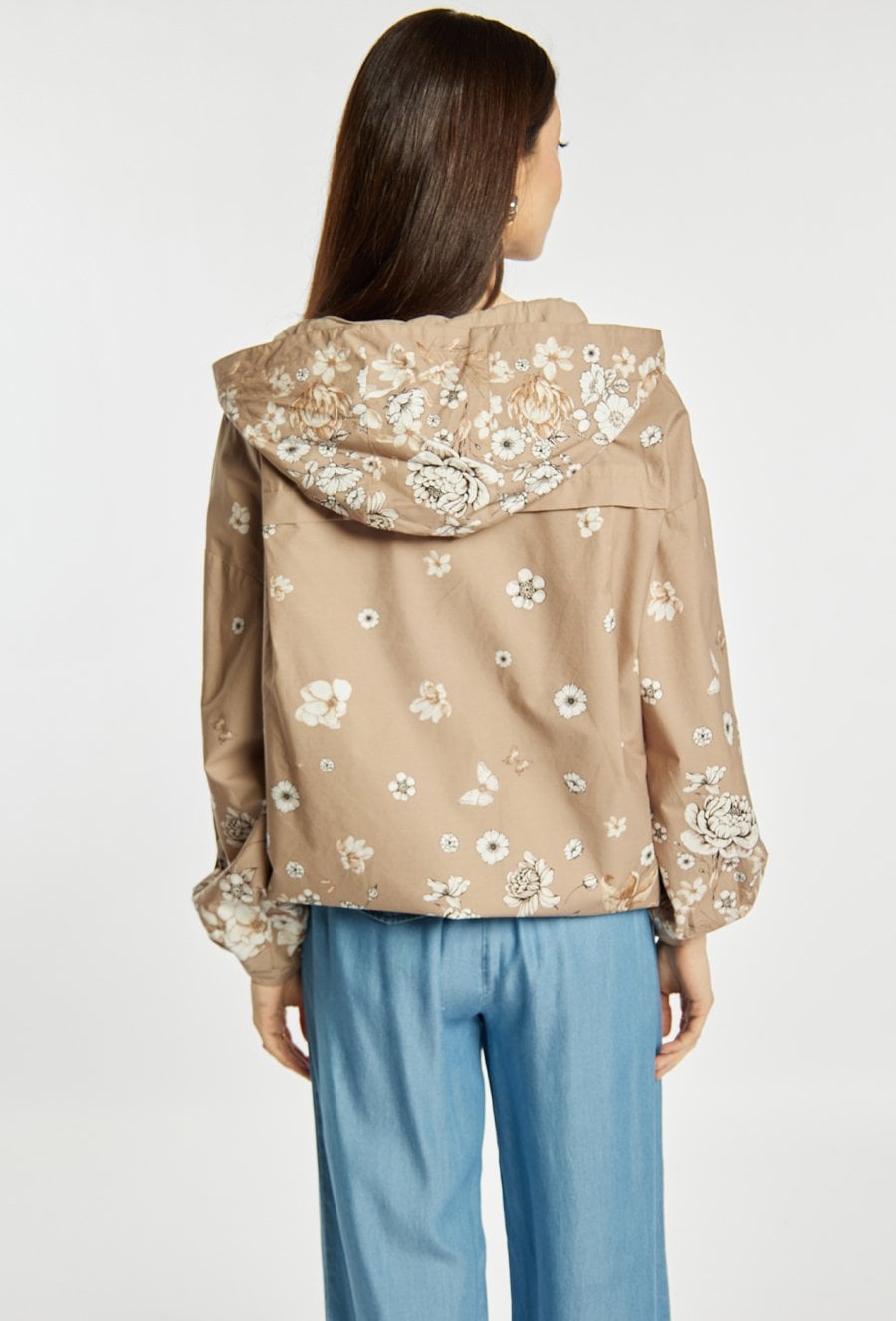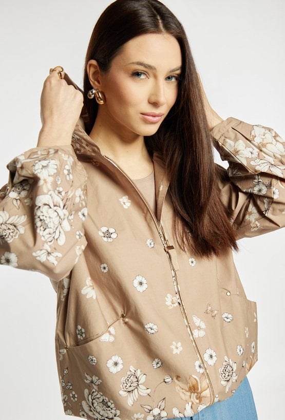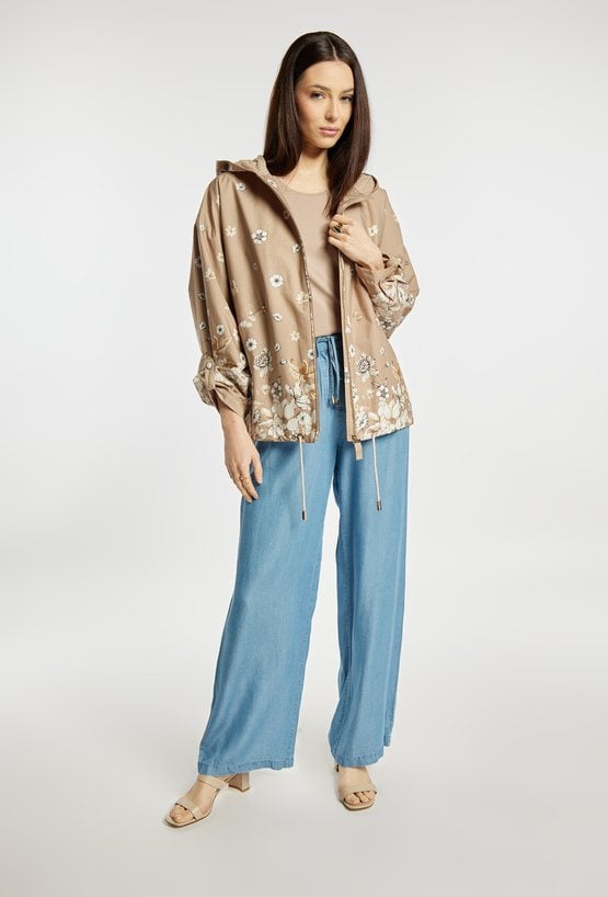 Kurtka damska o swobodnym, komfortowym kroju. Model z kapturem oraz wzorem. Kurtka dobrze sprawdzi się w codziennych stylizacjach w sezonie przejściowym, łącząc wygodę z kobiecym, delikatnym wyglądem. Modelka na zdjęciu ma 177 cm wzrostu i prezentuje rozmiar 36.