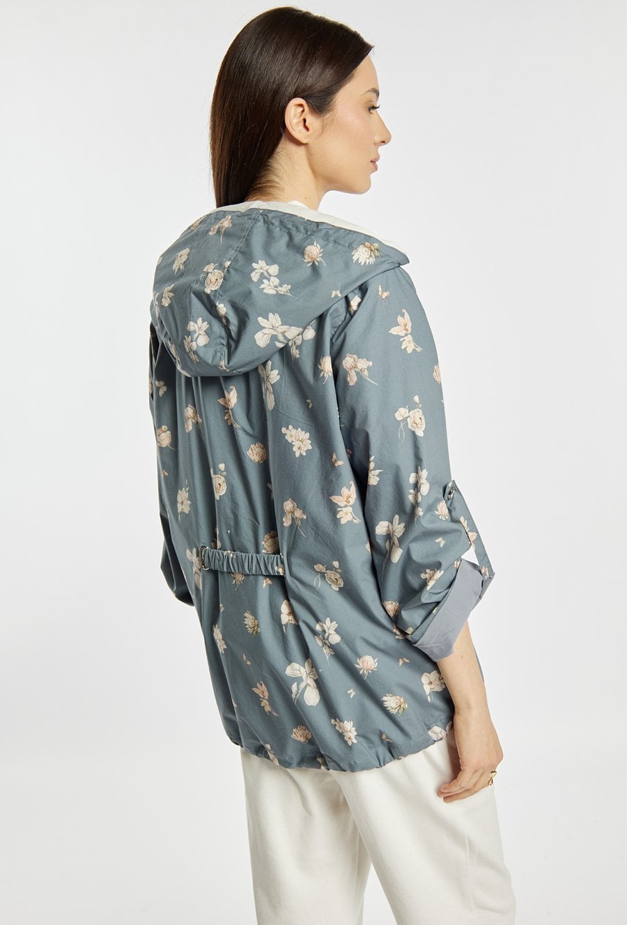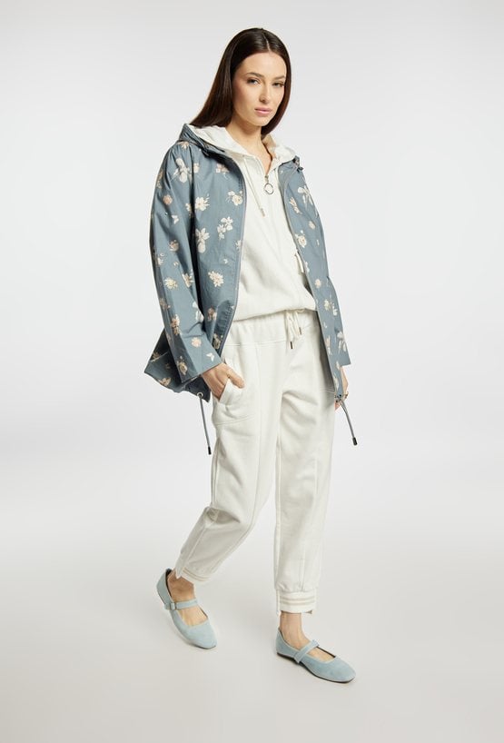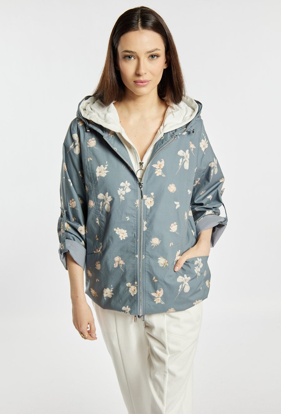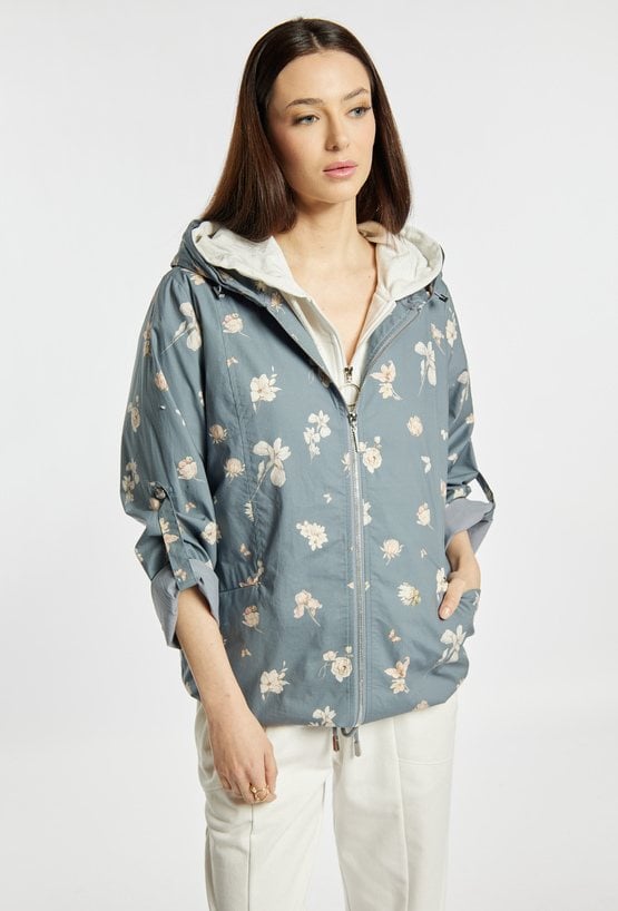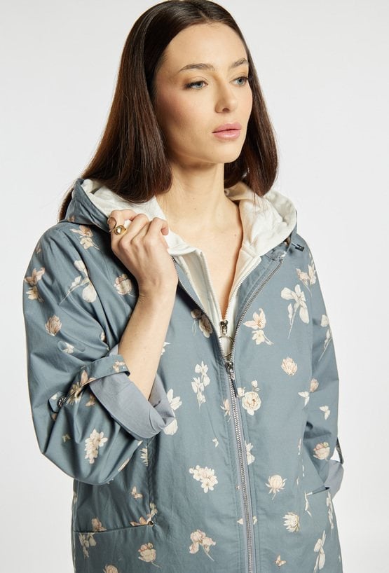 Kurtka damska o swobodnym kroju z delikatnym wzorem na całej powierzchni. Model zapinany na zamek, z praktycznym kapturem i rękawami z możliwością podwinięcia. Kurtka dobrze sprawdzi się w codziennych stylizacjach w sezonie przejściowym, łącząc wygodę z kobiecym, świeżym wyglądem. Modelka na zdjęciu ma 177 cm wzrostu i prezentuje rozmiar 36.