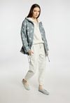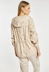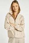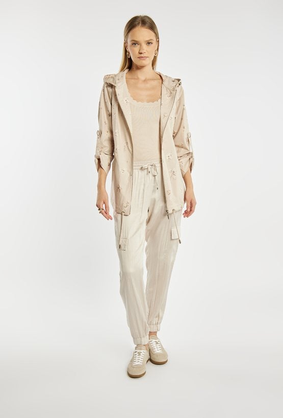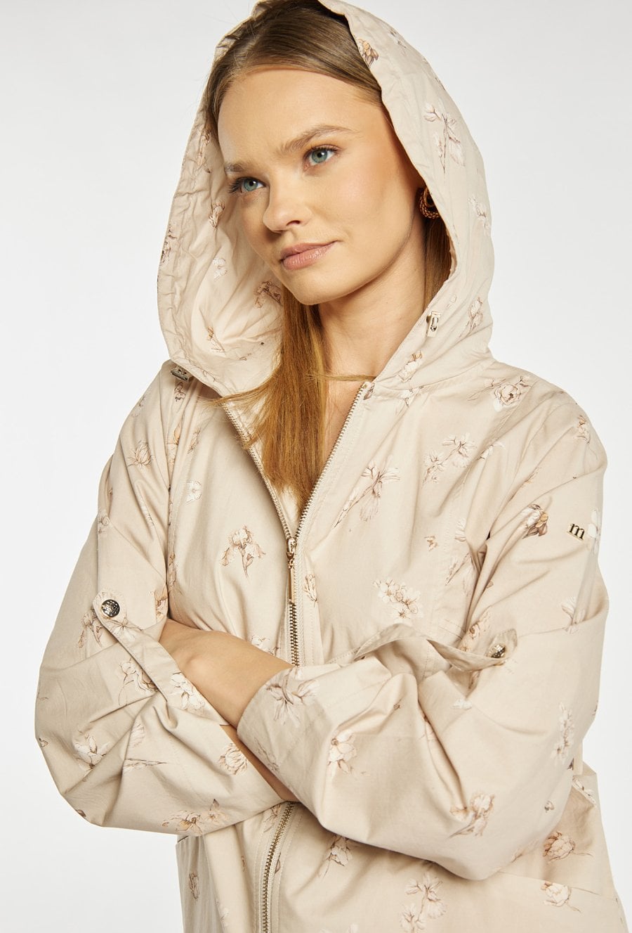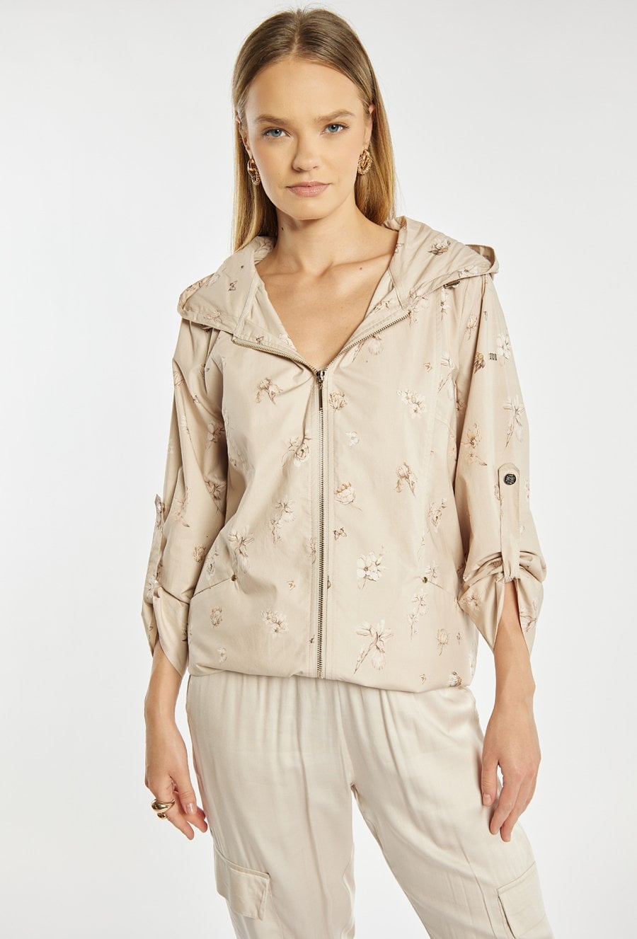 Kurtka damska o swobodnym kroju z delikatnym wzorem na całej powierzchni. Model zapinany na zamek, z praktycznym kapturem i rękawami z możliwością podwinięcia. Kurtka dobrze sprawdzi się w codziennych stylizacjach w sezonie przejściowym, łącząc wygodę z kobiecym, świeżym wyglądem. Modelka na zdjęciu ma 177 cm wzrostu i prezentuje rozmiar 36.