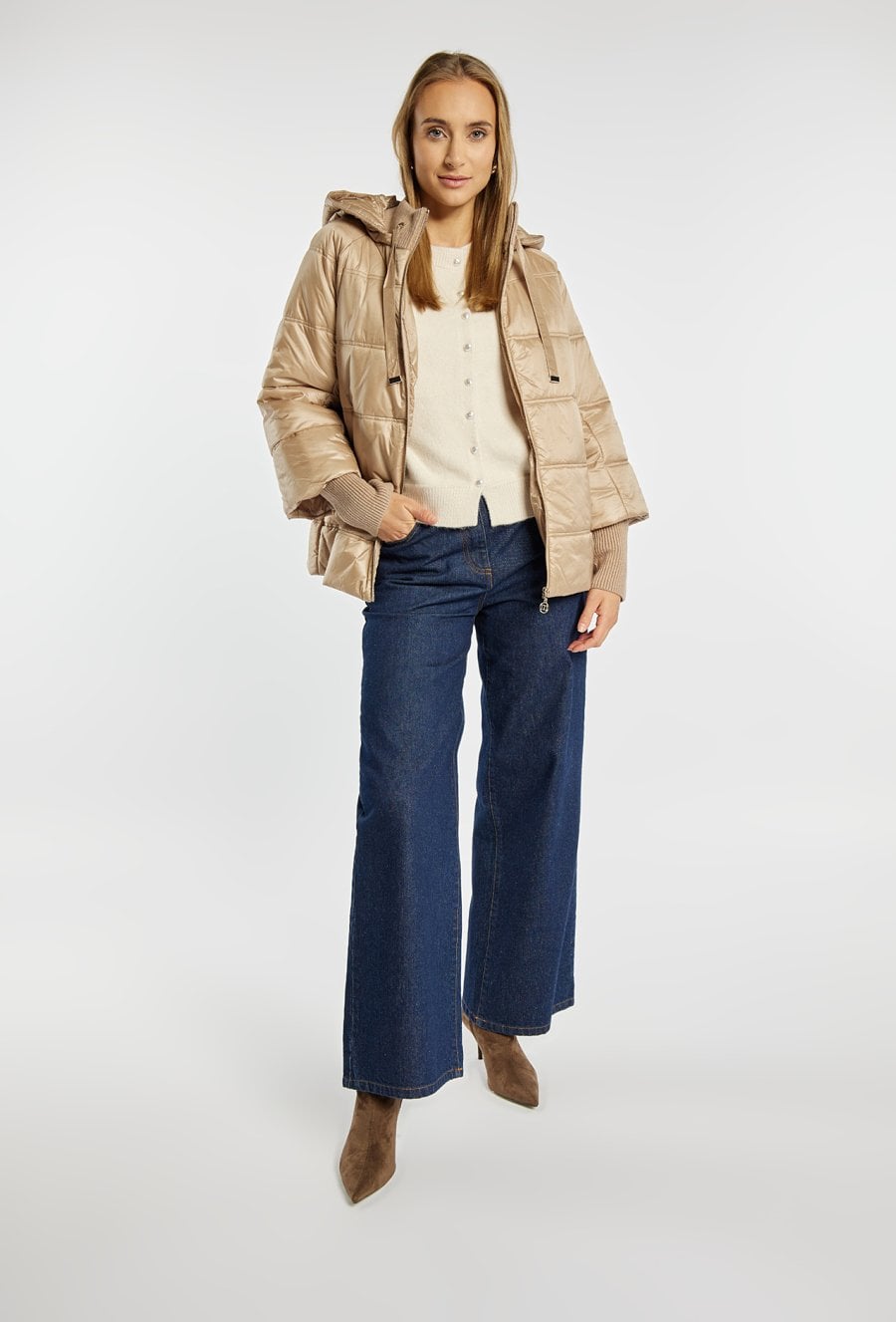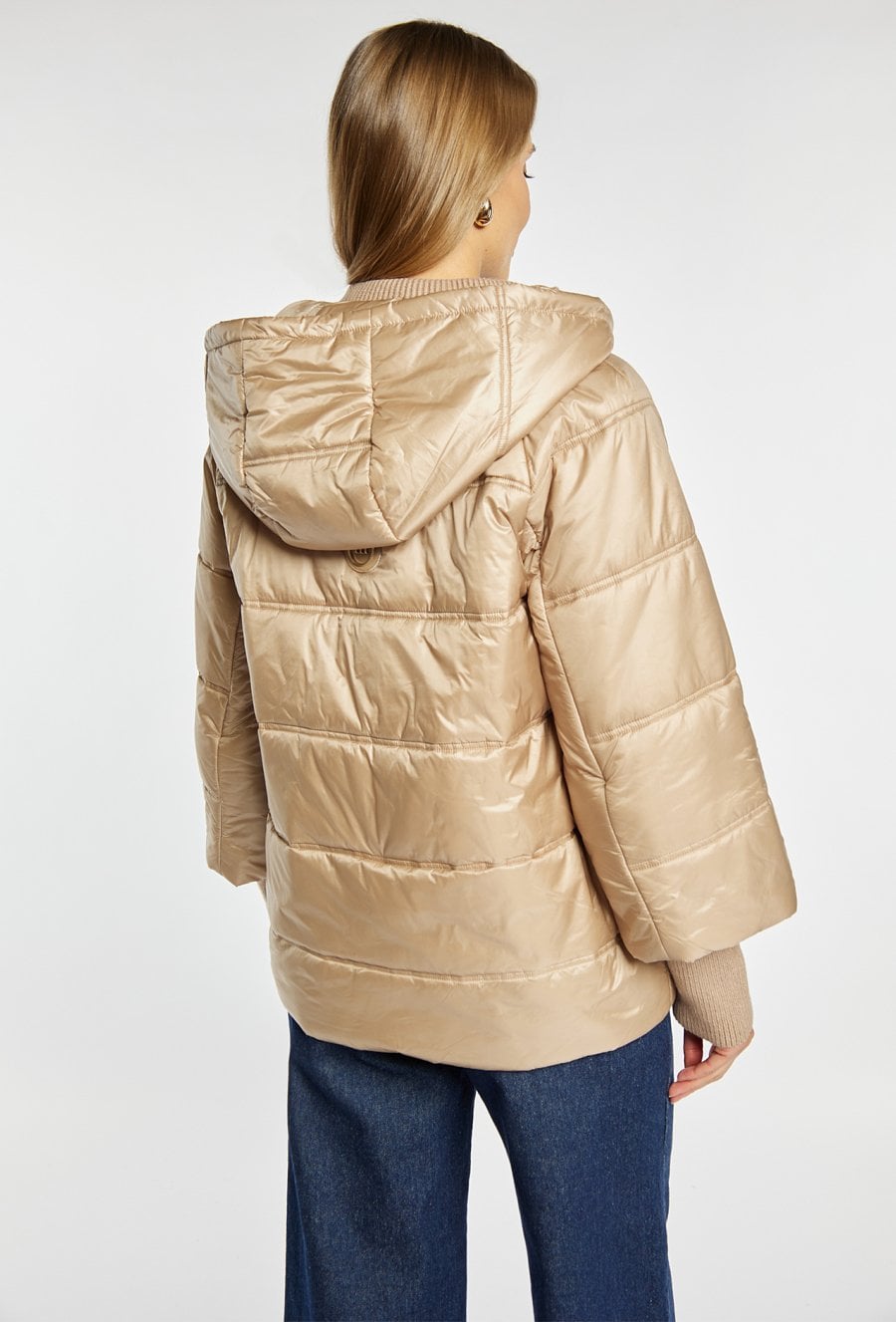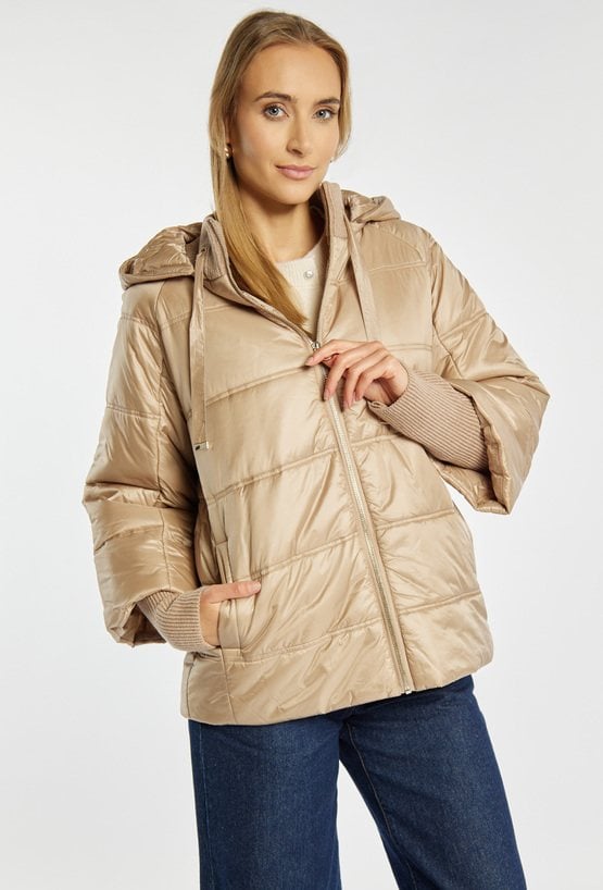 Lekka, wygodna kurtka o pikowanej strukturze, idealna na chłodniejsze dni. Kurtka z odpinanym kapturem pozwala łatwo zmienić jej charakter z bardziej sportowego na codzienny i uniwersalny. Model ma praktyczny zamek na całej długości oraz dwie kieszenie po bokach. Ściągacze przy rękawach dodają komfortu i chronią przed wiatrem, tworząc wygodne okrycie na co dzień. Modelka na zdjęciu ma 177 cm wzrostu i prezentuje rozmiar 36.