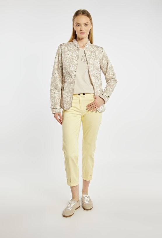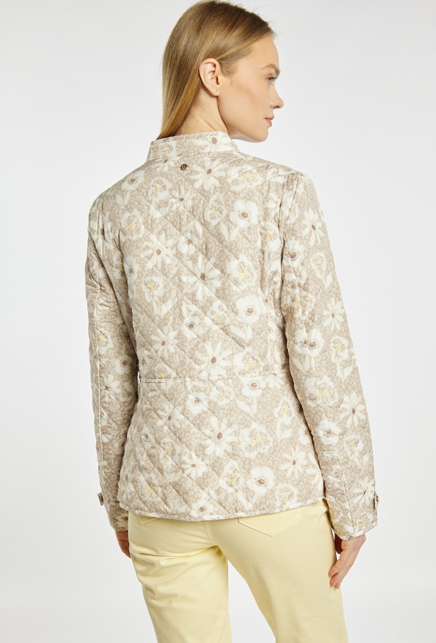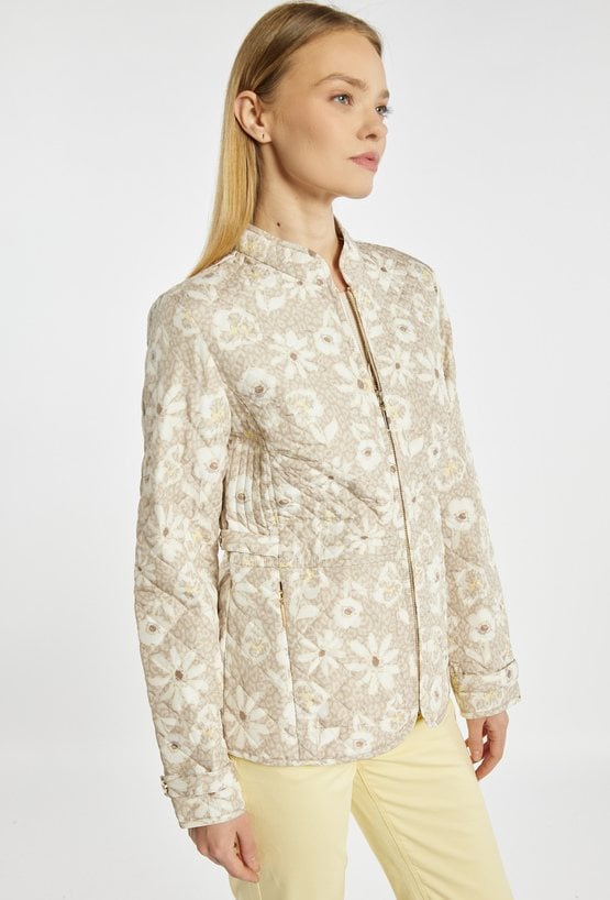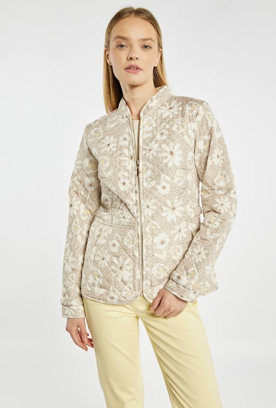 Kurtka damska o lekkim, pikowanym fasonie. Model zapinany na zamek błyskawiczny, z klasycznym kołnierzem i długimi rękawami. Dopasowany krój podkreśla sylwetkę, a kieszenie zwiększają funkcjonalność. Kurtka w subtelny, kwiatowy wzór w jasnej, neutralnej kolorystyce. Idealna na okres przejściowy. Modelka na zdjęciu ma 177 cm wzrostu i prezentuje rozmiar 36.