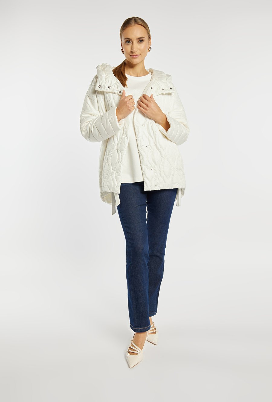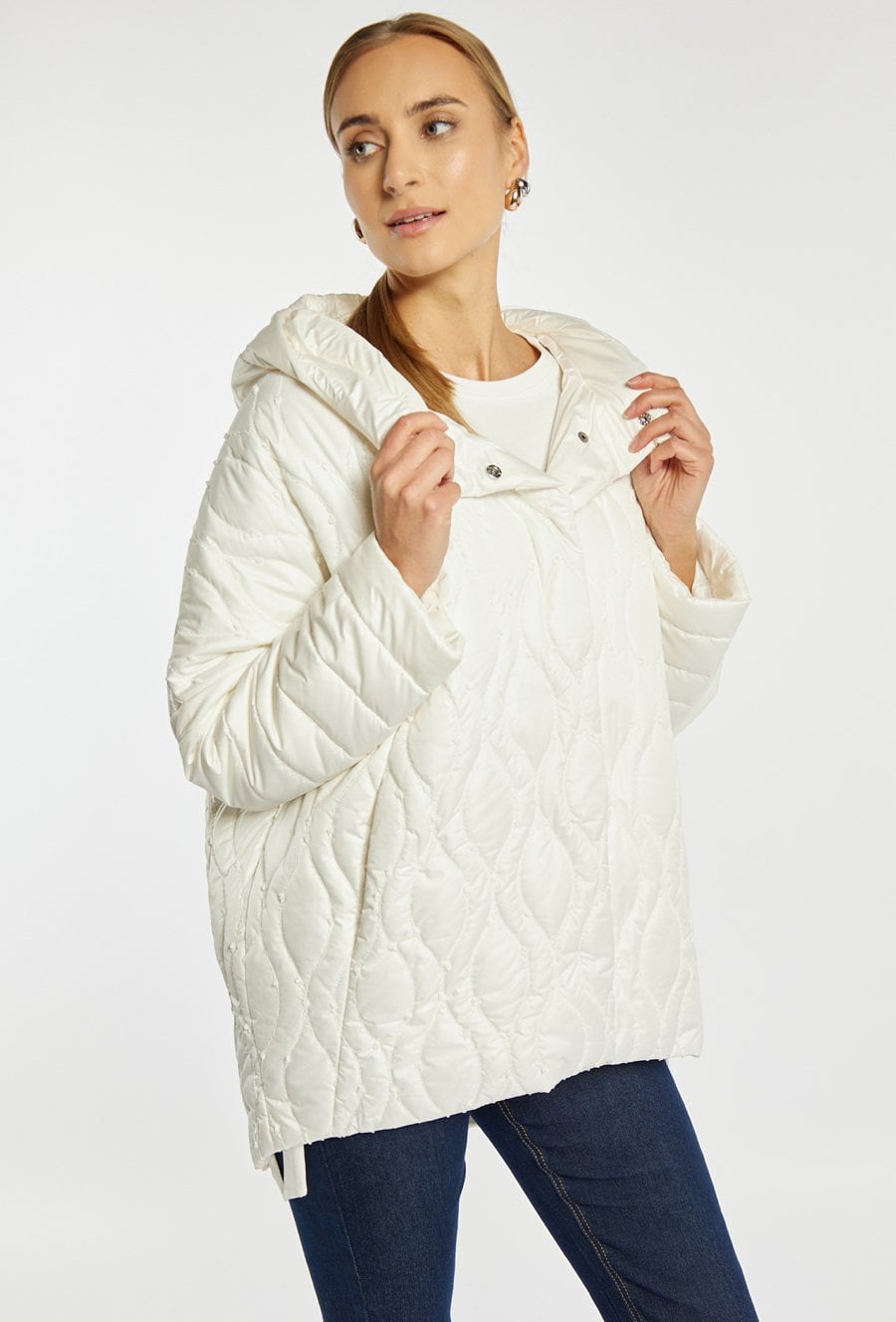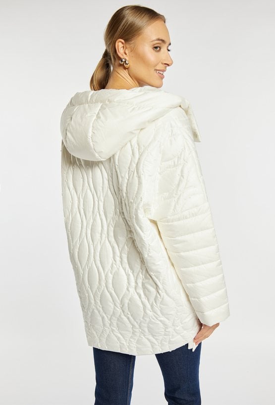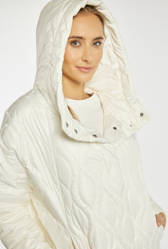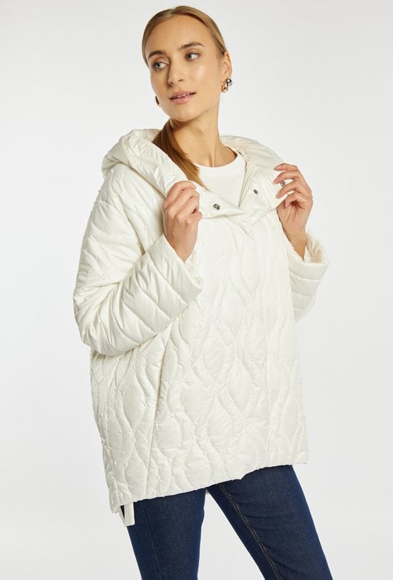 Lekka, pikowana kurtka na sezon przejściowy z odpinanym kapturem. Ma wygodny, swobodny fason i praktyczne kieszenie po bokach. Delikatne pikowanie dodaje jej eleganckiego wykończenia. Model dobrze układa się na sylwetce i sprawdza się zarówno na co dzień, jak i do bardziej klasycznych zestawów. Modelka na zdjęciu ma 177 cm wzrostu i prezentuje rozmiar S/M.
