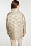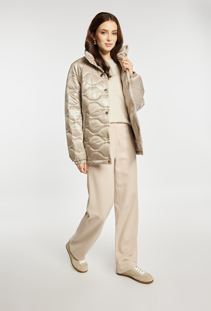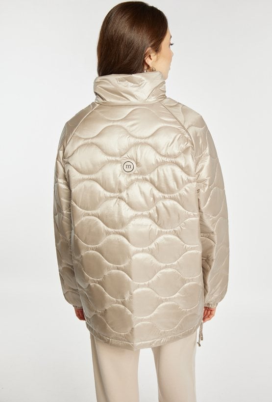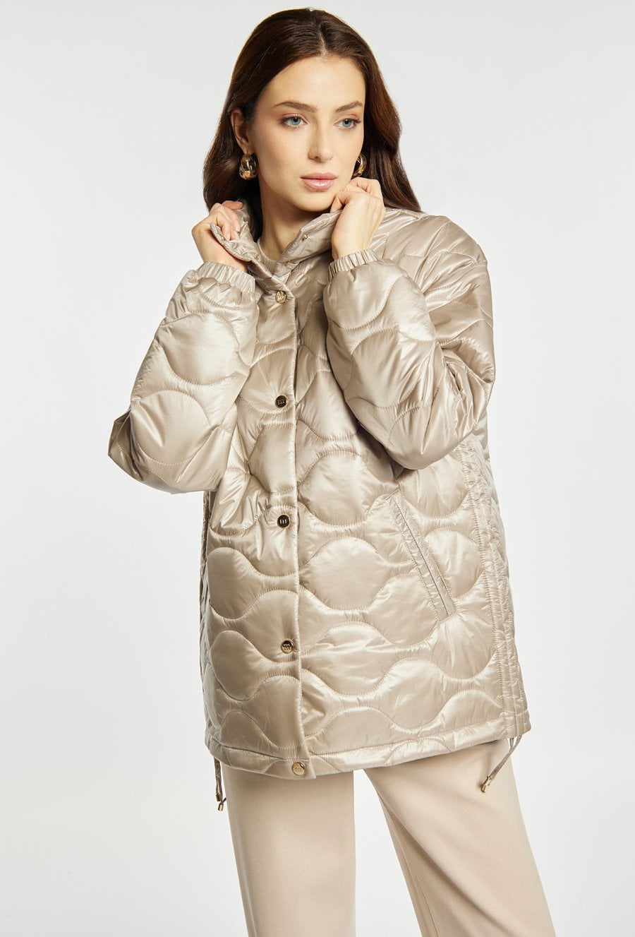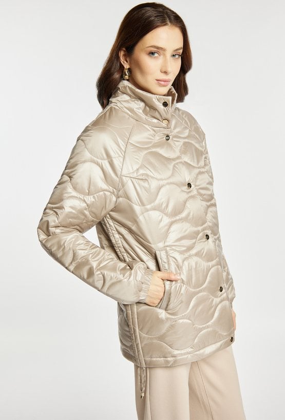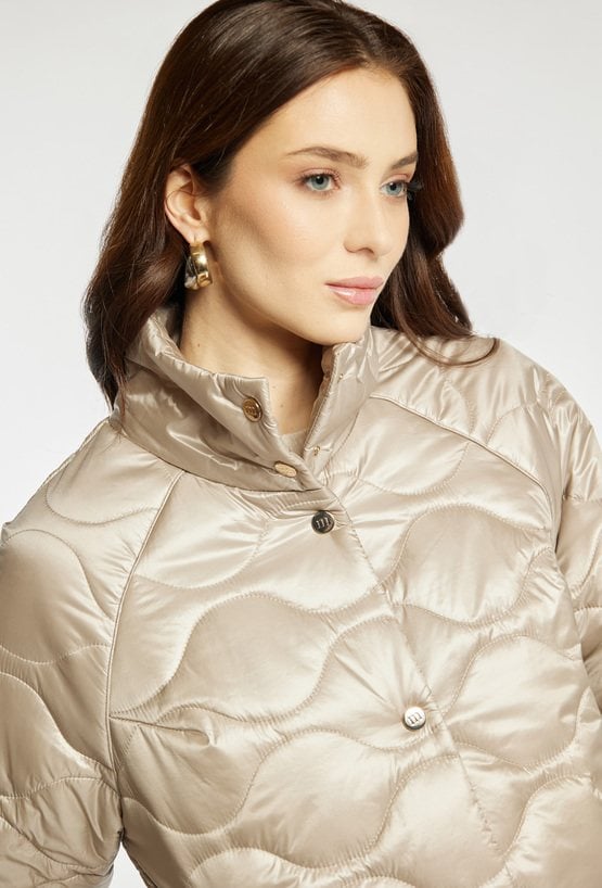 Lekka, pikowana kurtka damska. Model o luźniejszym kroju, z ozdobnym pikowaniem w kształt delikatnych fal, które nadają całości nowoczesny charakter. Kurtka posiada stójkę chroniącą przed wiatrem, długie rękawy oraz zapięcie na napy i suwak, zapewniające wygodę noszenia. Modelka na zdjęciu ma 177 cm wzrostu i prezentuje rozmiar 36.