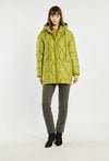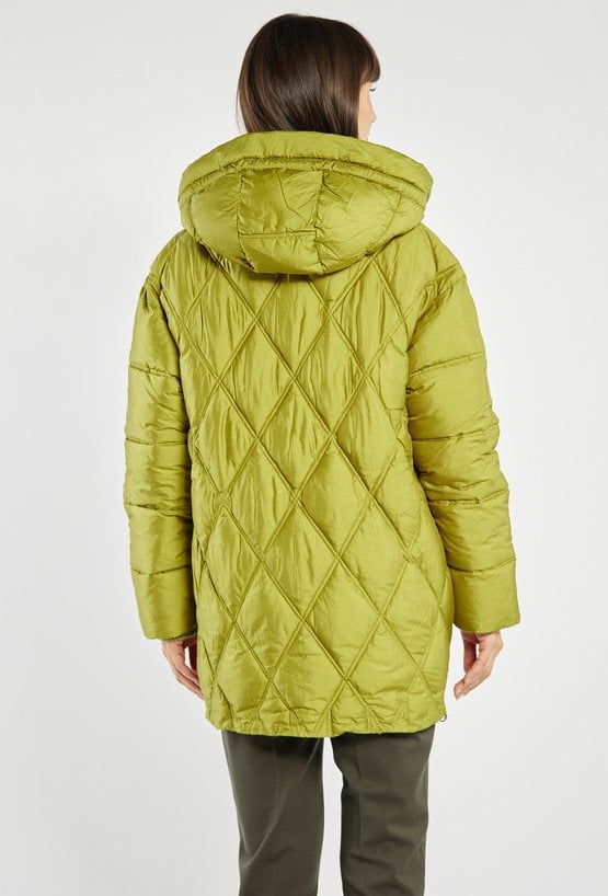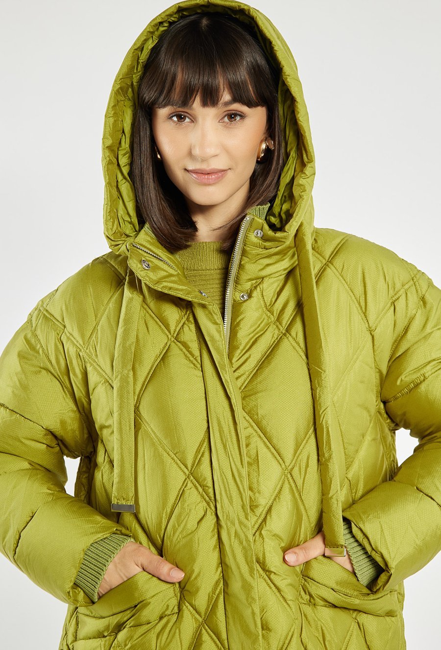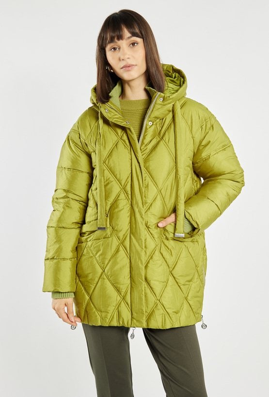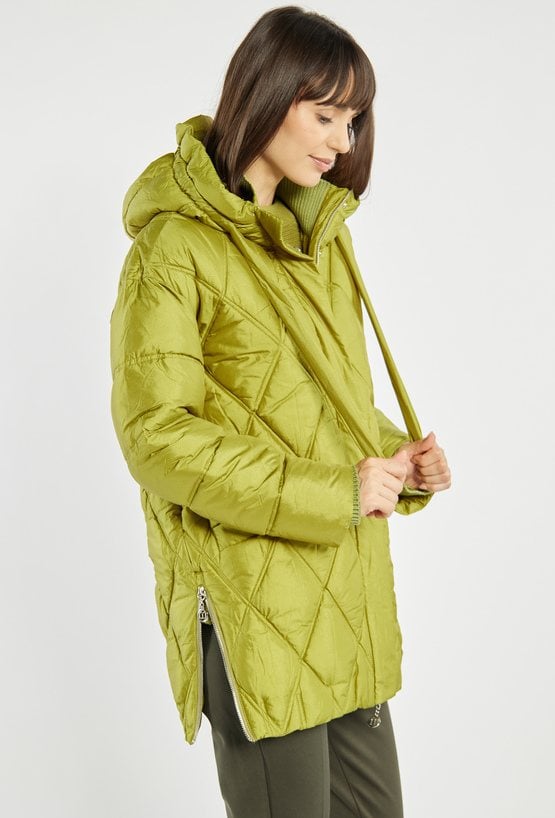 Pikowana kurtka damska o nowoczesnym kroju. Model ma praktyczny kaptur z troczkami oraz wygodne kieszenie. Po bokach znajdują się krótkie rozcięcia zapinane na suwaki, które dodają całości funkcjonalności i modnego charakteru. Idealna propozycja na chłodniejsze dni.