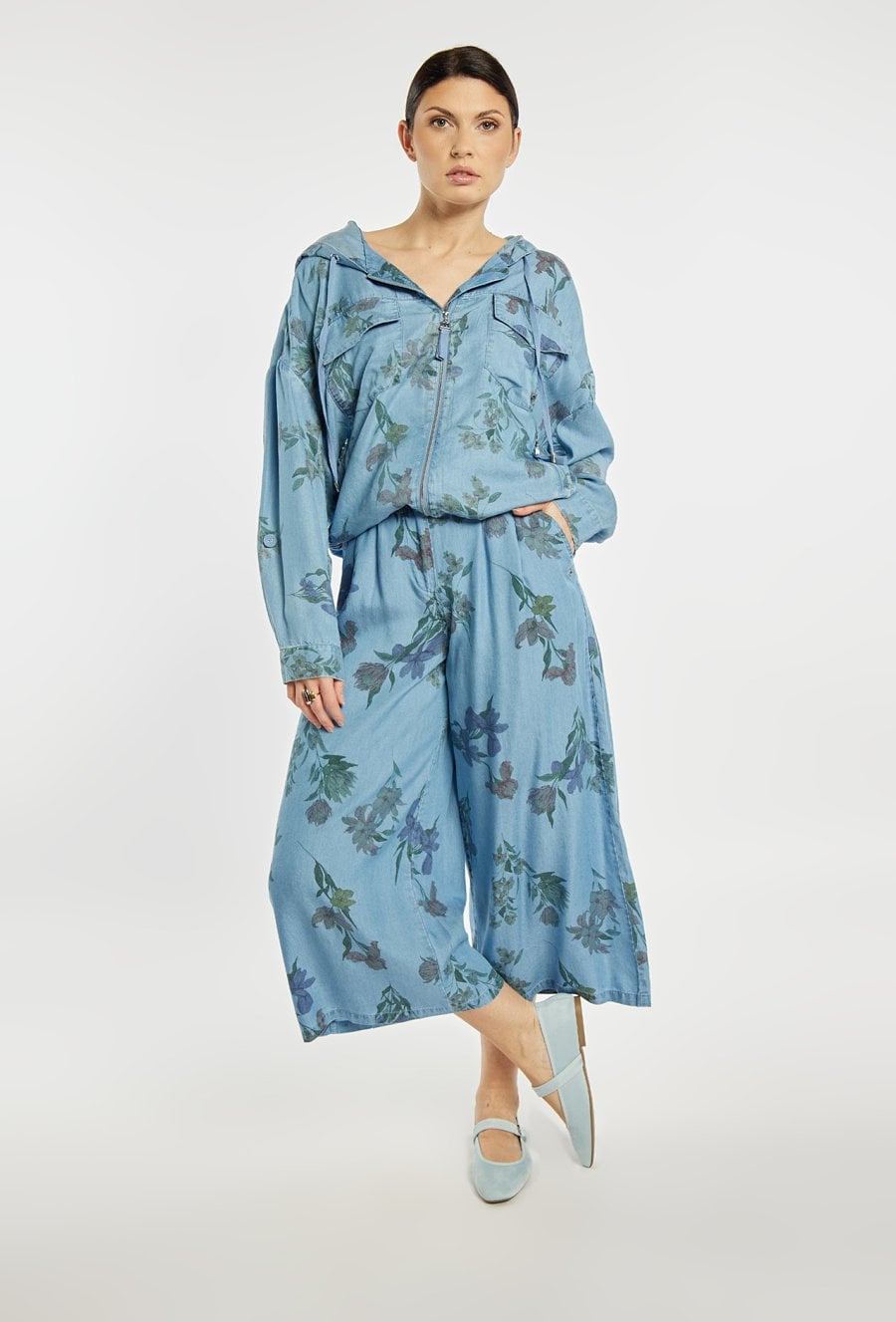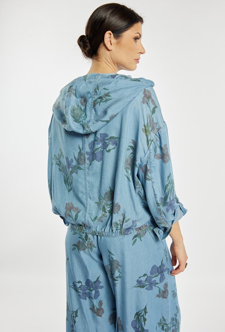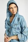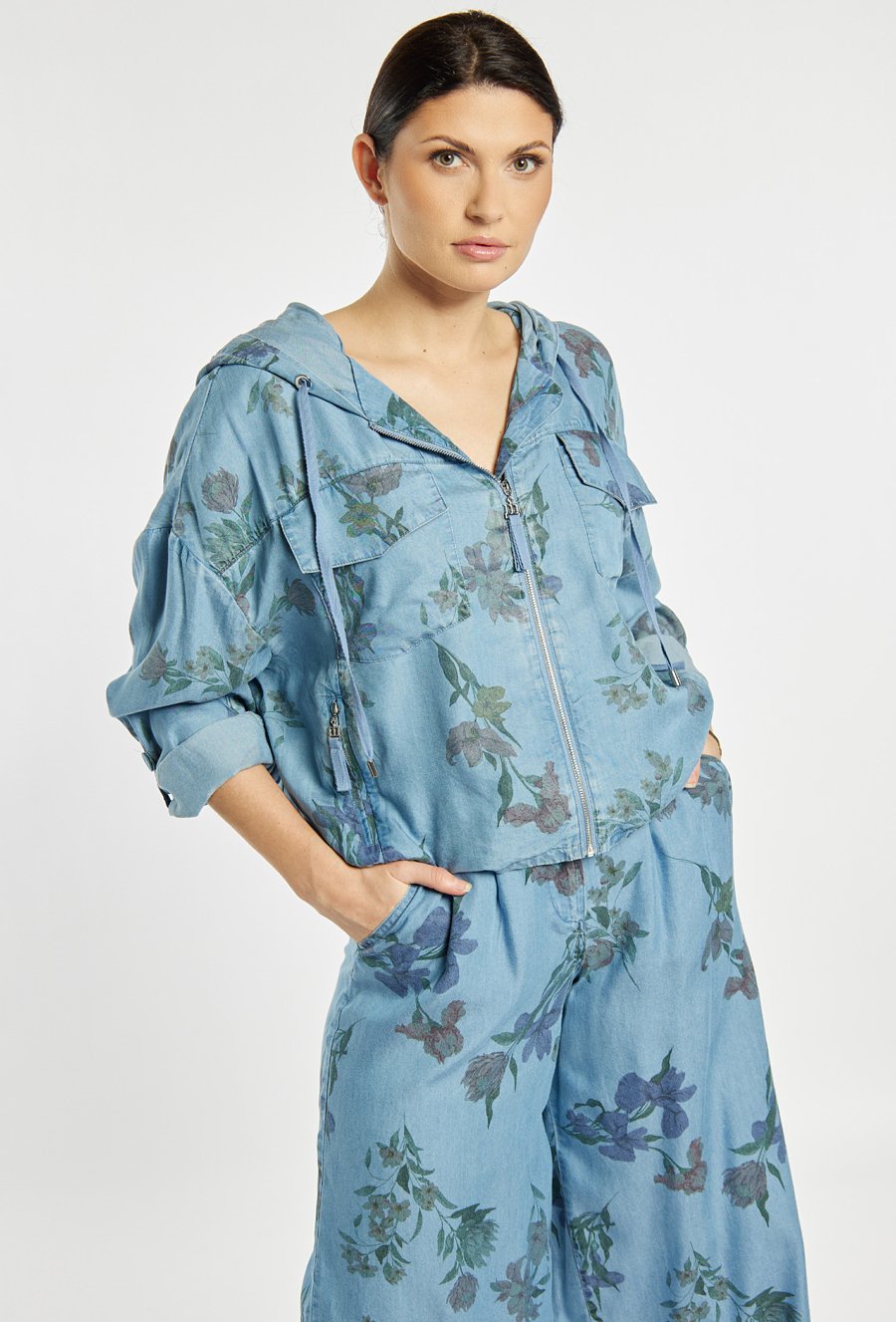 Stylowa kurtka damska o luźnym kroju z długim rękawem. Model zapinany na zamek, z kapturem oraz praktycznymi kieszeniami, ozdobiony delikatnym kwiatowym wzorem. Kurtka doskonale sprawdzi się w codziennych i casualowych stylizacjach, zapewniając komfort i modny wygląd. Modelka na zdjęciu ma 177 cm wzrostu i prezentuje rozmiar 36.