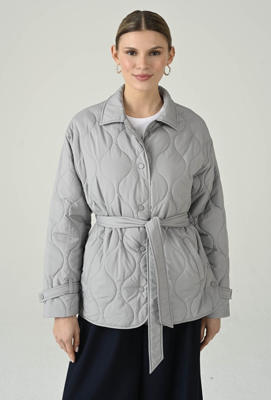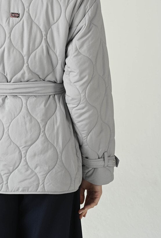 Wiosenno-jesienna kurtka z modnym pikowaniem, która łączy elegancję z praktycznym fasonem. Materiałowy pasek w talii subtelnie podkreśla sylwetkę, a podszewka zapewnia komfort noszenia. Zapinana na guziki, z klasycznym kołnierzykiem i dwiema wsuwanymi kieszeniami, oferuje wygodę i funkcjonalność. Możliwość regulacji szerokości rękawa na dole pozwala na idealne dopasowanie do stylizacji i warunków pogodowych. Modelka na zdjęciu ma 177 cm wzrostu i prezentuje rozmiar 36.
