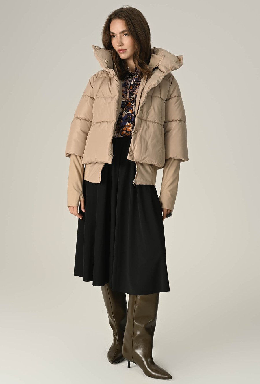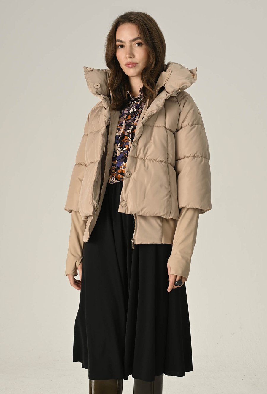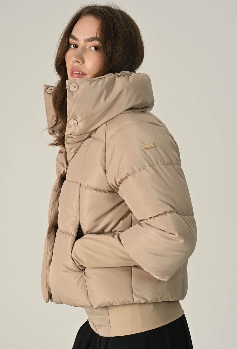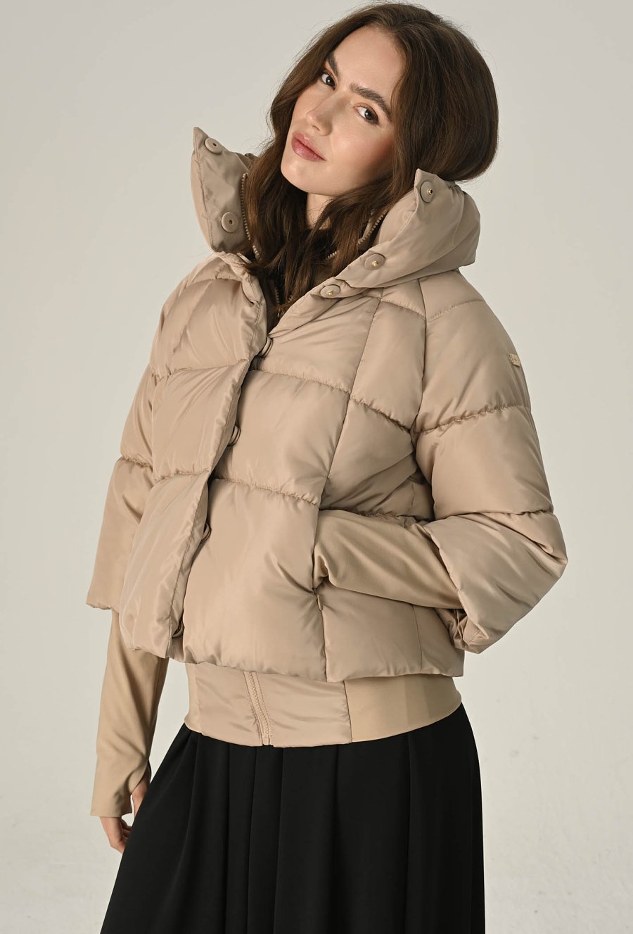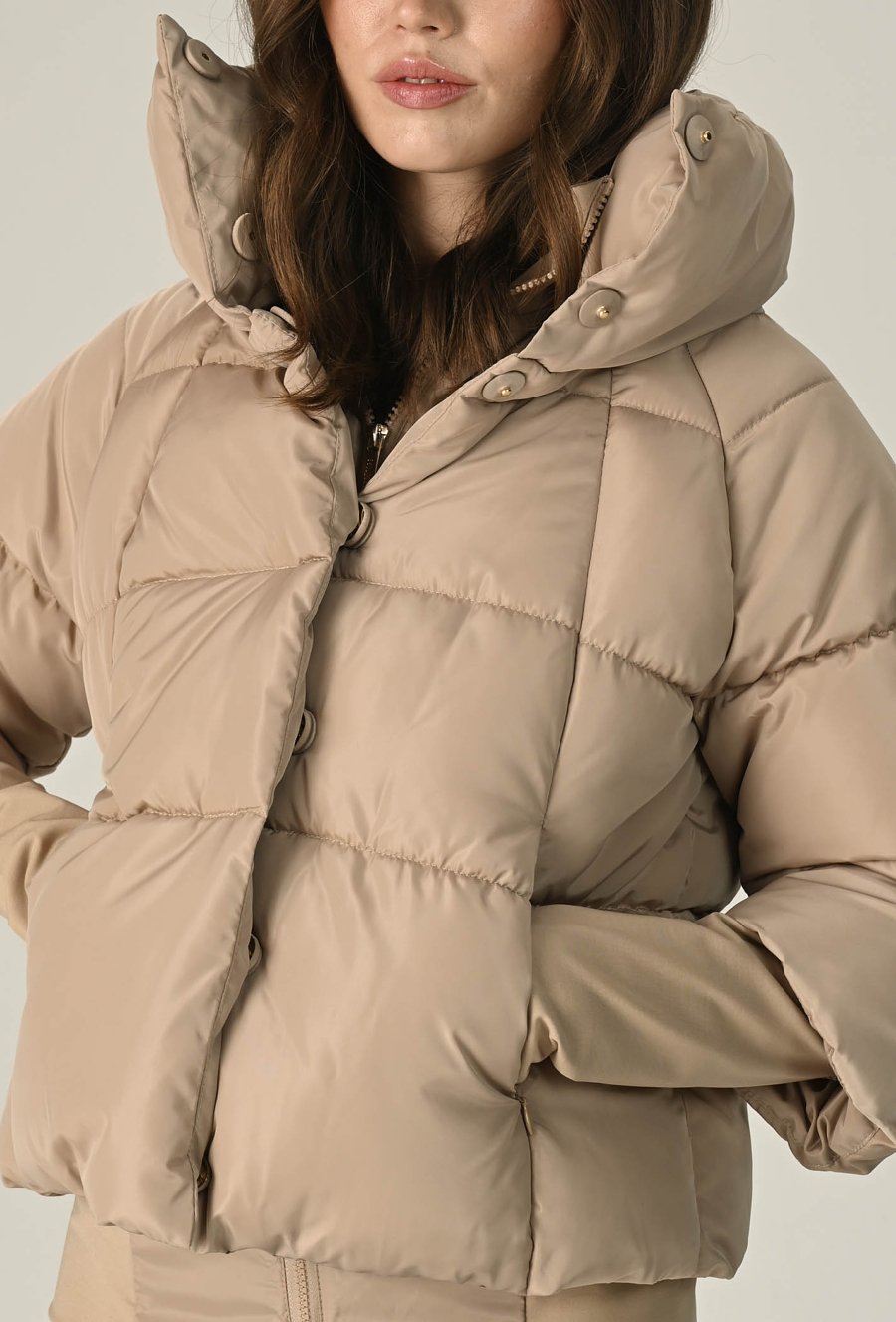 Stylowa, ciepła i wyjątkowo komfortowa — ta beżowa pikowana kurtka to idealny wybór na chłodniejsze dni. Wykonana z wysokiej jakości, gładkiego materiału o matowym wykończeniu, zapewnia doskonałą ochronę przed wiatrem i zimnem, a jednocześnie prezentuje się nowocześnie i elegancko. Krótszy, lekko pudełkowy fason pięknie podkreśla sylwetkę i świetnie komponuje się zarówno ze spodniami, jak i spódnicą. Wysoki kołnierz z możliwością zapięcia na napy dodaje całości charakteru i skutecznie chroni szyję przed chłodem. Kurtka posiada zapięcie na suwak i zatrzaski oraz wygodne boczne kieszenie. Modelka na zdjęciu ma 177 cm wzrostu i prezentuje rozmiar 36/S.