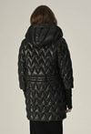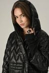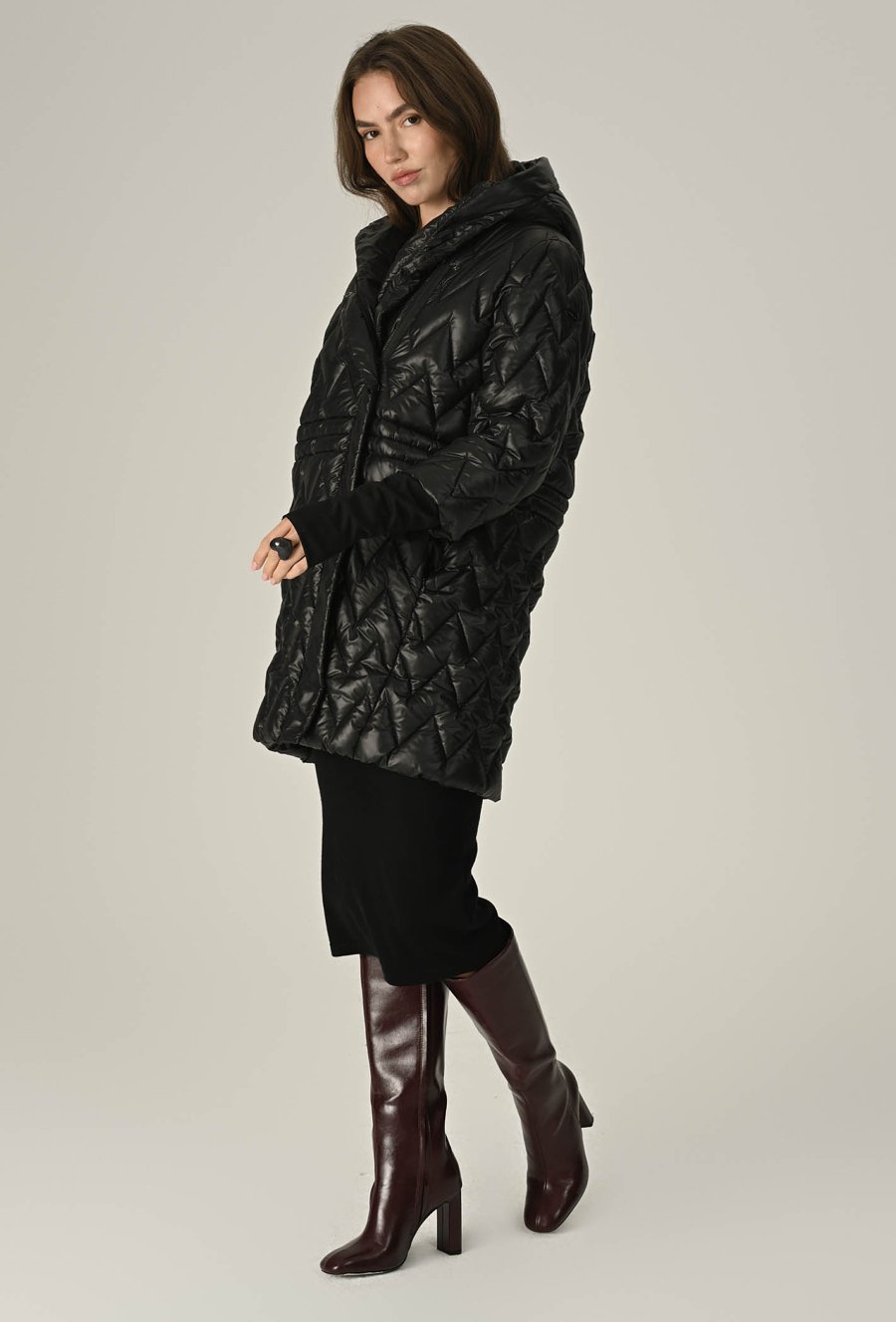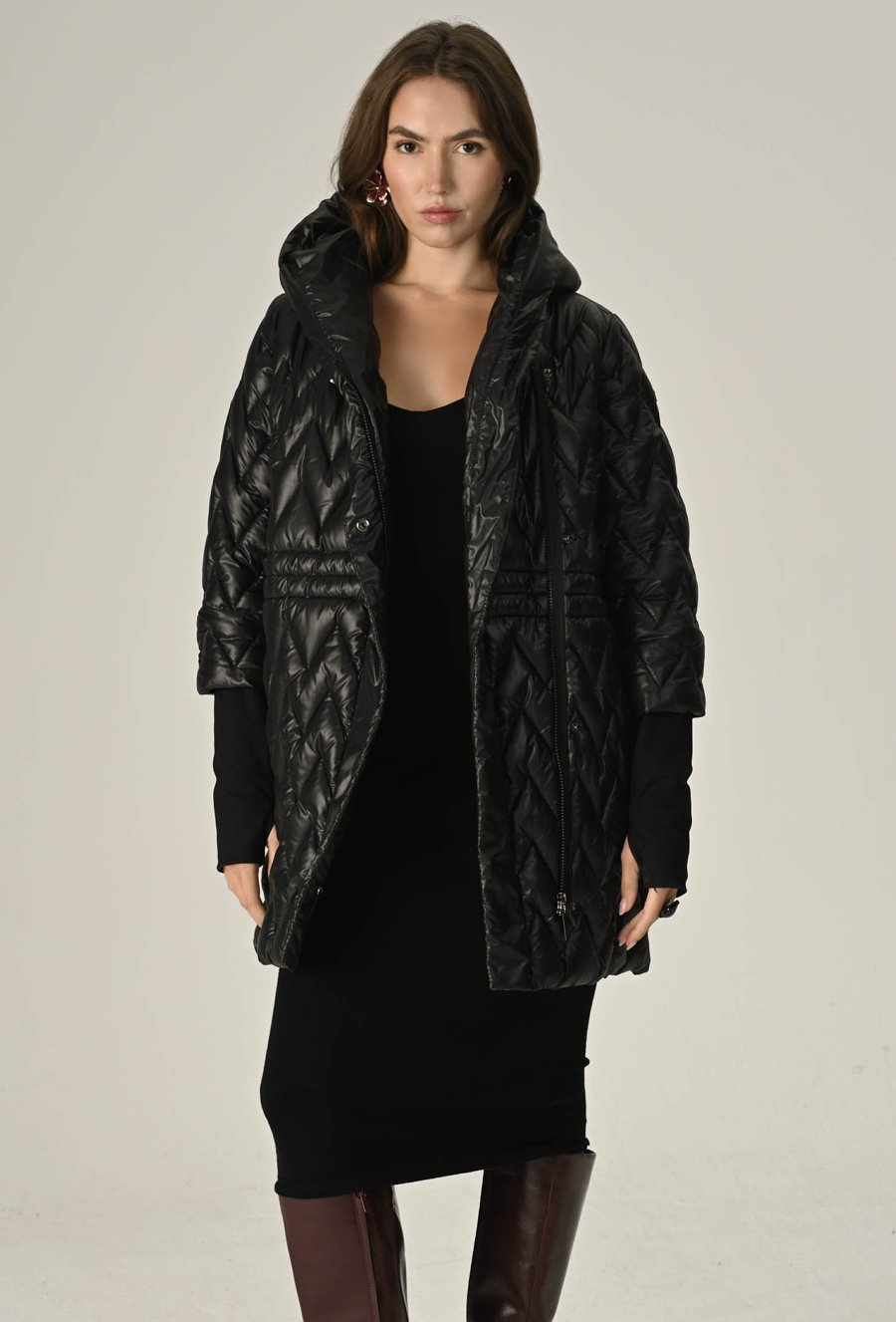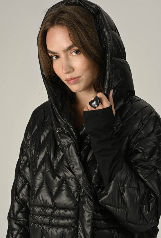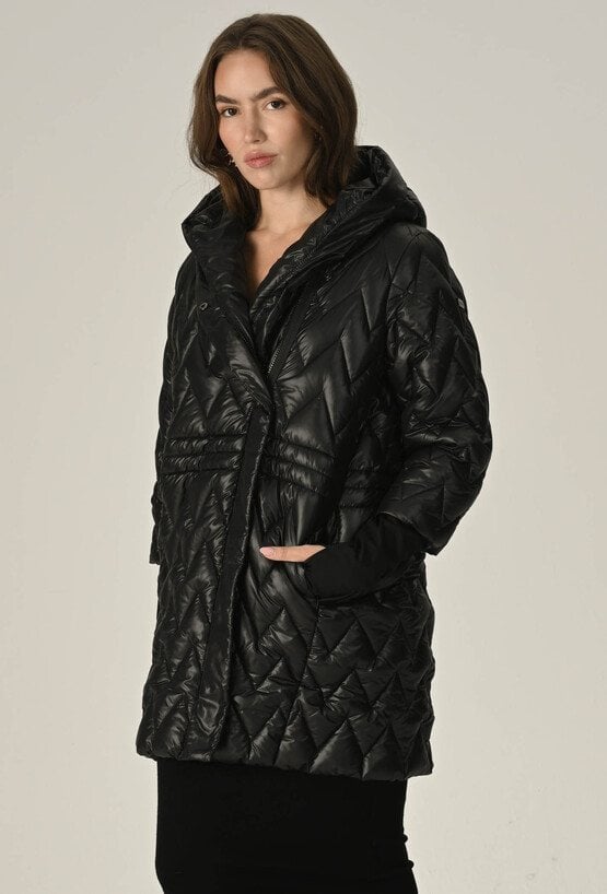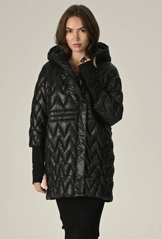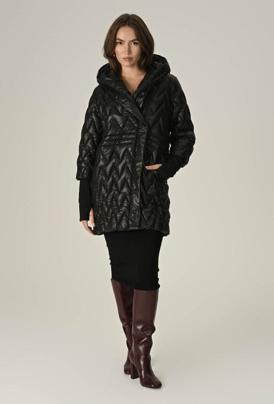 Dłuższa kurtka w klasycznym czarnym kolorze to doskonała propozycja na jesienne i zimowe chłody. Ten model jest niezwykle wygodny, ciepły a do tego bardzo kobiecy. Kurka zapinana jest na zatrzaski. Ma duży kaptur, dwie boczne kieszenie. Materiał ma ukośne paski na przodzie i poziome z tyłu co dodaje jej charakteru. . Modelka na zdjęciu ma 174 cm wzrostu i prezentuje rozmiar 36.