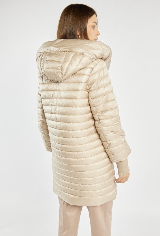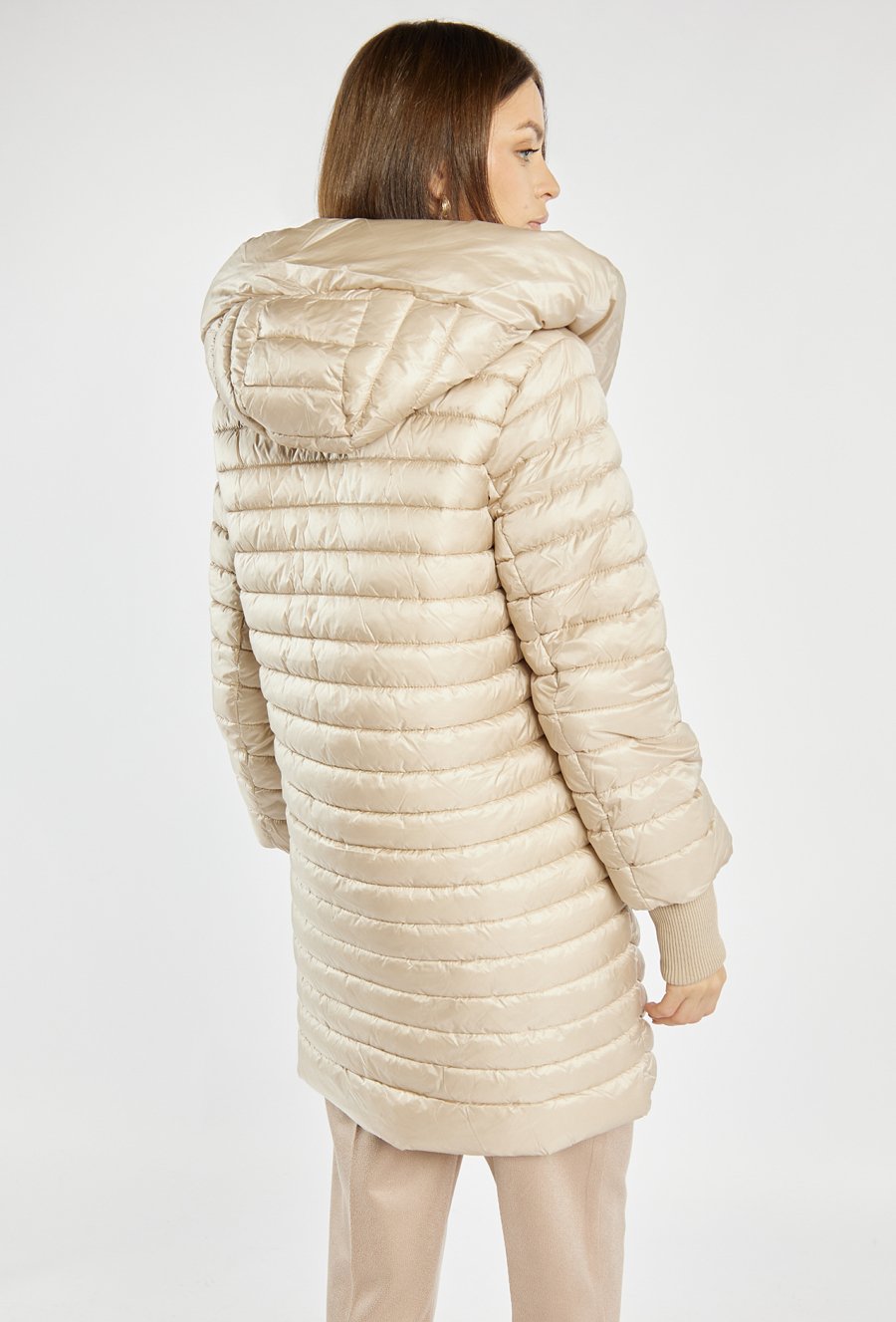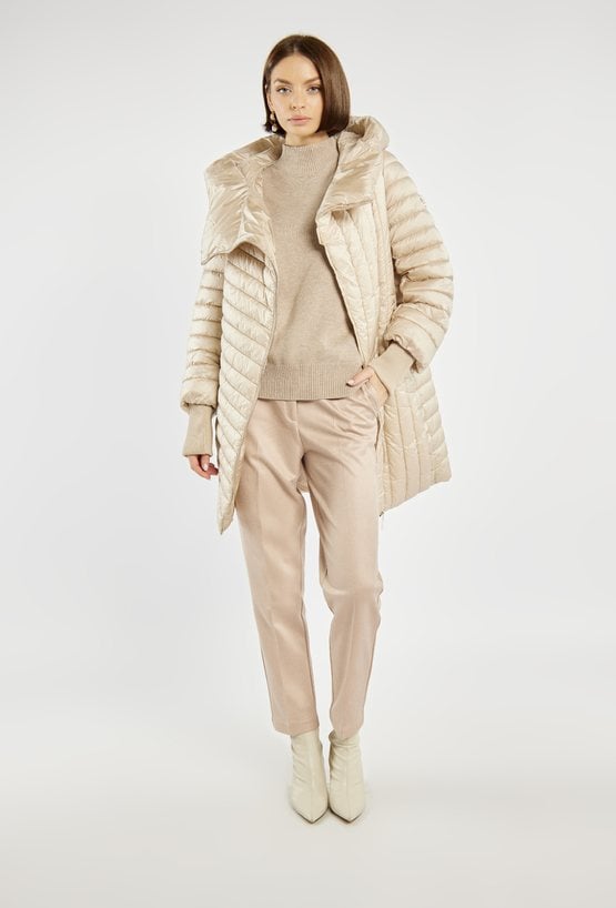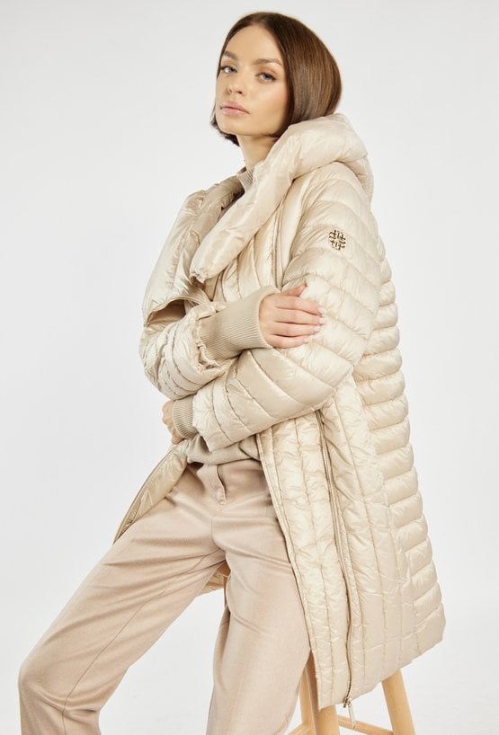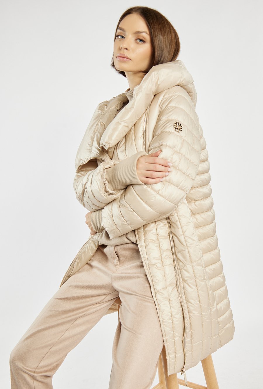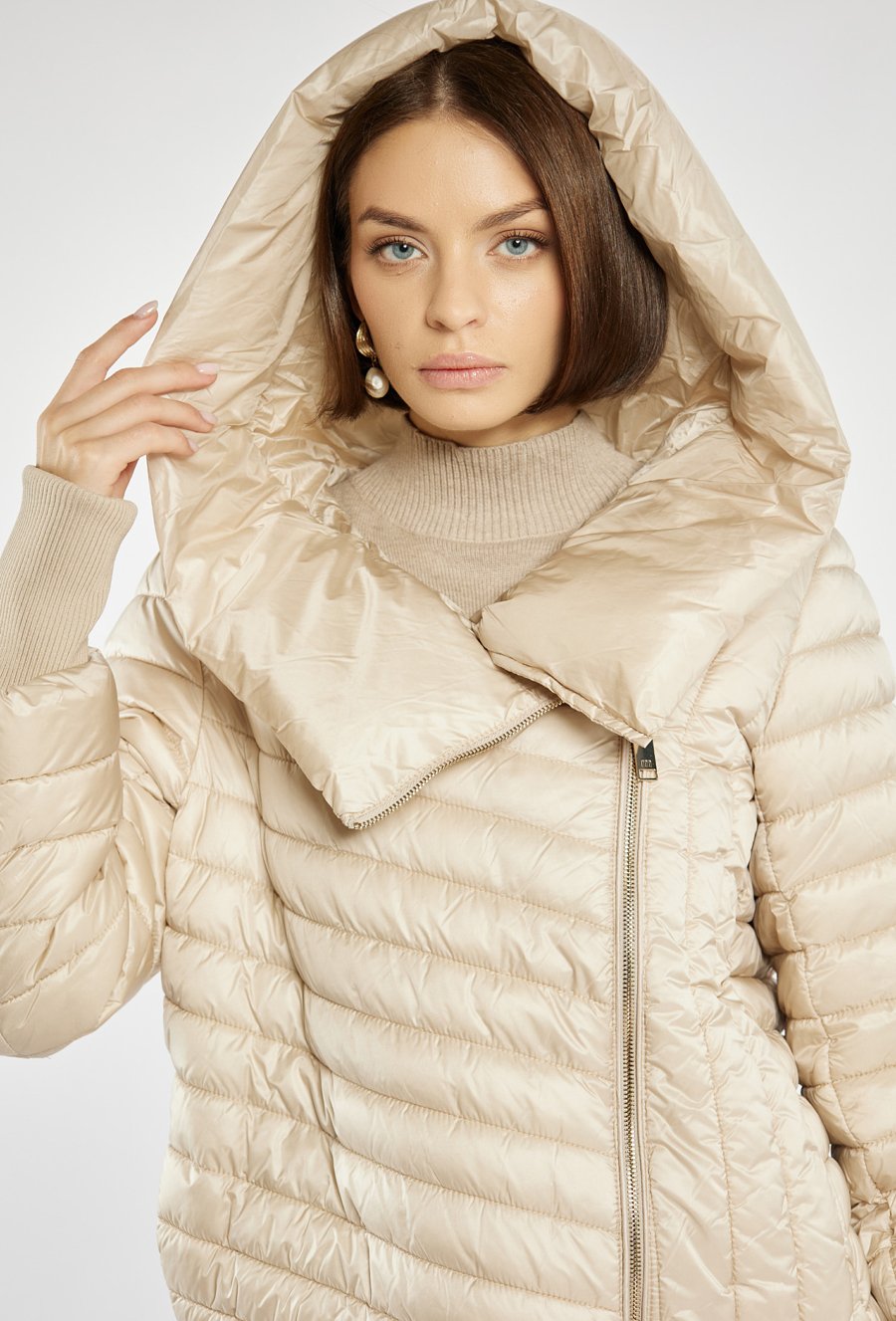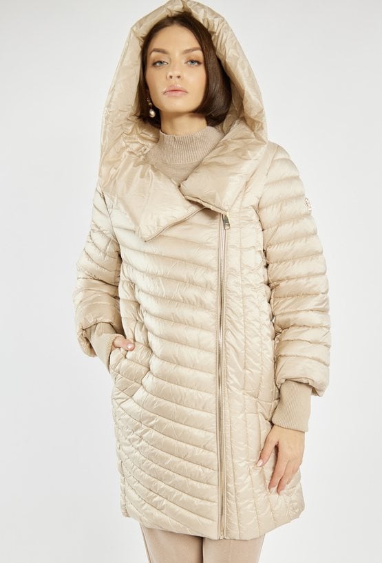 Pikowana kurtka damska z asymetrycznym zapięciem. Model o długości za biodra został wyposażony w obszerny, efektowny kołnierz, który po zapięciu tworzy przytulną stójkę, doskonale chroniącą przed chłodem. Kurtka z zapinanymi kieszeniami. Modelka na zdjęciu ma 177 cm wzrostu i prezentuje rozmiar 36.