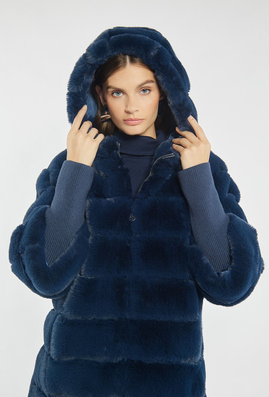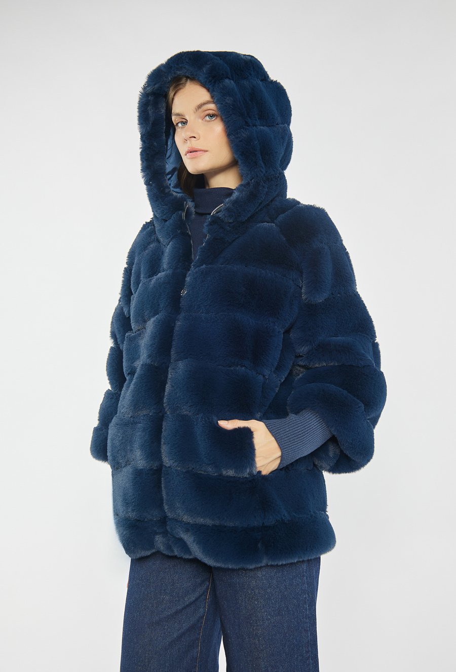 Kurtka z miękkiego, sztucznego futerka to efektowna propozycja na chłodniejsze dni. Kurtka z kapturem i zapięciem na napy przyciąga uwagę oryginalnym kolorem i puszystą fakturą. Idealna do miejskich i casualowych stylizacji. Modelka na zdjęciu ma 177 cm wzrostu i prezentuje rozmiar 36.