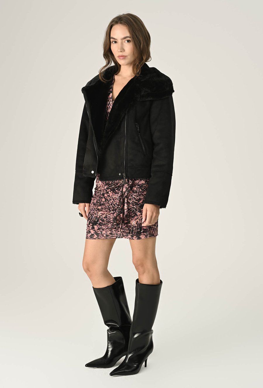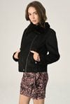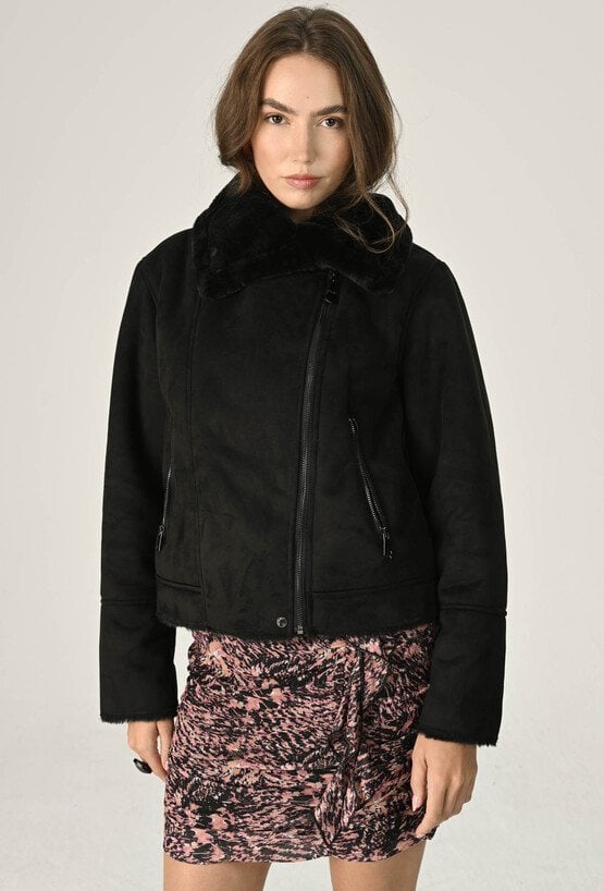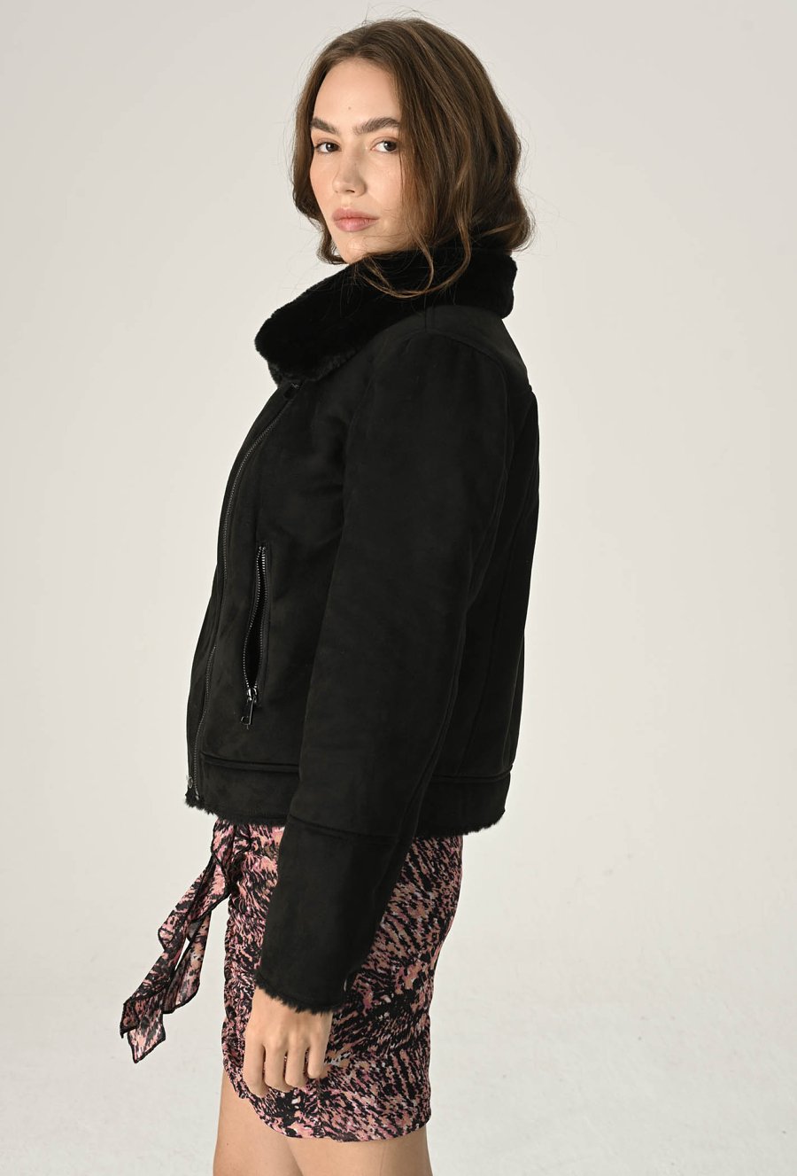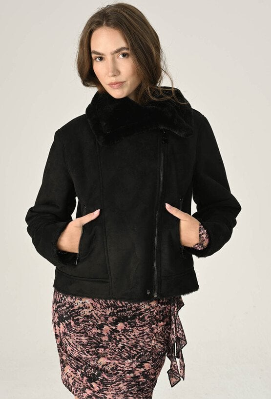 Krótki kożuch o nowoczesnym fasonie to idealny wybór na chłodniejsze dni. Miękkie, przyjemne w dotyku futerko od wewnątrz zapewnia komfort i ciepło, a futrzany kołnierz dodaje elegancji. Model zapinany na suwak, wyposażony w praktyczne, wsuwane kieszenie z bezpiecznym zapięciem – doskonały na co dzień i do miejskich stylizacji. Modelka na zdjęciu ma 174 cm wzrostu i prezentuje rozmiar 36.