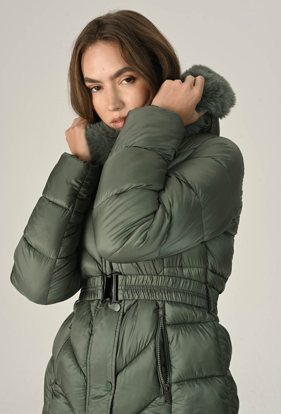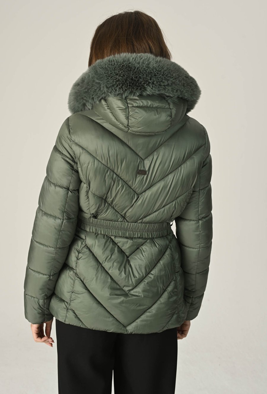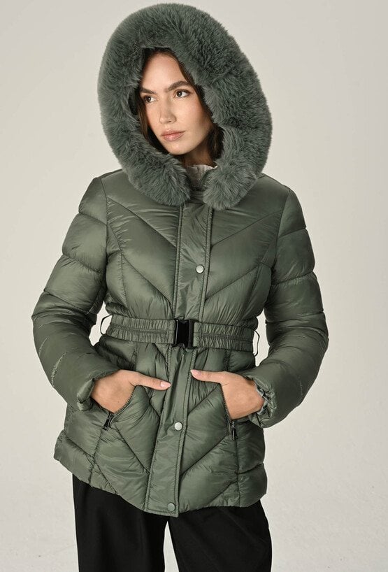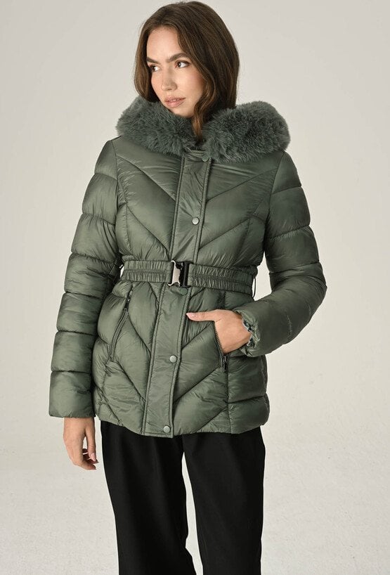 Stylowa kurtka z ociepleniem w odcieniu głębokiej zieleni to połączenie nowoczesnego designu i funkcjonalności. Pikowany fason z wyraźnym taliowaniem i paskiem pięknie podkreśla sylwetkę, a miękki kaptur obszyty futerkiem dodaje całości luksusowego charakteru. Zapięcie na suwak i napy zapewnia wygodę, a kieszenie z zamkami to praktyczny akcent na co dzień. Idealna propozycja na chłodne dni – ciepła, kobieca i wyjątkowo elegancka. Modelka na zdjęciu ma 173 cm wzrostu i prezentuje rozmiar 36.