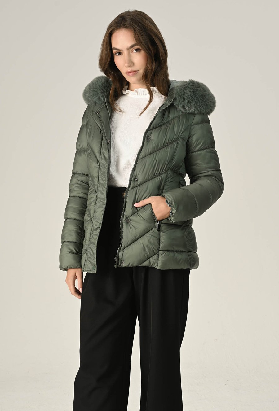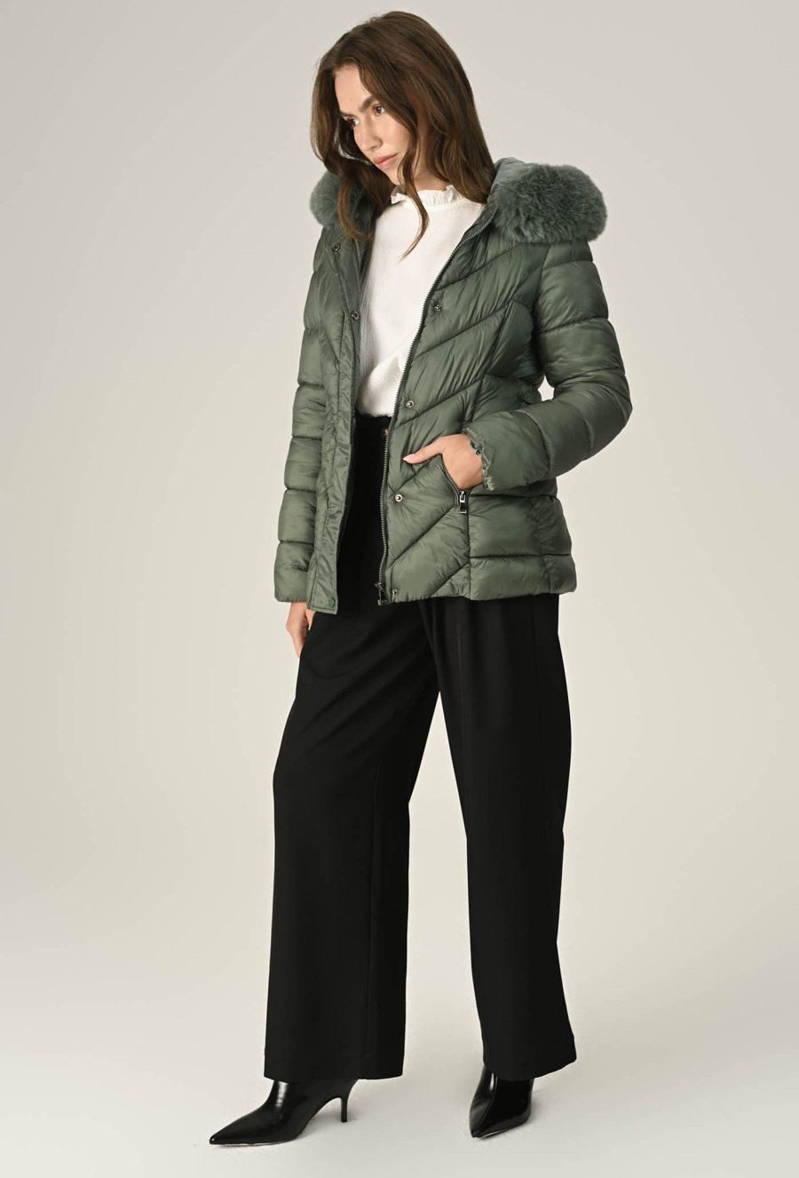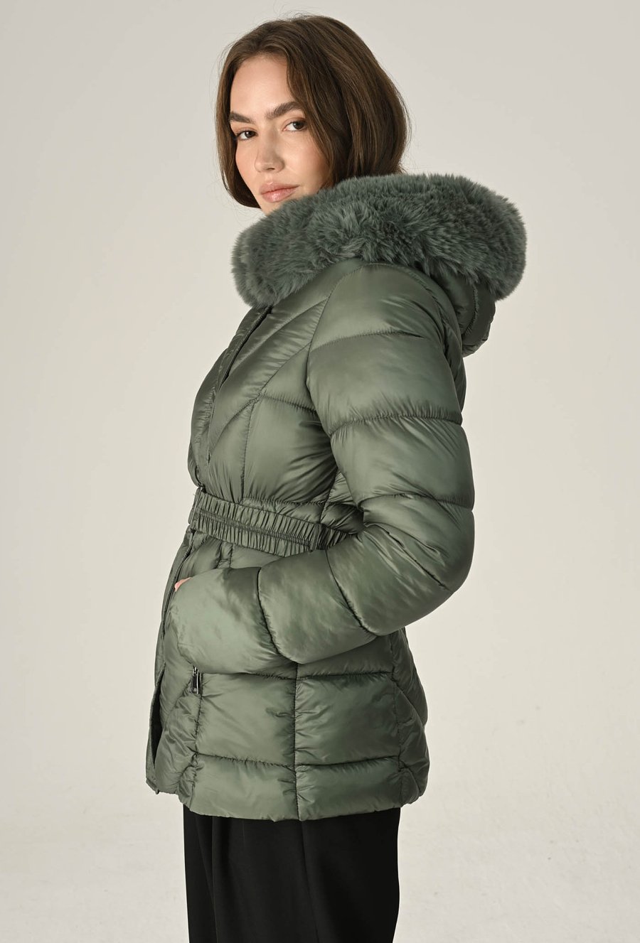 Stylowa kurtka z ociepleniem w odcieniu głębokiej zieleni to połączenie nowoczesnego designu i funkcjonalności. Pikowany fason z wyraźnym taliowaniem i paskiem pięknie podkreśla sylwetkę, a miękki kaptur obszyty futerkiem dodaje całości luksusowego charakteru. Zapięcie na suwak i napy zapewnia wygodę, a kieszenie z zamkami to praktyczny akcent na co dzień. Idealna propozycja na chłodne dni – ciepła, kobieca i wyjątkowo elegancka. Modelka na zdjęciu ma 173 cm wzrostu i prezentuje rozmiar 36.