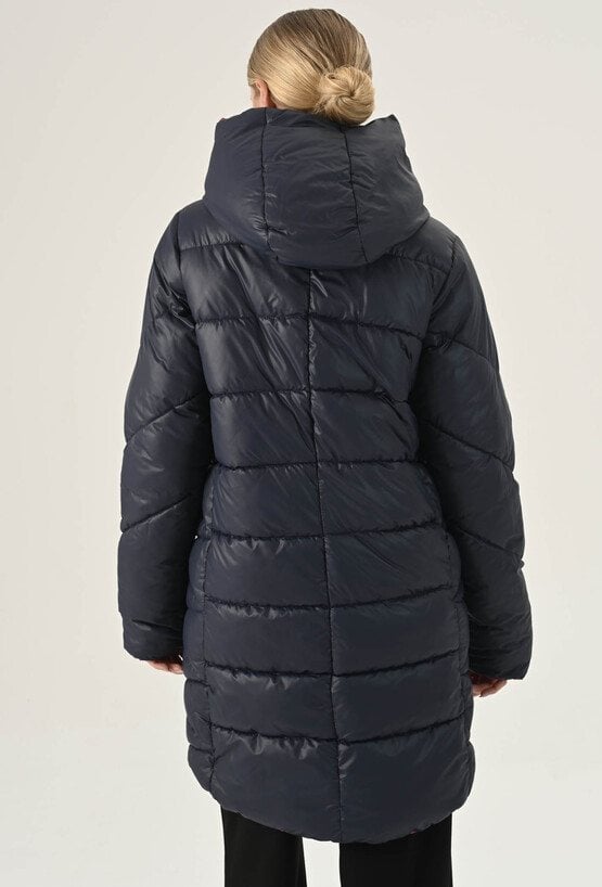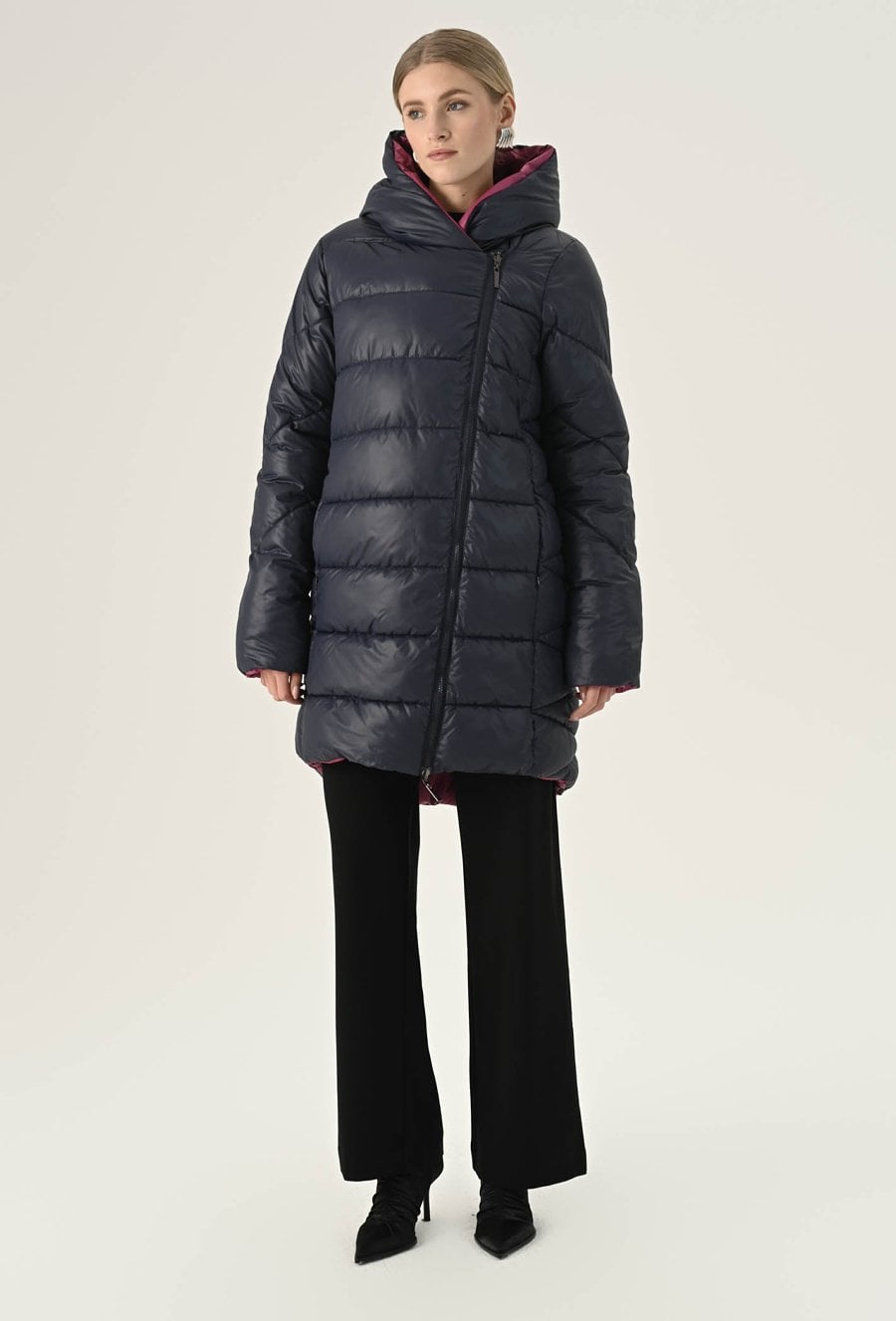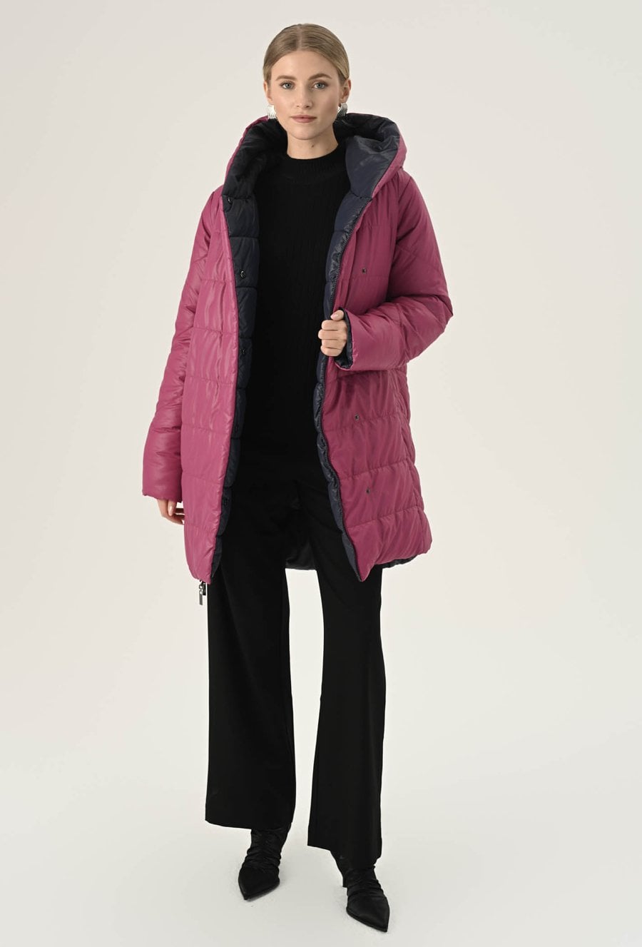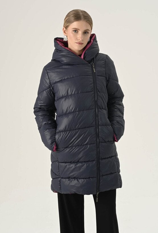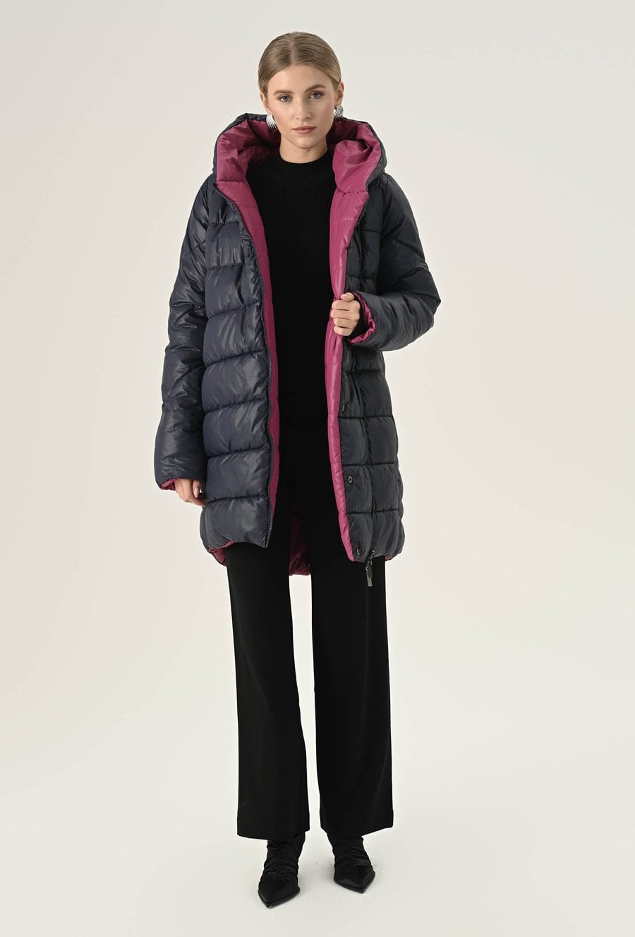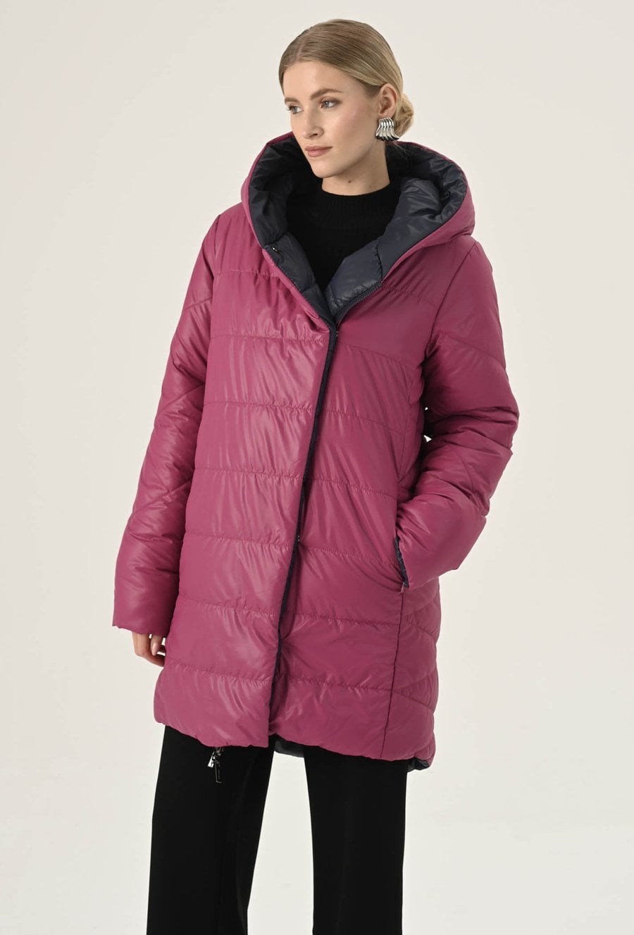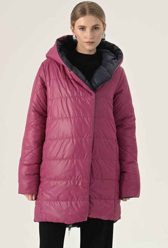 Dłuższa kurtka z pikowaniem oraz kapturem. Kurtkę można nosić dwustronnie jako grafitową lub różową . Posiada długie rękawami i wpuszczane kieszenie, Grafitowa strona na froncie kurtki zapinana jest na suwak natomiast różowa strona na froncie ma zatrzaski a suwak w środku. Model ten z pewnością dopełni codzienne, jesienne stylizacje. Modelka na zdjęciu ma 177 cm wzrostu i prezentuje rozmiar 36.