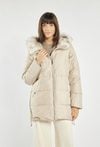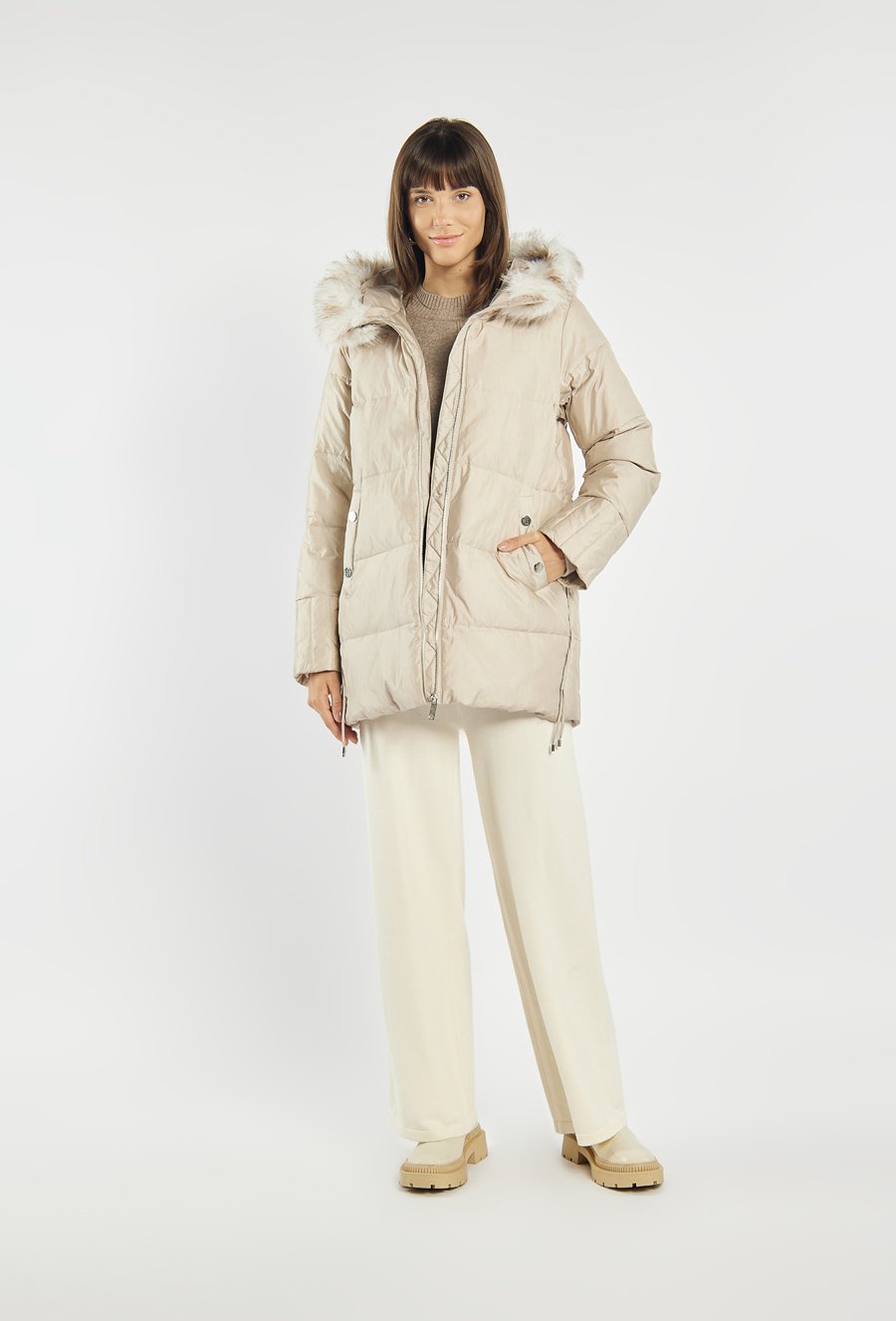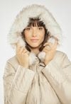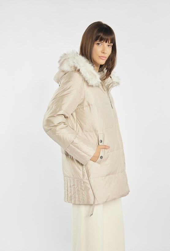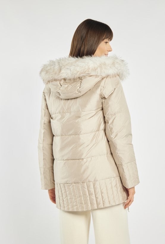 Pikowana kurtka o klasycznej długości i kobiecym fasonie, idealna na chłodniejsze dni. Kurtka z wygodnym kapturem wykończonym odpinanym futerkiem, które dodaje całości szyku. Praktyczne kieszenie zapinane na napy. Neutralny, jasny odcień sprawdzi się w wielu zimowych stylizacjach. Modelka na zdjęciu ma 177 cm wzrostu i prezentuje rozmiar 36.