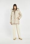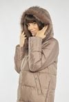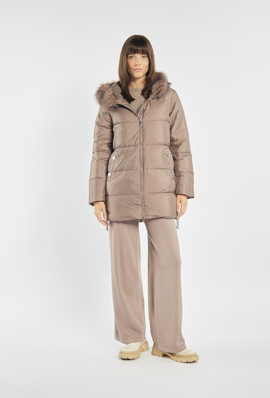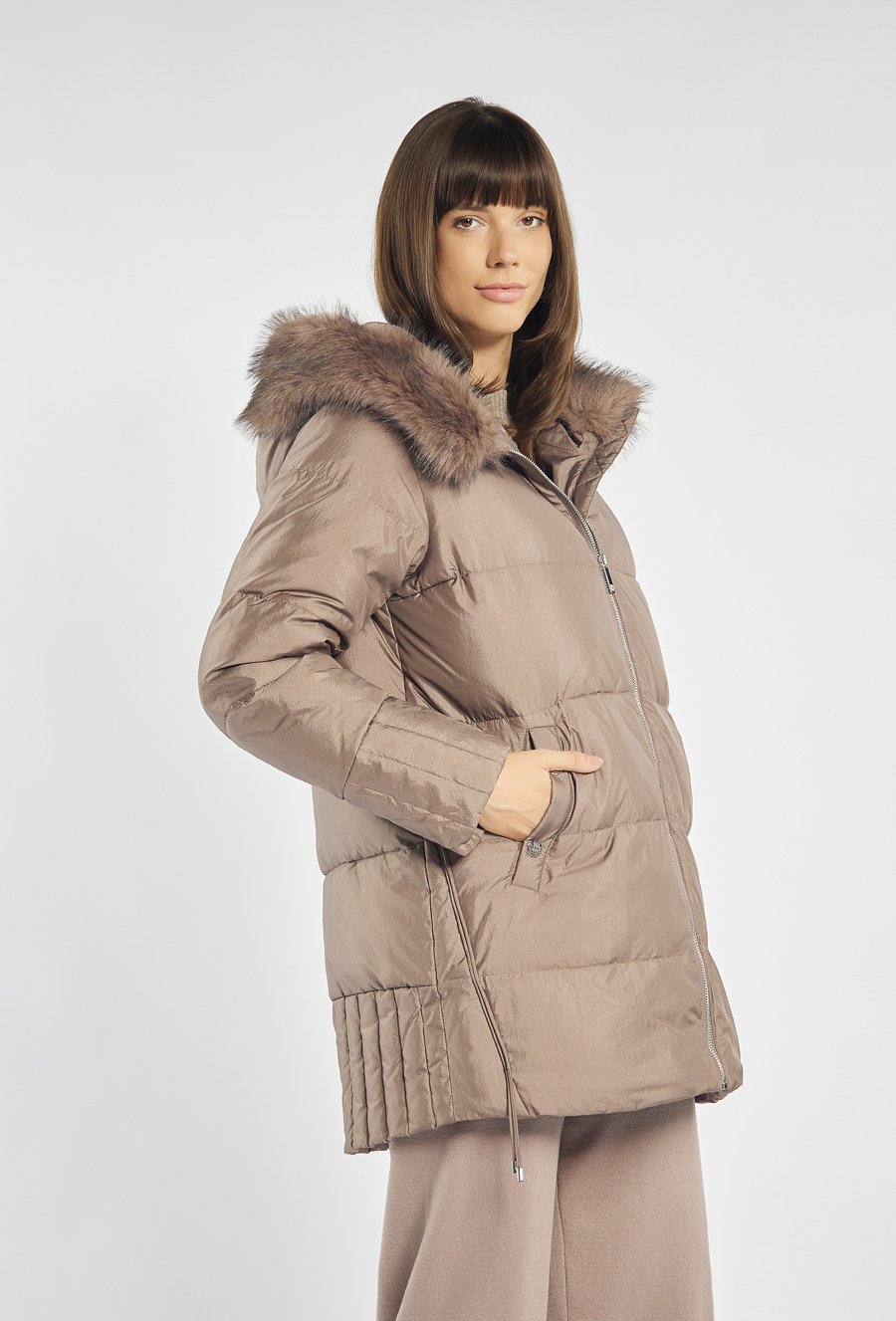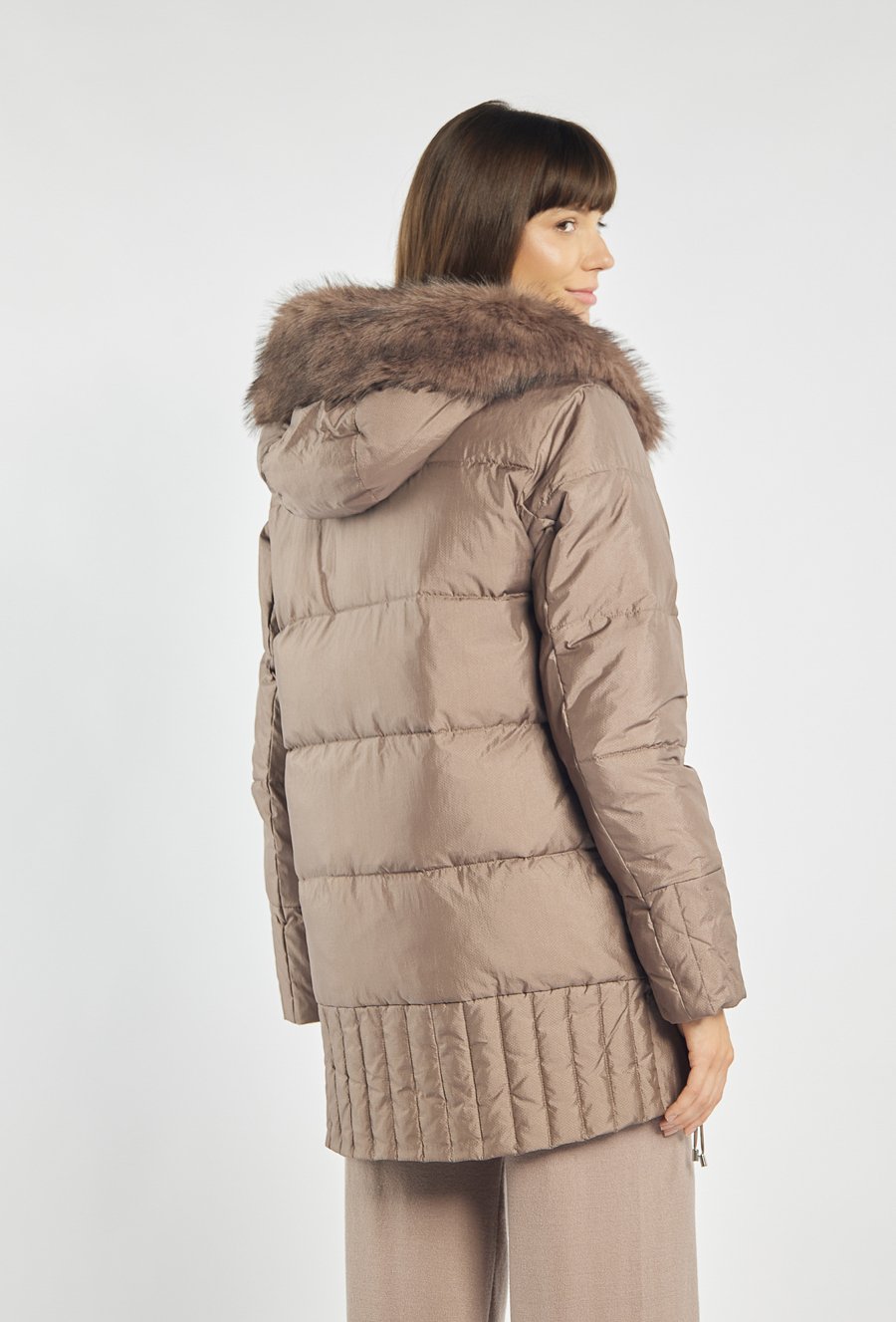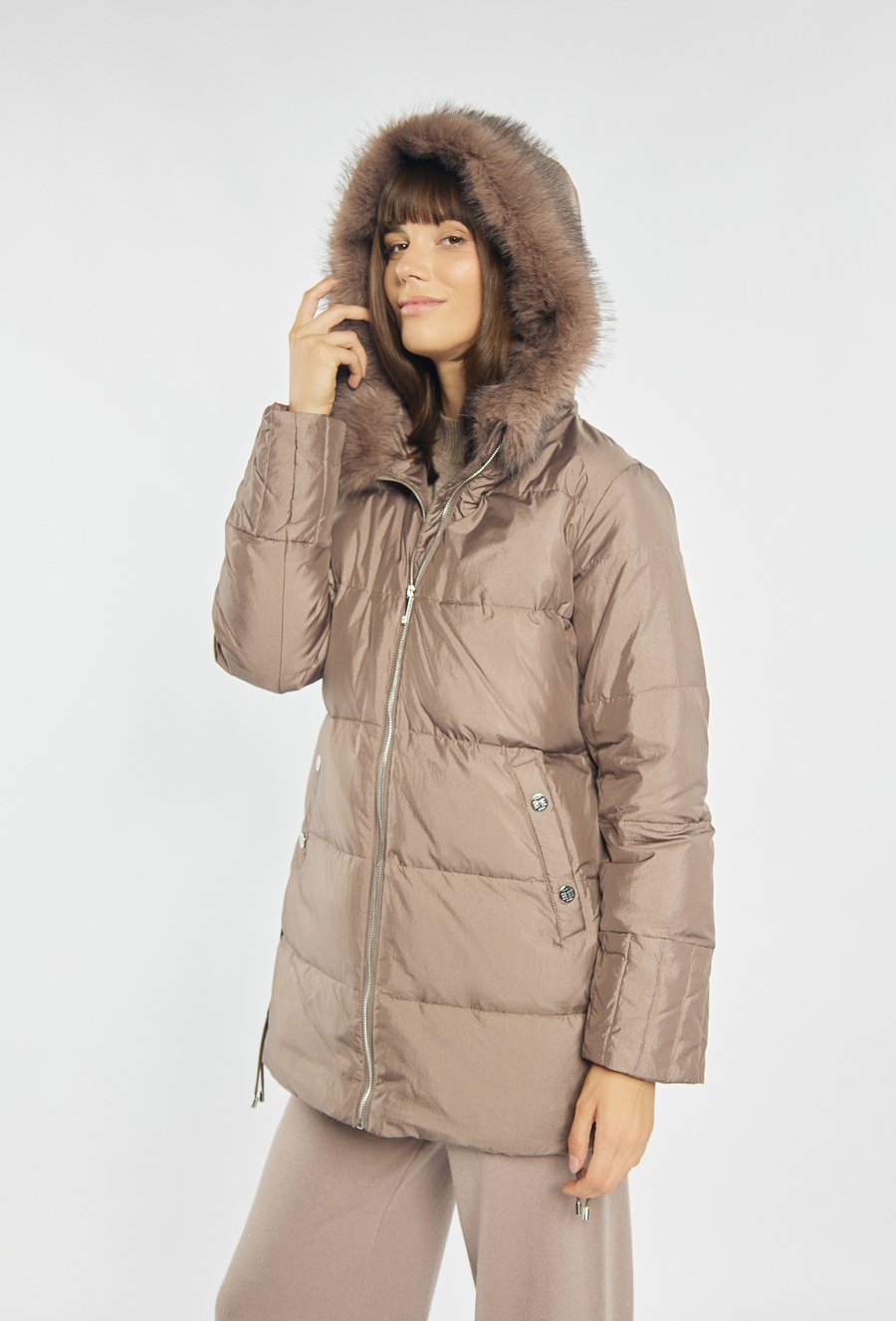 Pikowana kurtka o klasycznej długości i kobiecym fasonie, idealna na chłodniejsze dni. Kurtka z wygodnym kapturem wykończonym odpinanym futerkiem, które dodaje całości szyku. Praktyczne kieszenie zapinane na napy. Neutralny, jasny odcień sprawdzi się w wielu zimowych stylizacjach. Modelka na zdjęciu ma 177 cm wzrostu i prezentuje rozmiar 36.