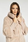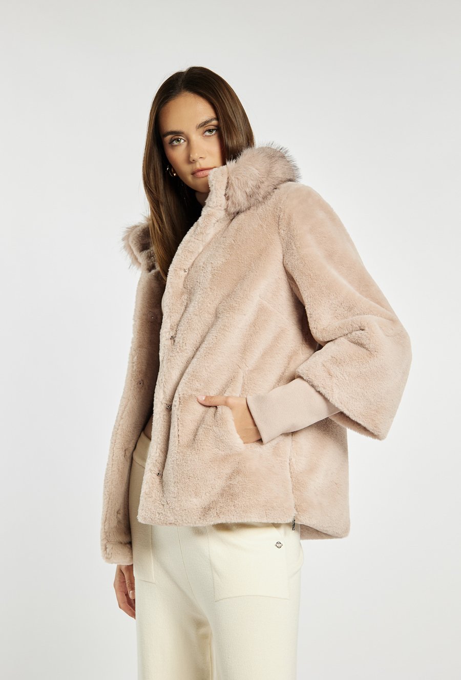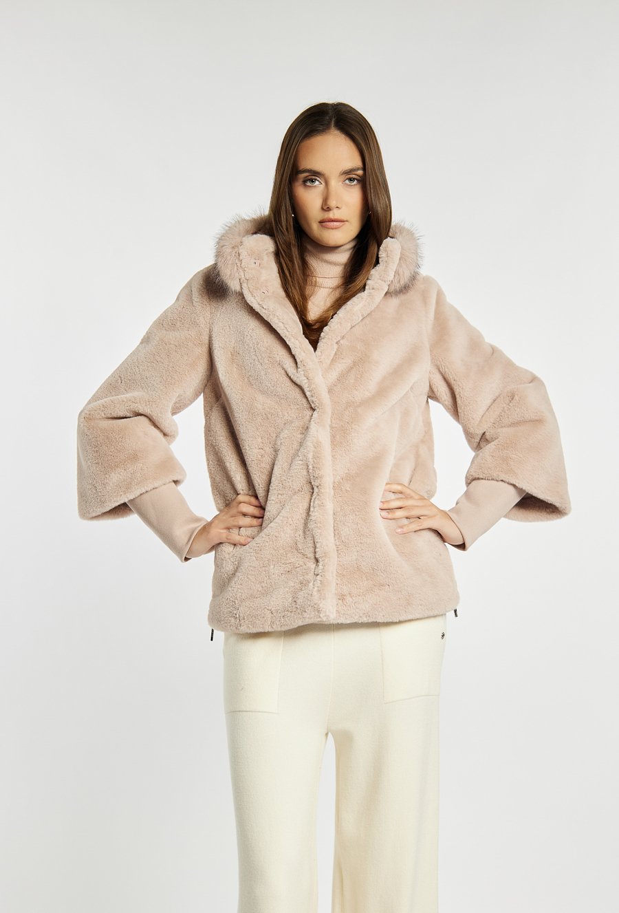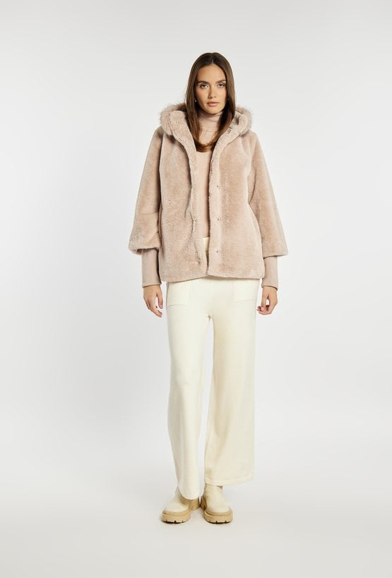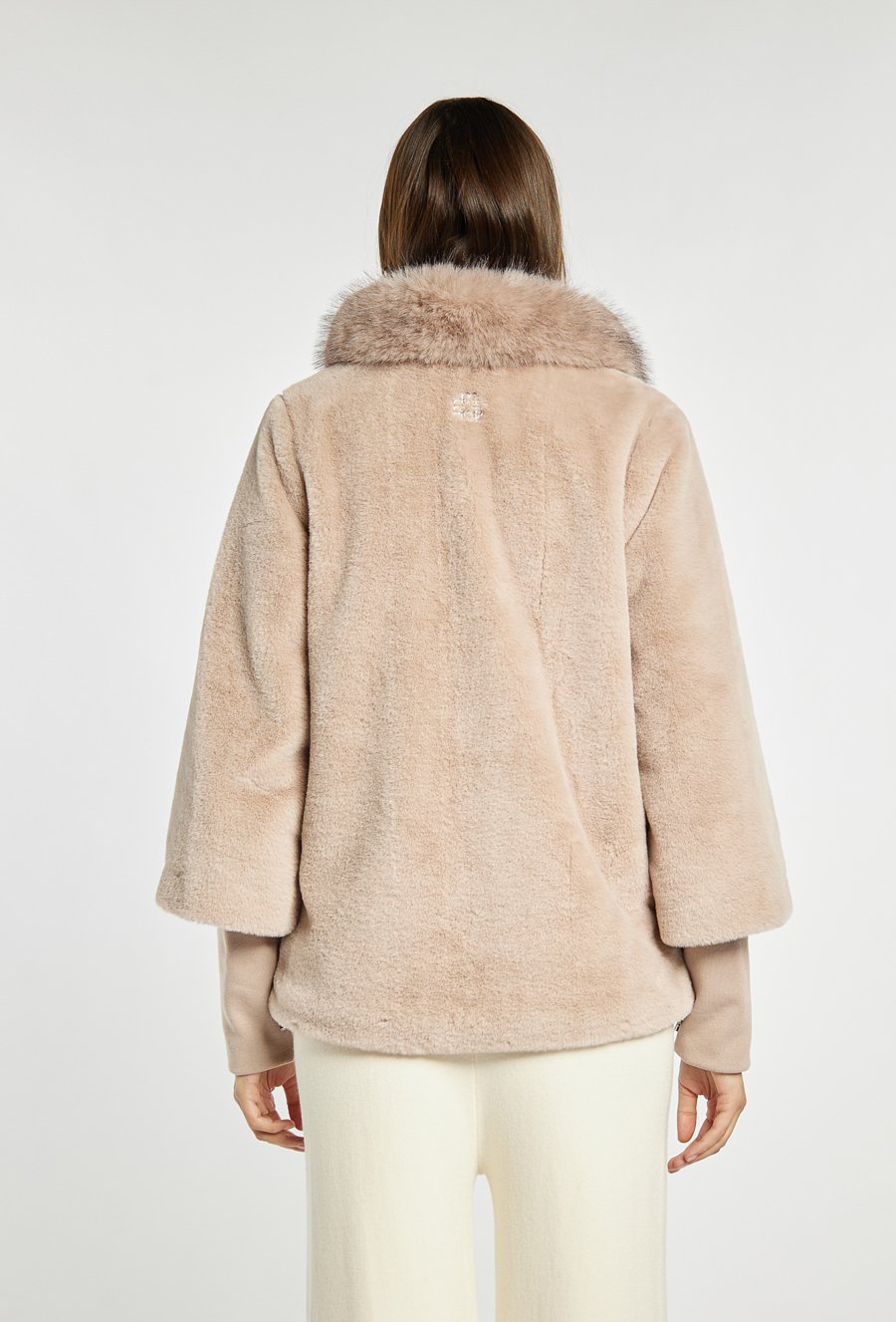 Stylowa kurtka damska typu futerko. Model o luźnym kroju z miękkiego, przyjemnego w dotyku materiału, który zapewnia komfort i elegancki wygląd. Modelka na zdjęciu ma 177 cm wzrostu i prezentuje rozmiar 36.