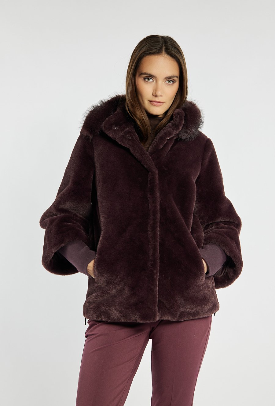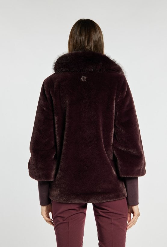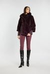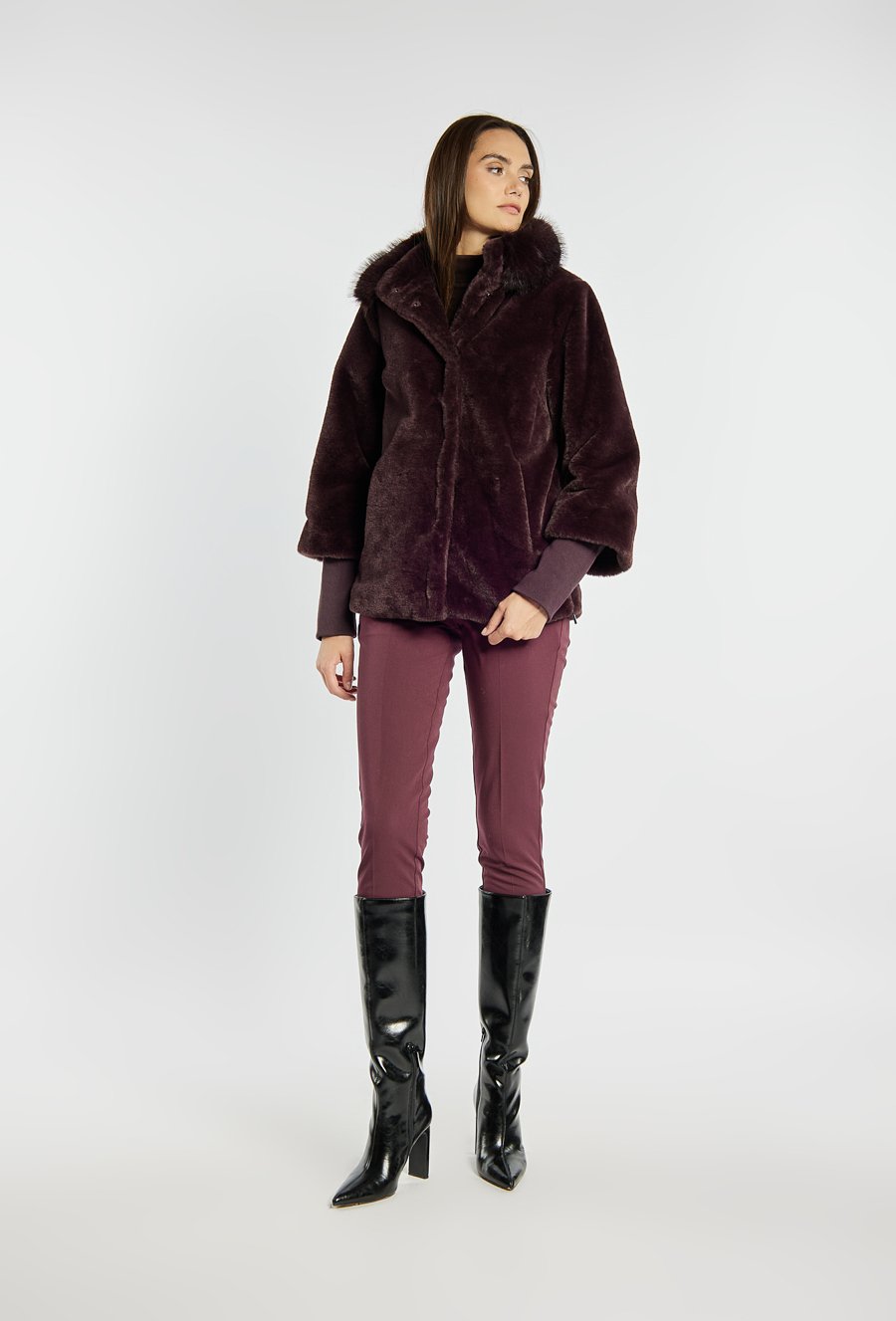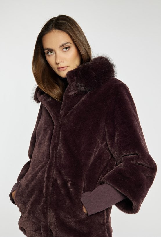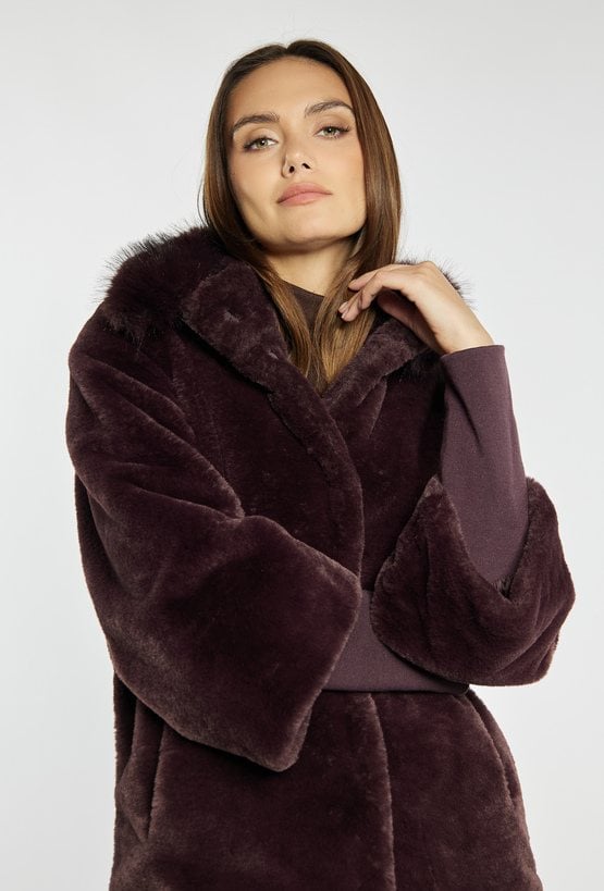 Stylowa kurtka damska typu futerko. Model o luźnym kroju z miękkiego, przyjemnego w dotyku materiału, który zapewnia komfort i elegancki wygląd. Modelka na zdjęciu ma 177 cm wzrostu i prezentuje rozmiar 36.